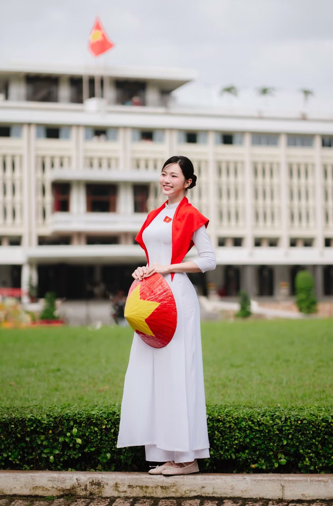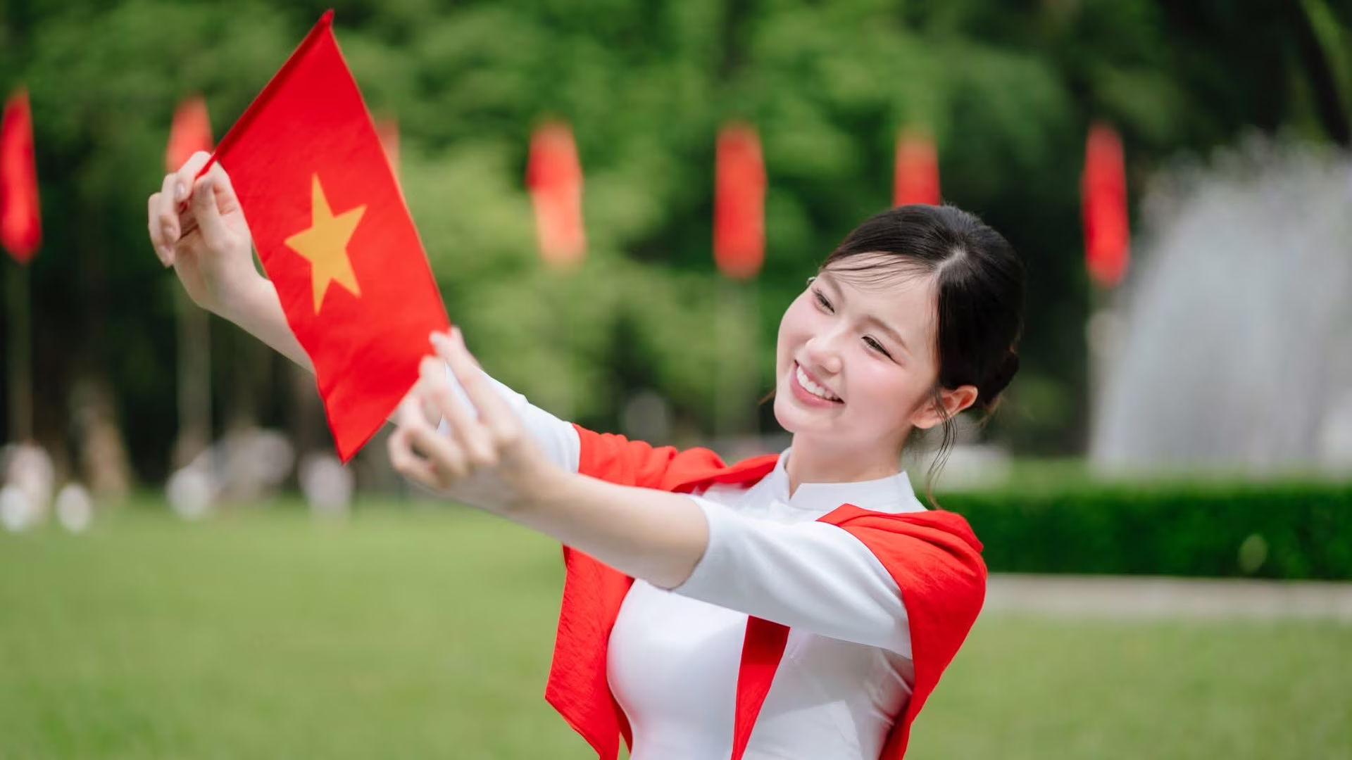 This stunning VGU No102 image captures a graceful Vietnamese girl in a pristine white Ao Dai exuding elegance and serenity She wears a vibrant red cape adorned with a yellow star symbolizing Vietnam's national flag and holds a small flag in her hand showcasing intense national pride Her radiant smile and forward gaze against the lush green lawn and ancient architecture evoke the spirit of a passionate and patriotic young generation This scene beautifully blends tradition with modernity inner beauty with love for the homeland a memorable moment honoring Vietnamese culture and its people #Vietnamese #pretty #charmVGU No.88: Captivating Elegance A Young Woman's Gentle Beauty with a Lotus Bouquet