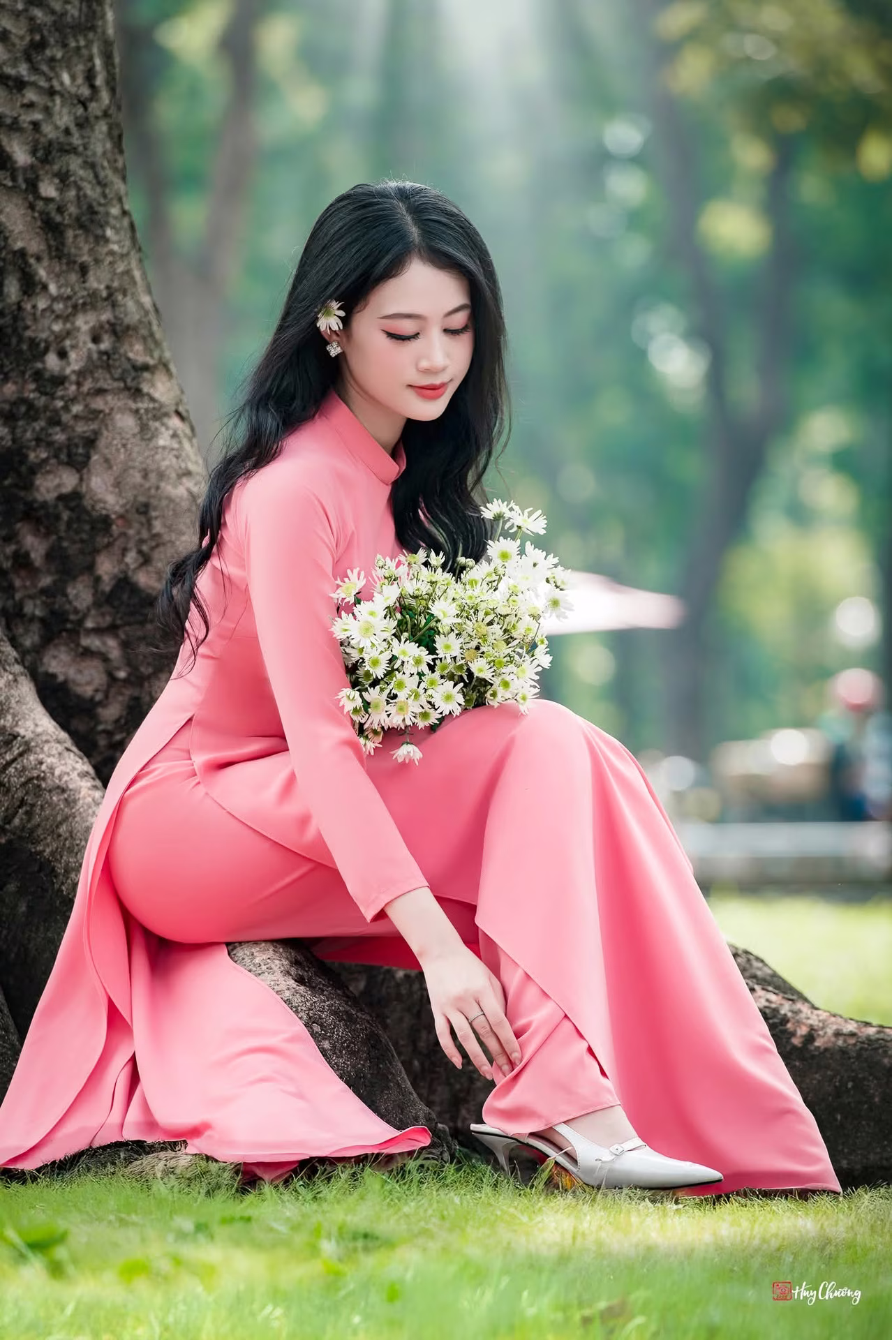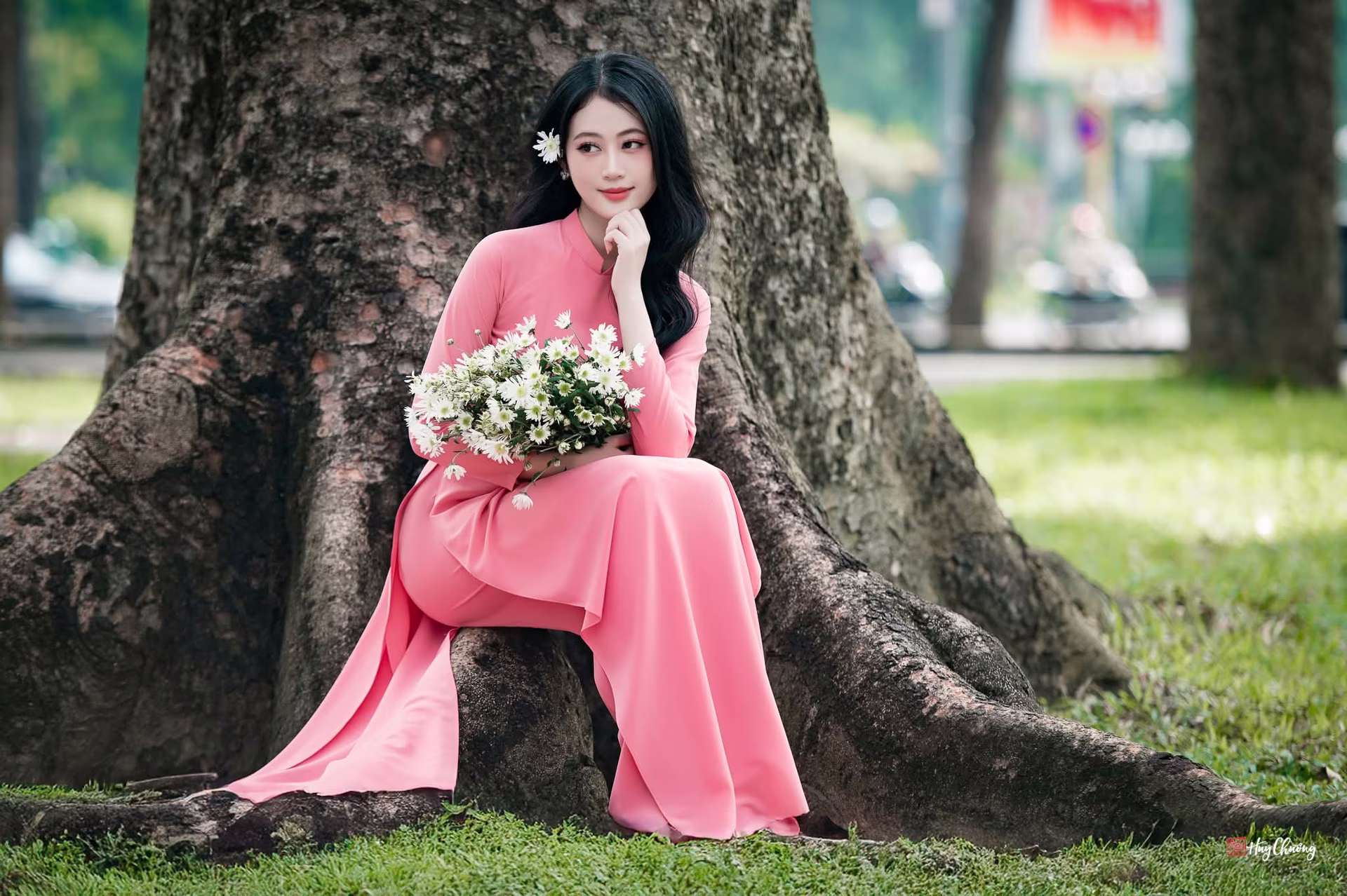 This captivating image VGU No.59 portrays a Vietnamese woman exuding elegant and graceful beauty, seated serenely by a tranquil lake. Her delicate backless cream-colored dress subtly highlights her refined allure and slender shoulders. Her neatly tied-up hair and pensive gaze towards the water create an image filled with contemplation and romance. Prominently held in her hand is a vibrant bouquet of red roses, symbolizing love and passion, further enhancing the charm of the entire scene. This peaceful moment captures the gentle and profound beauty of the Vietnamese woman, set against the serene backdrop of nature. #Vietnamese #pretty #charmVGU No.49: Vietnamese Grace: Lady in Pink Ao Dai with Pure White Flowers