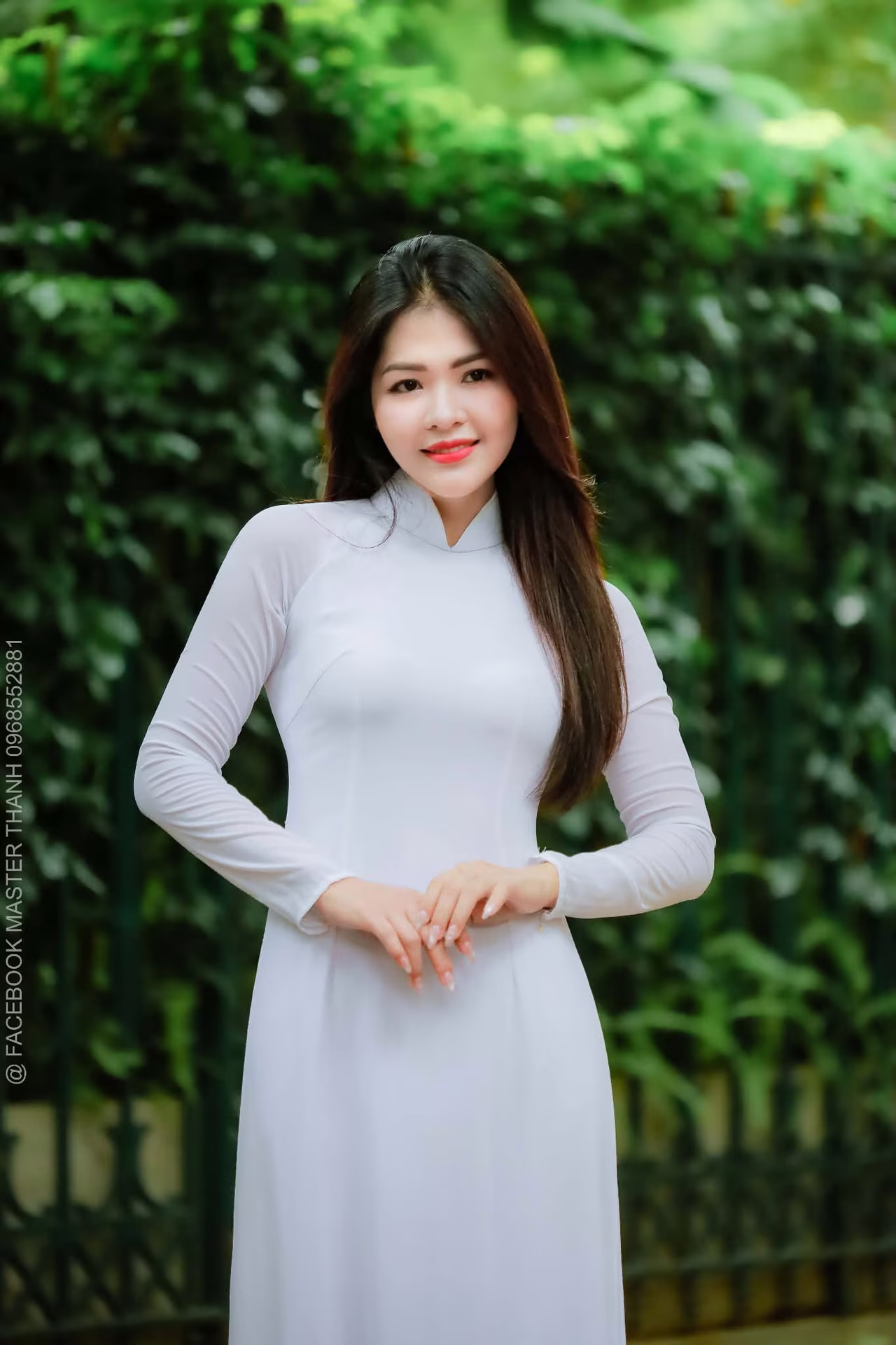 In this captivating image, a Vietnamese young woman graces us with her presence in a pristine white Ao Dai, symbolizing purity and the timeless traditional beauty of Vietnam. Her long, flowing hair and gentle, captivating smile exude an irresistible charm and elegance. The fitted Ao Dai gracefully accentuates her slender, lithe figure, making her the luminous focal point against a lush green foliage backdrop. This photograph not only captures a beautiful moment but also profoundly portrays the cultural essence and spirit of Vietnamese women, who embody nobility, modesty, vibrancy, and captivating allure. It stands as a proud symbol of national identity, a beauty that transcends time. #Vietnamese #pretty #charmVGU No.70: Captivating East Asian Beauty in Traditional Attire with a Radiant Smile