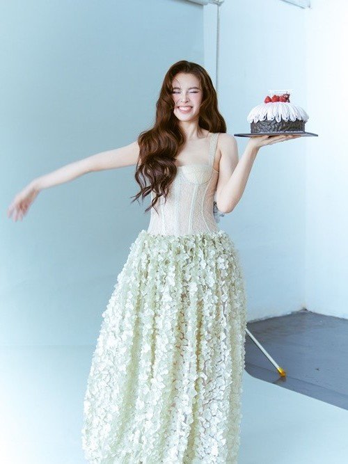 This image captures a graceful moment of Miss Tieu Vy as she radiantly celebrates her new age. With a golden ratio face often praised as perfect Tieu Vy skillfully displays her captivating features and deep expressive eyes. The small elegant birthday cake placed in front of her is a sweet highlight symbolizing a promising new beginning. Her voluminous hair and natural makeup further enhance the natural alluring beauty of the former Miss Vietnam. This is not merely a birthday photo but also a statement about her peak beauty maturity and continuous charm in the public eye. Tieu Vy's beauty consistently leaves a strong impression with every appearance. She is a beauty icon admired by many.Stories