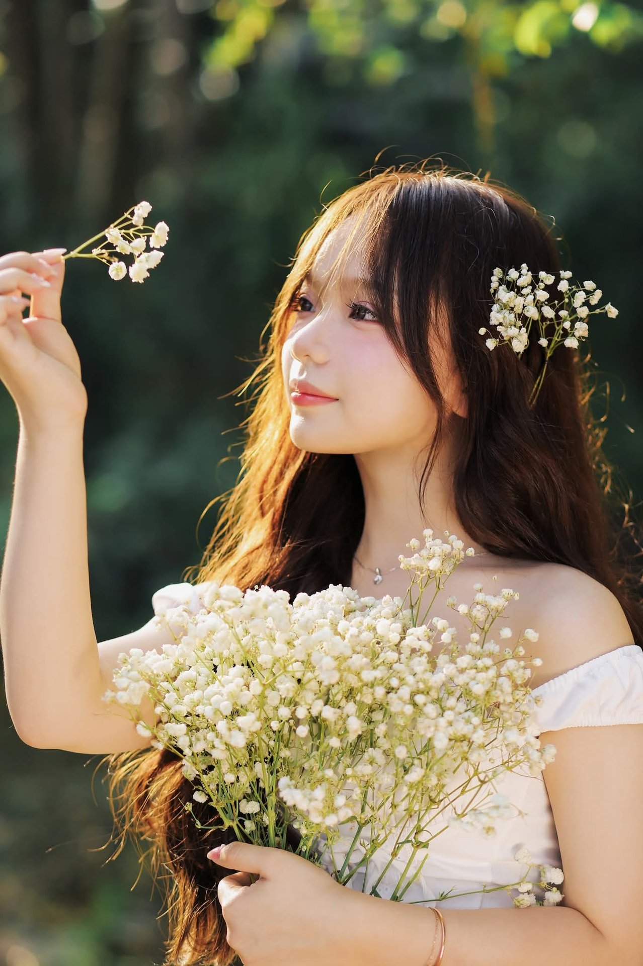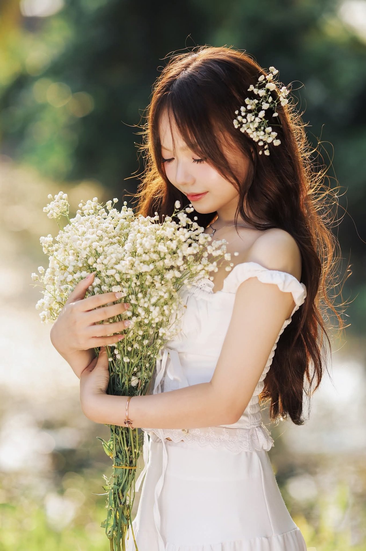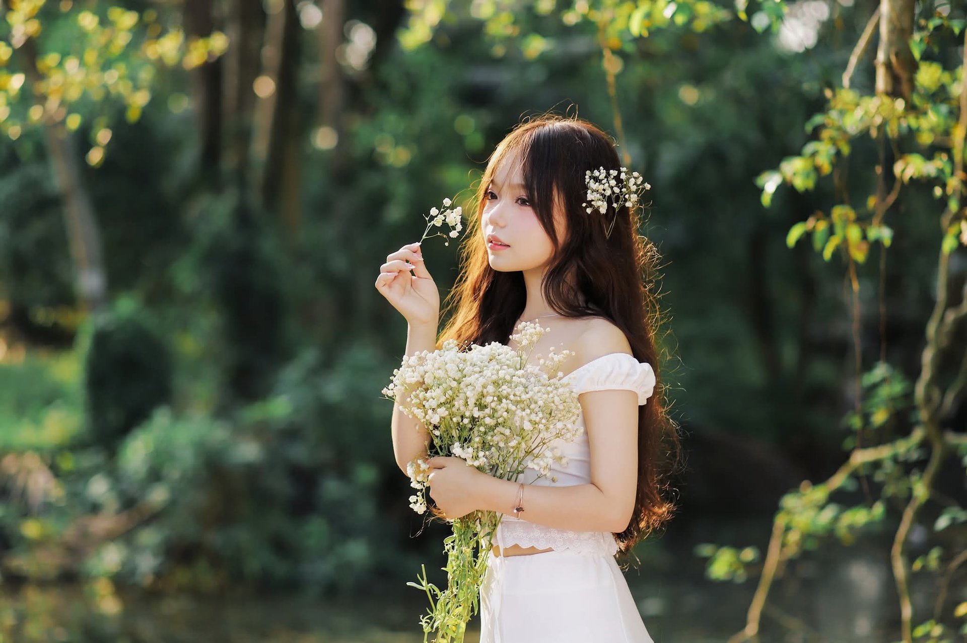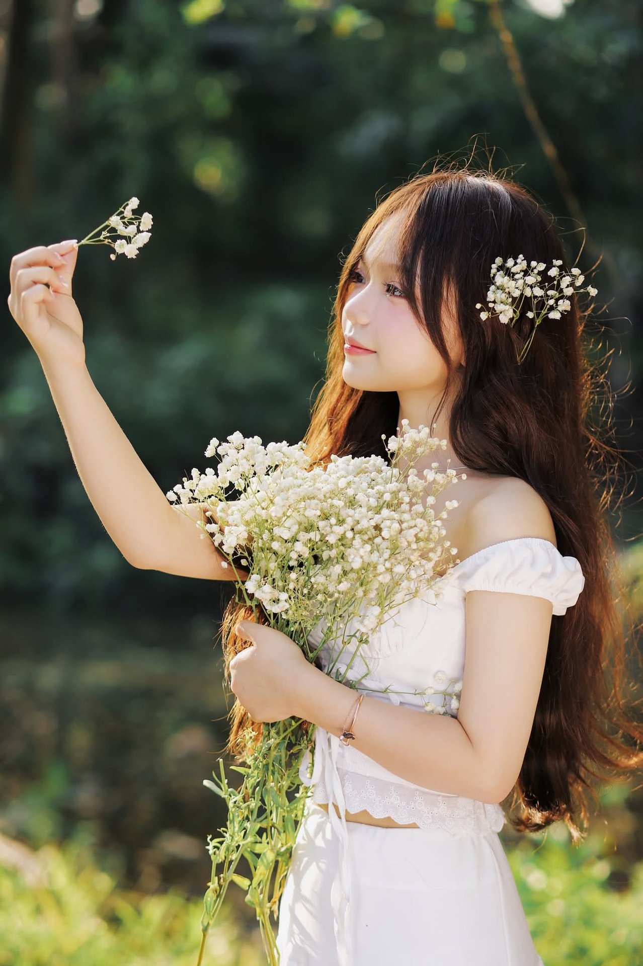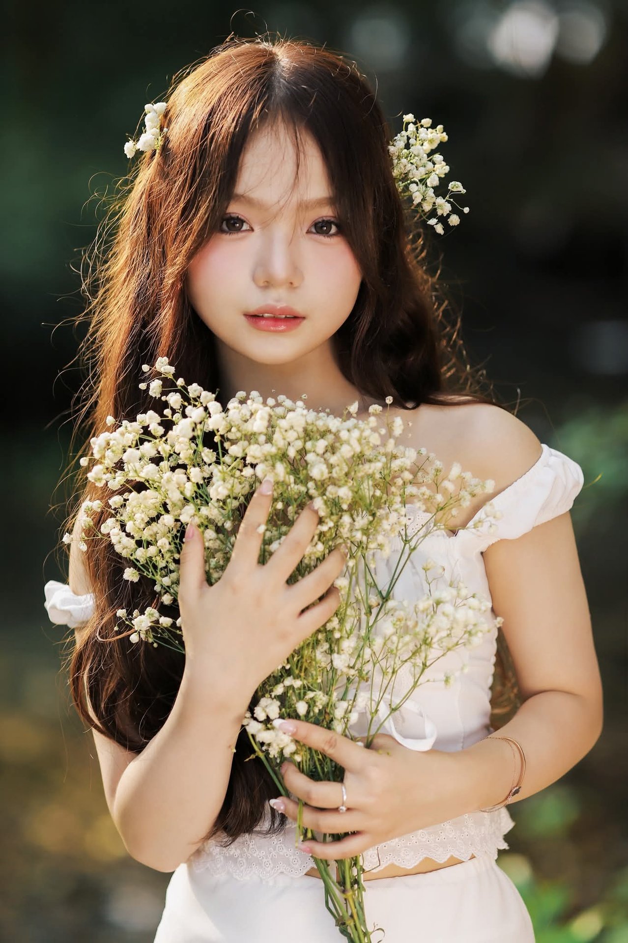 The image 1000019515.jpg depicts a portrait of a young girl with innocent and gentle beauty. She wears a pristine white outfit, blending into the lush green natural scenery. Her long flowing hair is adorned with tiny white flowers, creating a poetic and pure look. The girl's eyes exude innocence, her direct gaze into the camera is captivating. Prominently in her hands is a large bouquet of white flowers, symbolizing purity and elegance. Soft golden sunlight filters through the leaves, highlighting her delicate features and fair skin. This image represents natural beauty, unpretentious yet incredibly charming, evoking a sense of peace and romance.Graceful Vietnamese Girl in Pristine White Ao Dai: Timeless Beauty.
