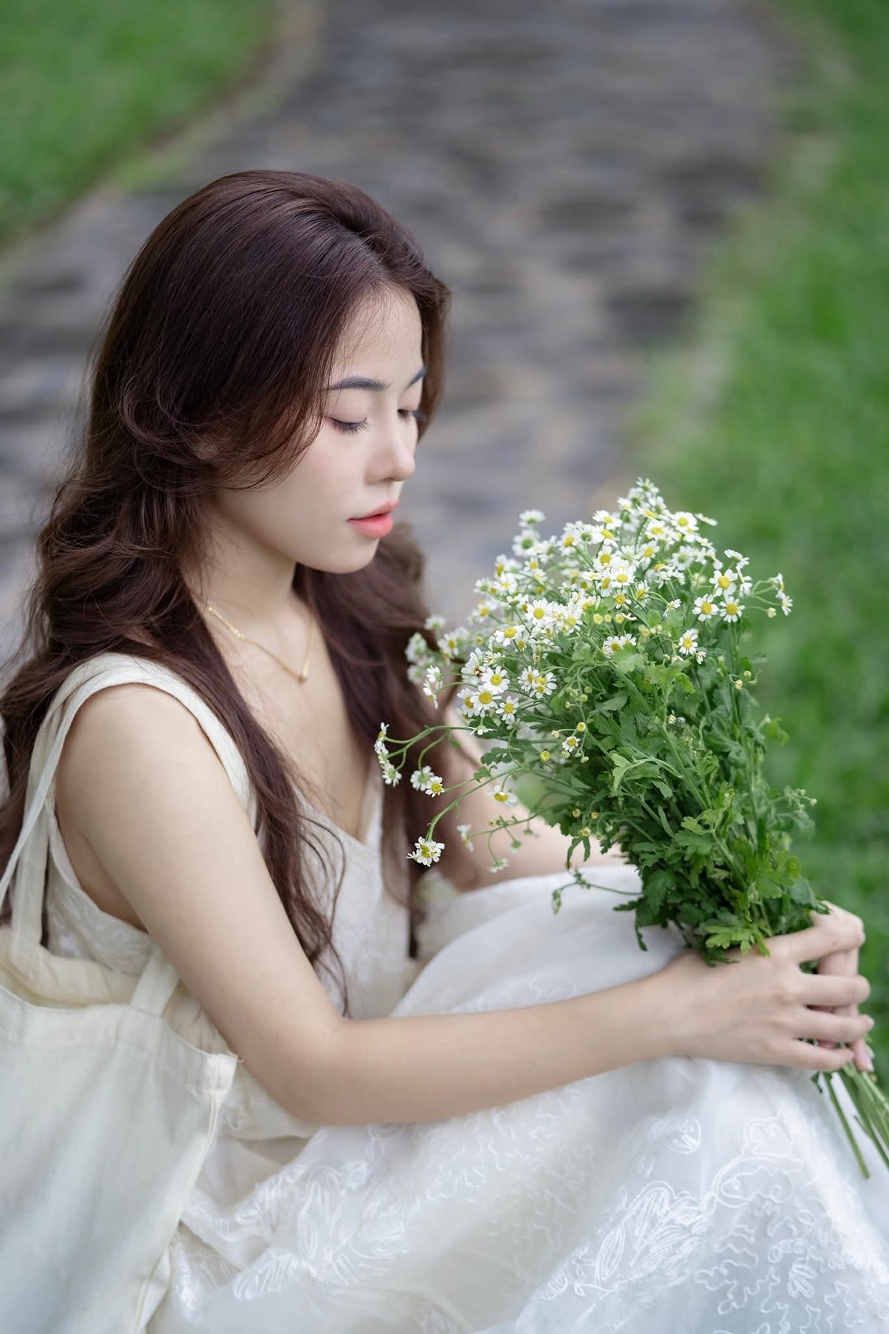 The XVG No.9 image captures a young woman with a pure and gentle beauty she possesses long flowing hair and fair skin her softly closed eyes exude peace and a dreamy contemplation as if lost in thought she delicately holds a bouquet of pristine white daisies symbolizing innocence and purity the lush green natural background accentuates her natural charm this is a tranquil and emotional moment offering viewers a sense of relaxation and serenity the beauty of this muse blends perfectly with the green space creating a perfect picture of harmony between humanity and nature her captivating beauty touches the soulXVG No.4: Graceful Vietnamese Ao Dai Beauty by the River - Captivating Traditional Elegance