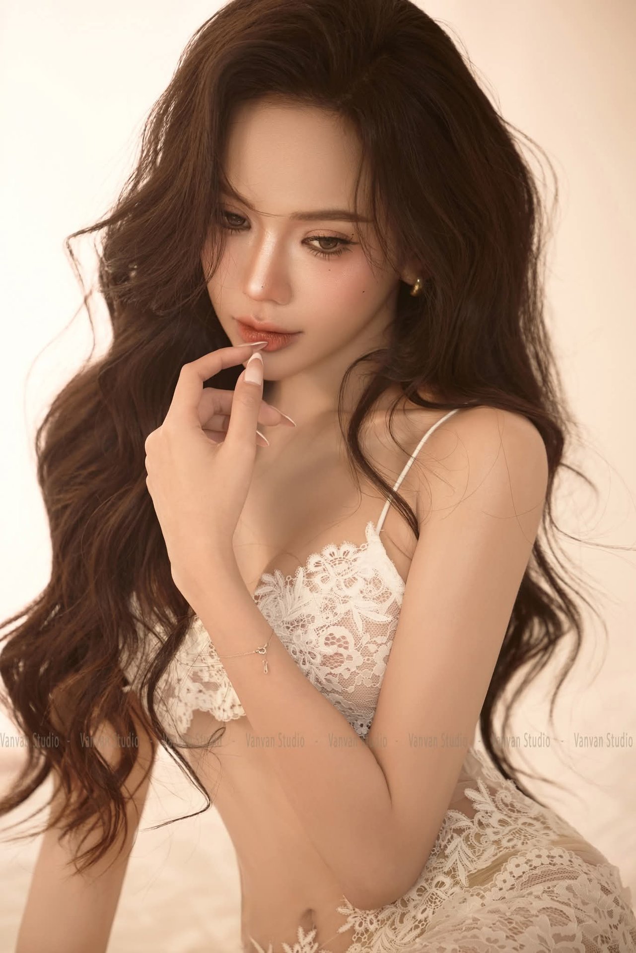 This stunning photograph captures a captivating young model in delicate white lingerie. She sits gracefully on a soft bed her long flowing hair adding to her allure. Soft lighting envelops the scene highlighting her smooth skin and elegant features. The white lace lingerie is not only sensual but also exudes purity creating a harmonious blend of refined beauty and irresistible charm. This image represents high-end lingerie fashion showcasing the confidence and sensual beauty of modern women. It is a moment filled with emotion and artistry