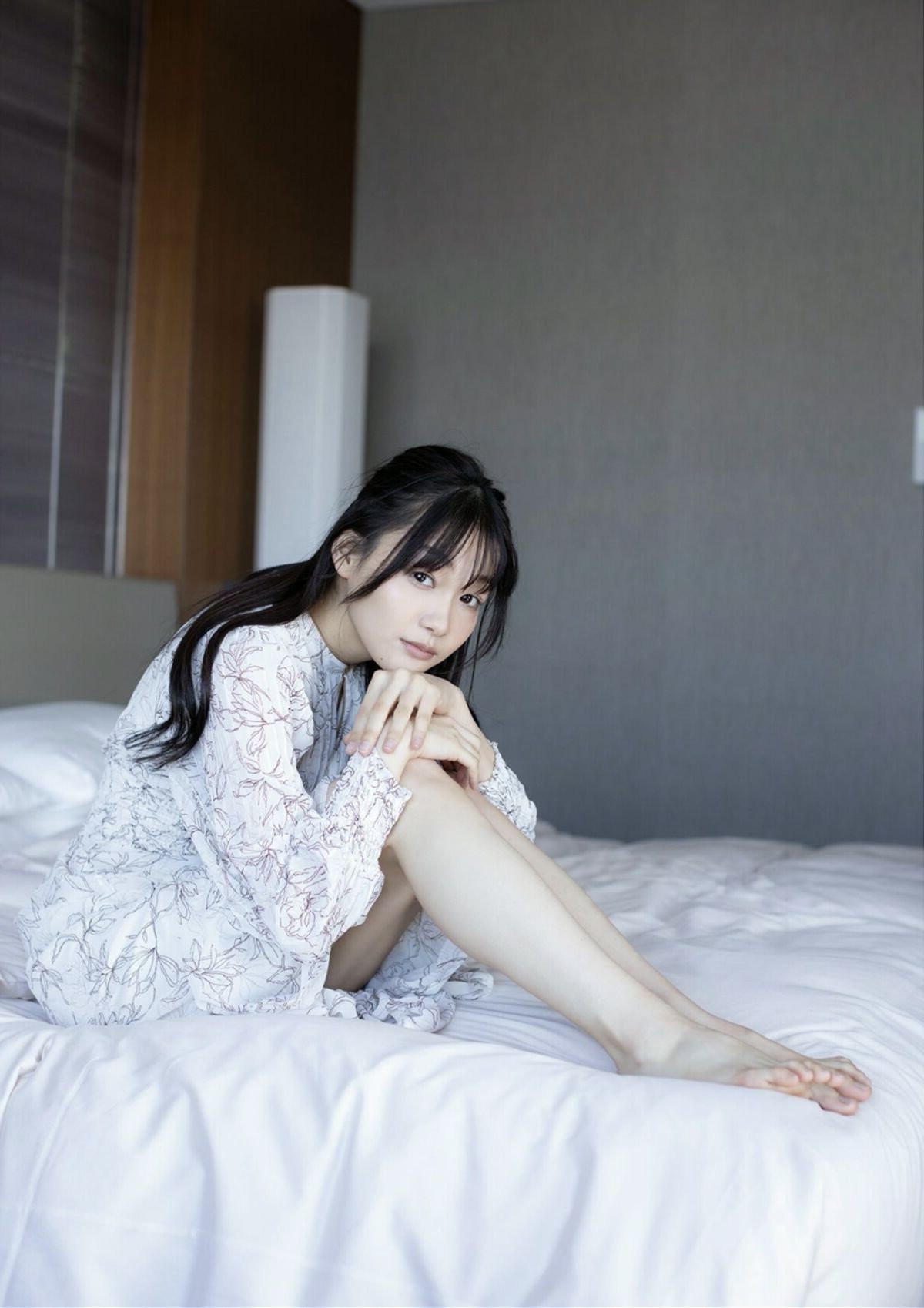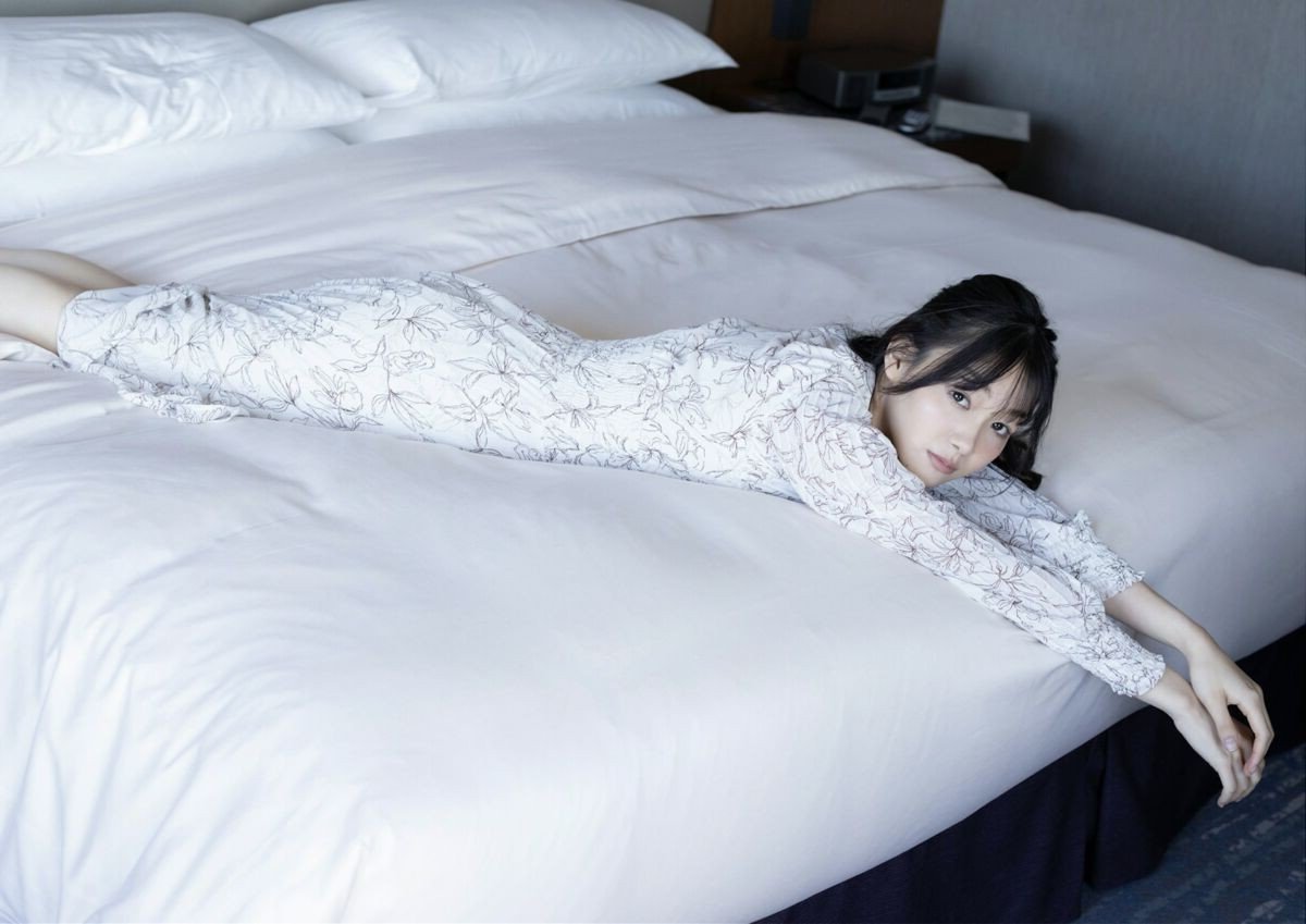 This stunning image features Momotsuki Nashiko from her ENJOY SUMMER PHOTO BOOK Part02 collection She radiates natural beauty and undeniable charm Posing gracefully on a pristine white bed Momotsuki Nashiko captivates with her profound gaze and delicate expression Her light yellow lingerie accentuates her slender figure and alluring curves The simple yet cozy bedroom setting highlights Momotsuki Nashiko's elegance and pure allure This serene moment showcases the confidence and magnetism of a top model Viewers will feel a sense of warmth and intimacy through every subtle detail The photograph promises an emotionally rich and unforgettable visual experience