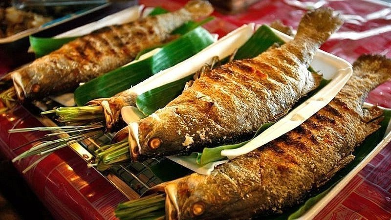 The image prominently features Bong fish a rare and renowned specialty of Vietnams Northwest region With its robust body shimmering scales and distinctive reddish fins the Bong fish is not only visually striking but also holds exceptional culinary value Once a tribute to royalty this fish has now become a soughtafter delicacy among food connoisseurs despite its price reaching half a million VND per kilogram Bong fish meat is celebrated for its natural sweetness firm texture minimal bones and rich nutritional content making it ideal for preparing various delicious dishes imbued with the flavors of the Northwestern mountains Its uniqueness and historical significance have elevated Bong fish to a special position in Vietnamese cuisine