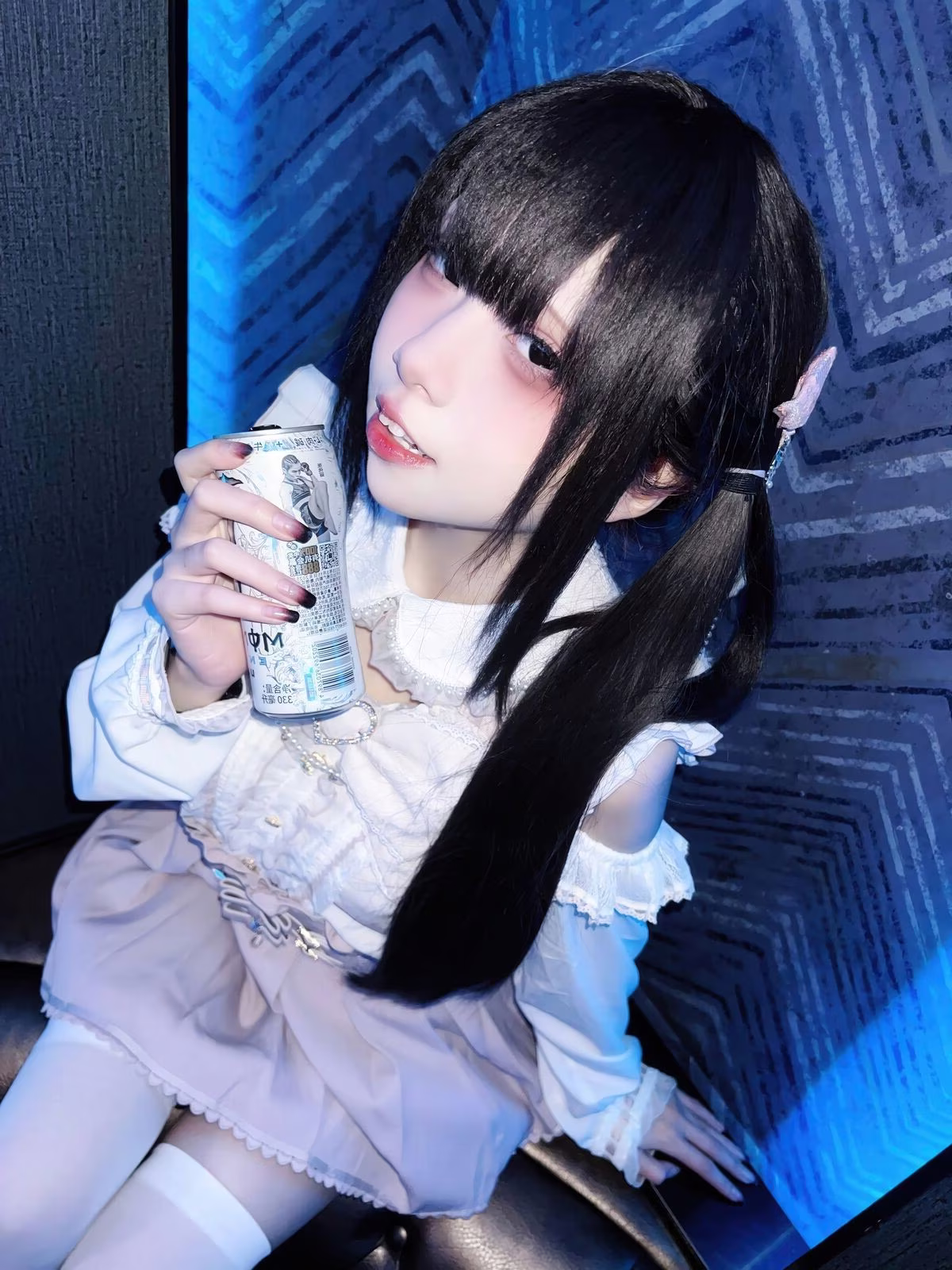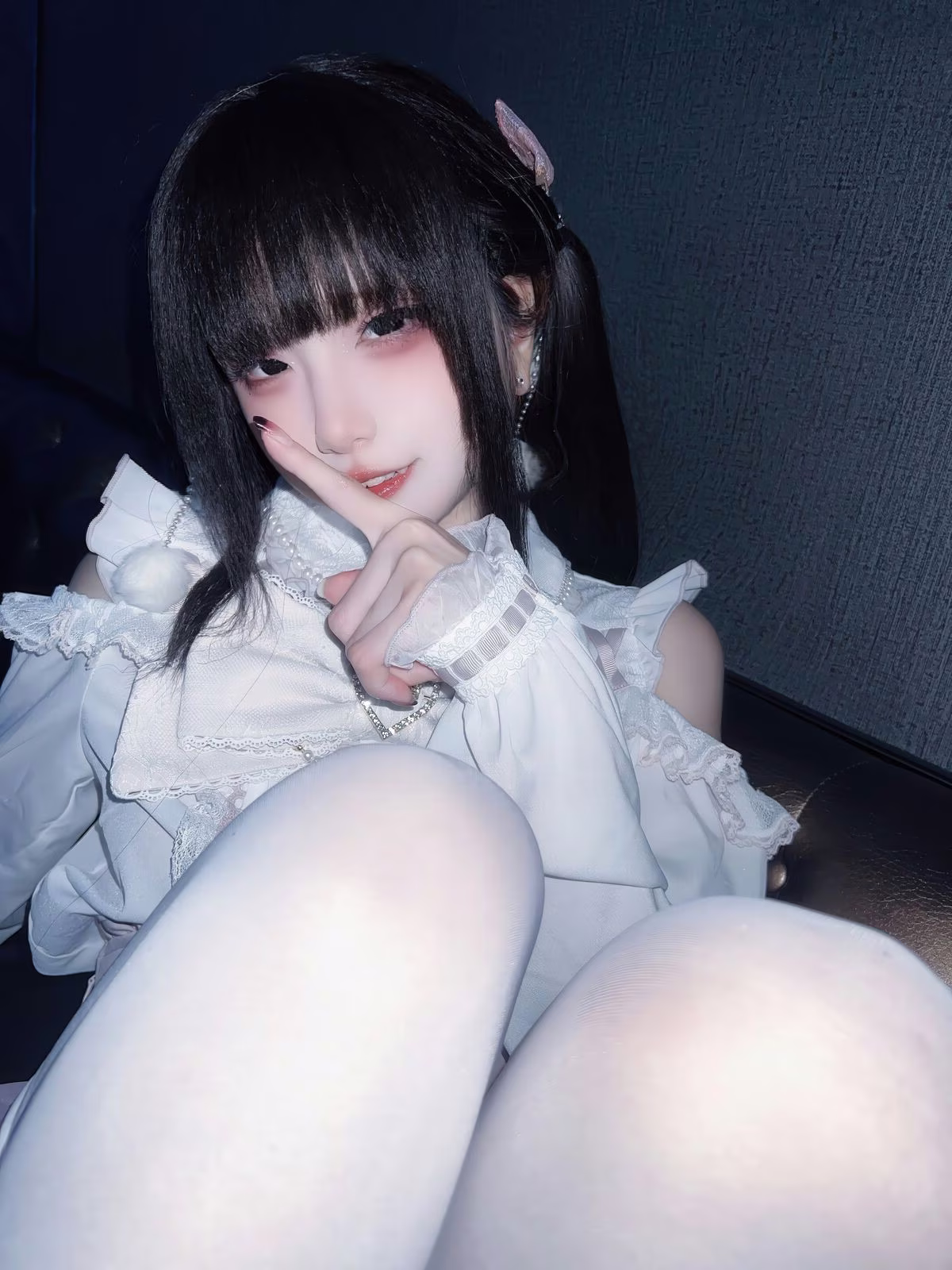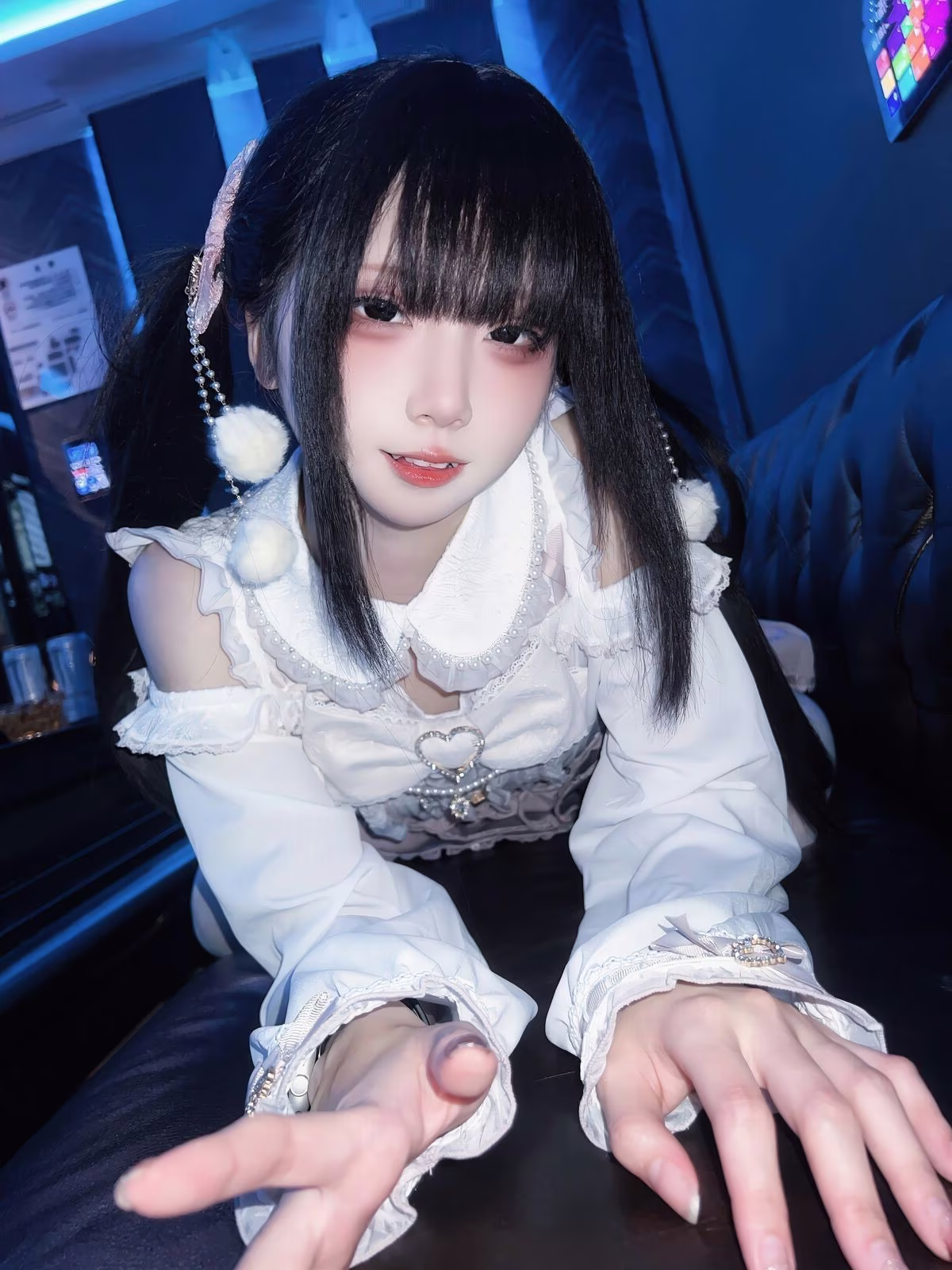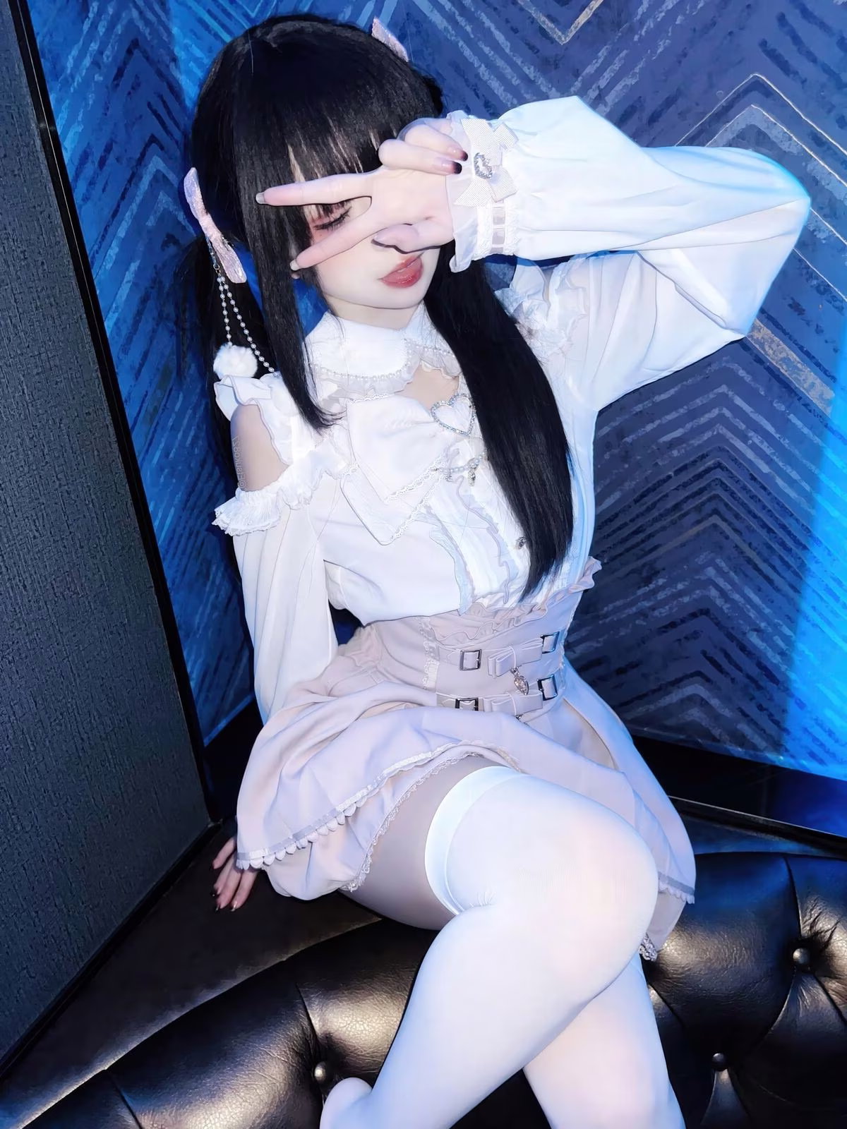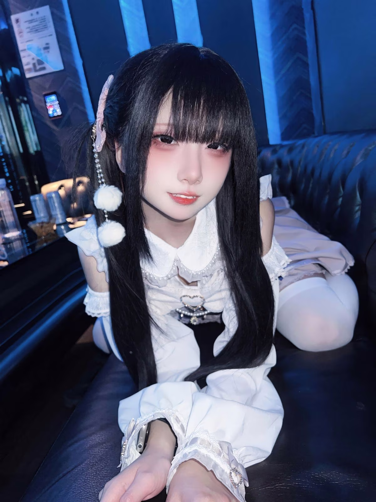 In this enchanting photo Coser Ai Xi Aiwest delivers a captivating transformation into the character 雷戈洛. She exudes a sweet and dreamy beauty with her golden hair styled adorably in two prominent black bows complemented by playful cat ear clips. Her pristine white outfit featuring delicate off-shoulder ruffles enhances her graceful and charming presence. Ai Xi Aiwest's gentle smile and clear eyes draw every gaze creating a warm and romantic ambiance. The bedroom setting with pink curtains and soft lighting further elevates the dreamy aesthetic turning the scene into a sweet reverie. This exquisite portrayal leaves viewers enchanted by her subtle yet undeniable allure.