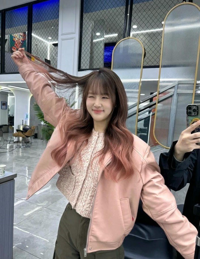 This stunning AI generated image presents a chaebol's daughter in a remarkably realistic style. The young woman exudes an elegant and sophisticated charm with her flowing wavy brown hair and captivating gaze. She wears a delicate light green top adorned with a prominent pink bow reflecting a luxurious and feminine fashion sense. The sun-drenched natural background featuring reddish-brown foliage creates a romantic and dreamy setting enhancing the character's natural beauty and aristocratic aura. This is a masterpiece of digital art perfectly capturing the essence of a modern lady offering a harmonious blend of advanced technology and classic allure. This portrait will undoubtedly appeal to those who appreciate refinement and elegance.