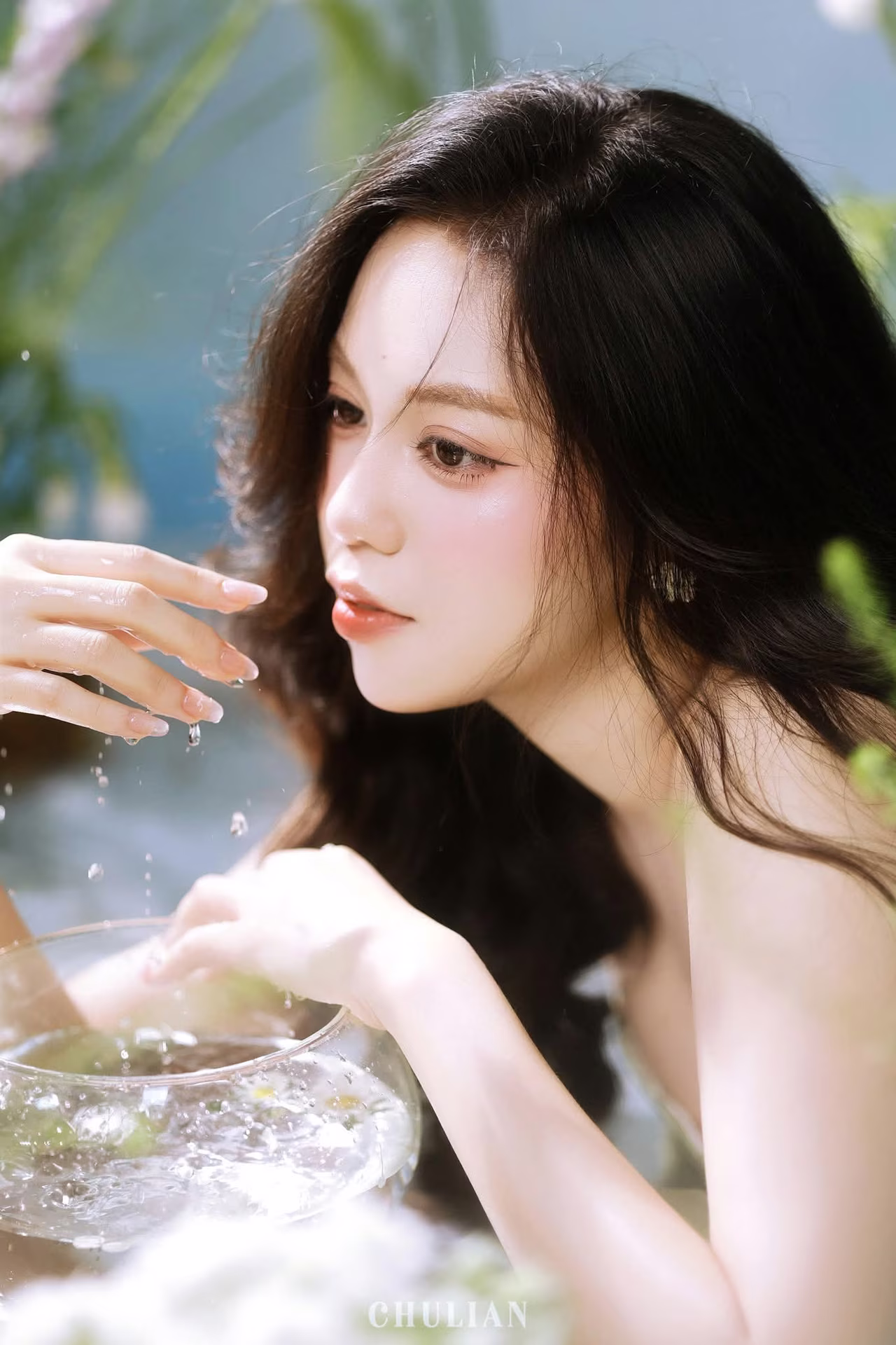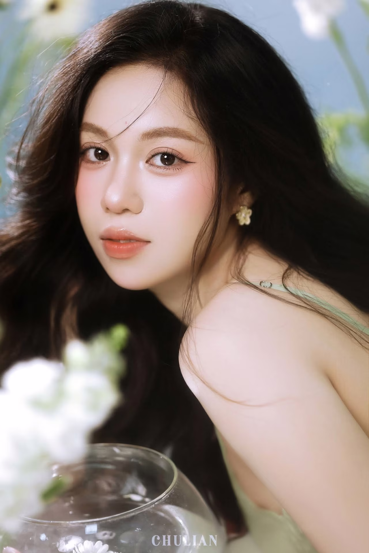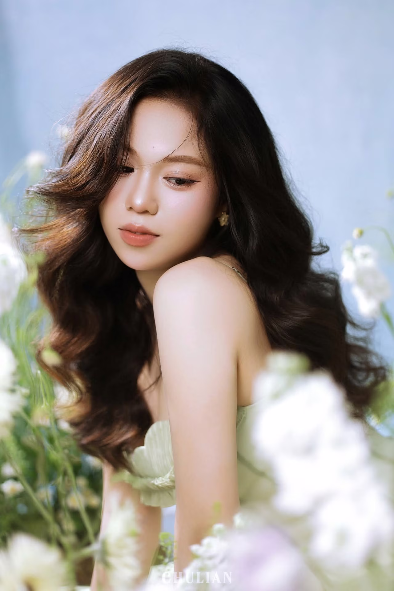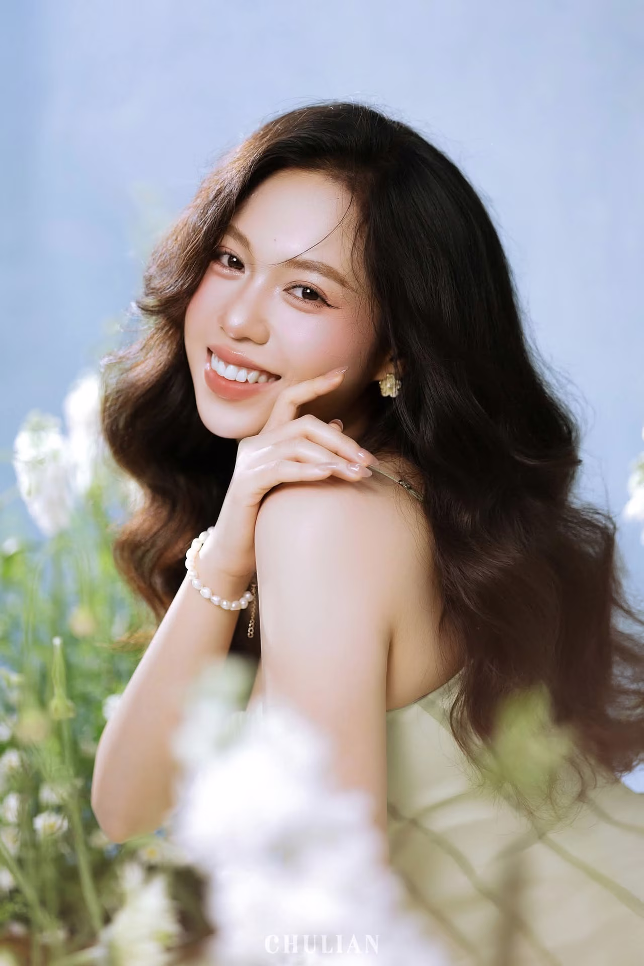 VGU No.91 presents an enchanting scene delicately capturing the ethereal beauty of a muse. The woman with her long flowing dark hair and gently closed eyes exudes a profound sense of serenity and dreaminess. Her soft green attire perfectly complements the pristine white blossoms that frame her creating a natural and romantic tableau. Every detail from the gentle play of light to her hand gracefully resting on her cheek evokes a narrative of inner peace pure beauty and heartfelt emotion. This is more than just a portrait it is a timeless moment inviting viewers to immerse themselves in a world of gentle dreams and find tranquility in every exquisite line and shade. #Vietnamese #pretty #charm