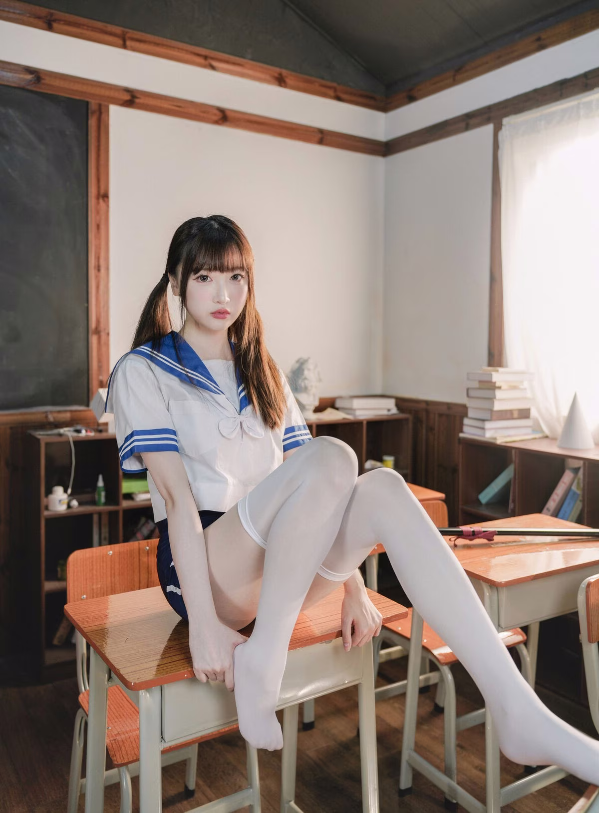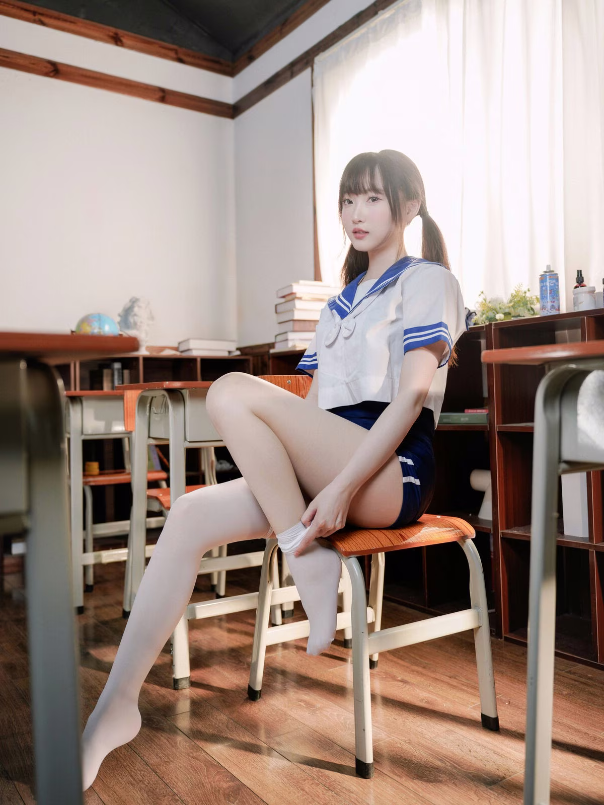 In this YiTuYu Art Language Vol.8275 photoshoot, model Bing Leng Qi E (冰冷企鹅) embodies a graceful schoolgirl, exuding an elegant and captivating beauty. She poses delicately kneeling on the warm wooden floor, a volleyball by her side hinting at youthful energy. Her white and blue sailor-style uniform, paired with short shorts and thigh-high stockings, highlights her charm while maintaining an innocent allure. Her gaze, both gentle and thoughtful, draws viewers in. The familiar classroom setting, complete with a blackboard and bookshelves, creates a nostalgic atmosphere, emphasizing the model's youthful appeal. This is a refined piece of photographic art, not only portraying physical beauty but also conveying the unique emotions and captivating presence of the model.#BingLeng #QiE #Schoolgirl #Sailor #Uniform #Asian #Beauty #ArtPhotography