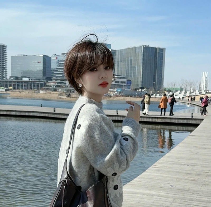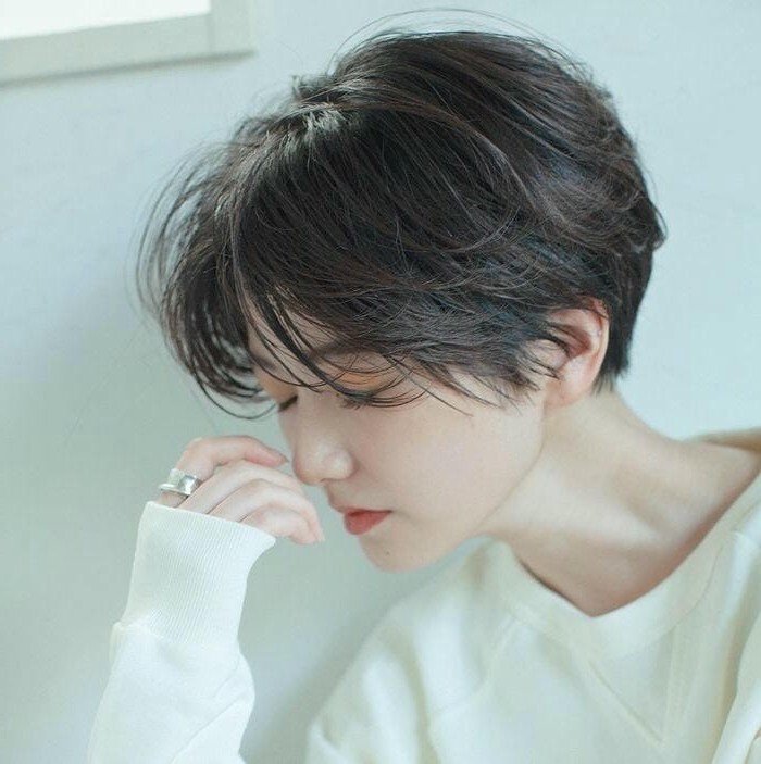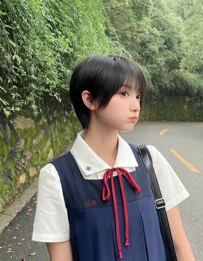 This image highlights a youthful beautiful girl sporting a modern and captivating women's tem haircut. The short hair is skillfully trimmed to frame her round face creating a slender and balanced appearance. This tem hairstyle not only accentuates her charming features but also showcases her individuality and dynamic spirit. With light wispy bangs this cut helps the face appear more compact while also providing a fresh and radiant look. It is a perfect choice for girls looking to transform their style seeking confidence and uniqueness. This women's tem hair is not only easy to maintain but also highly versatile suiting various fashion styles from gentle to edgy.