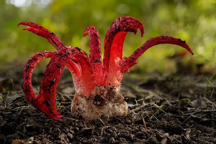 Deep within the damp cool forests of Europe a striking red organism emerges from the earth resembling monstrous tentacles This is the Devil's Fingers mushroom or Clathrus archeri This peculiar fungus boasts an eerie surreal appearance with vibrant red arms that evoke images of a devil's hand Beyond its visual impact the Devil's Fingers is renowned for its unique spore dispersal strategy It emits a pungent foul odor akin to decaying carrion which effectively attracts flies These insects then inadvertently carry and spread its spores throughout the forest While not considered poisonous it is generally advised to avoid consumption It truly stands as a captivating subject for nature photography enthusiasts and those eager to explore the forest's strange inhabitants#DevilsFingersMushroom #ClathrusArcheri #BizarreFungi #ForestCreatures #NatureWonders