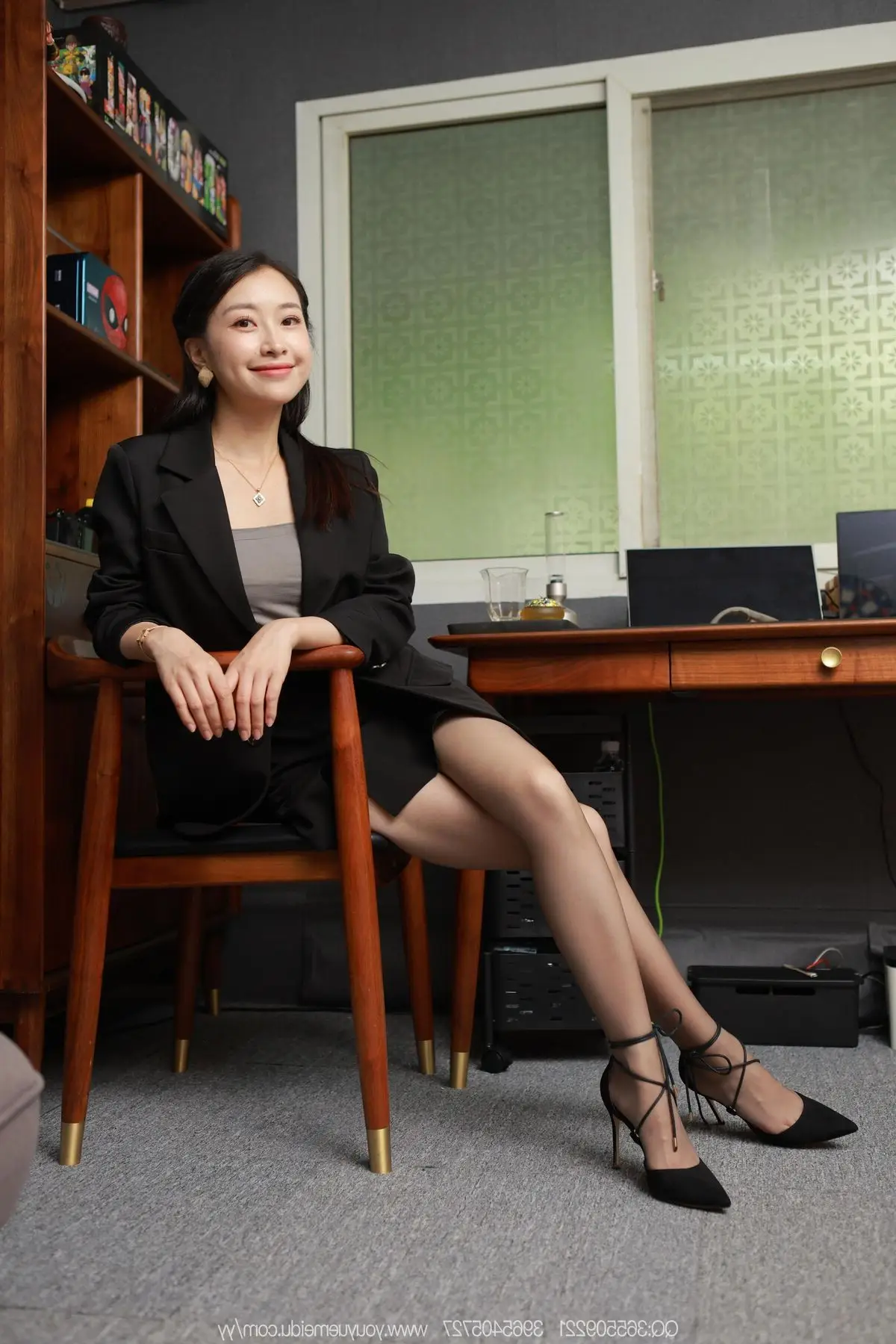 This captivating image from the SXJ No.2095 series features secretary Xiao Jie exuding an aura of elegance and professionalism. She is seated gracefully, dressed in a sophisticated black blazer and skirt, perfectly complemented by delicate black sheer stockings and stylish high heels. This ensemble not only accentuates her graceful figure but also showcases the confident and modern essence of an office lady. Xiao Jie's radiant face and gentle smile create a charismatic yet approachable demeanor, inviting viewers to explore the narrative behind this alluring portrait.#CharmingSecretary #BlackSheerStockings #XiaoJie #OfficeFashion #ProfessionalStyle #OfficeLady #OL #Secretary