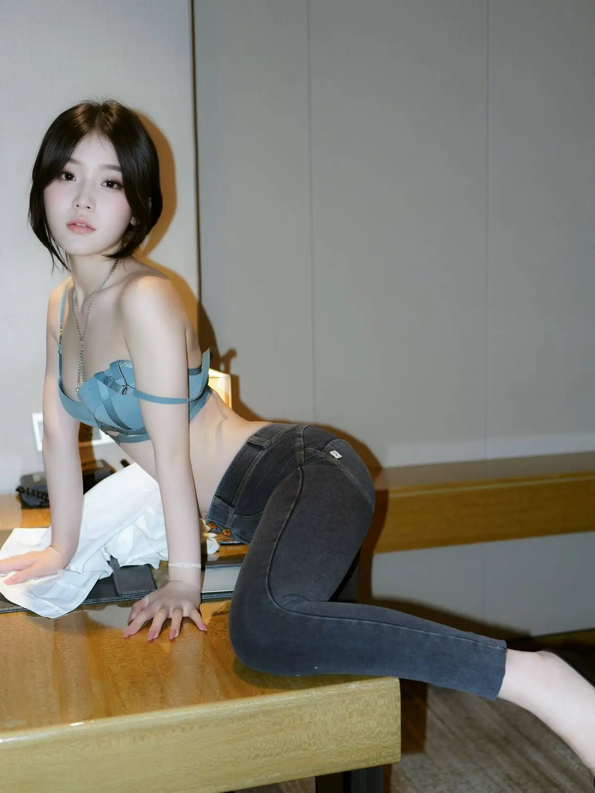 This stunning image focuses on Zhi Zhi, a captivating XiuRen intern secretary, exuding both professionalism and allure in her workspace. She is elegantly dressed in a white crop top shirt, paired with dark trousers and black high heels, accentuating her slender figure and modern fashion sense. Zhi Zhi’s confident pose at the desk, her engaging gaze, and a subtle smile convey an irresistible charm. She not only embodies a diligent secretary but also showcases a confident and subtly sensual presence. The photograph skillfully balances office elegance with personal appeal, inviting viewers to discover more about the beautiful Zhi Zhi.#ZhiZhi #InternSecretary #XiuRen #OfficeFashion #AlluringModel #OfficeLady #OL #jean