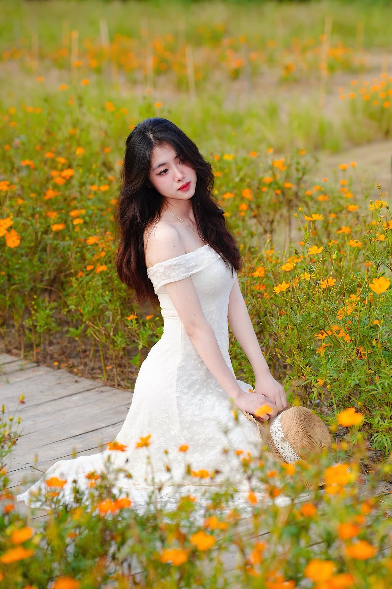 This image XVG No.2 captures the gentle and ethereal beauty of a Vietnamese girl amidst a space overflowing with vibrant flowers. She sits gracefully on a simple wooden chair in a pristine white off-shoulder dress with her long dark hair softly cascading. Her gaze is distant conveying a dreamy and peaceful aura as she delicately holds a small yellow flower. Surrounding her is a lush green landscape adorned with tiny orange and yellow blossoms creating a romantic and lively natural setting. This scene not only celebrates the traditional charm of Vietnamese women but also evokes a profound harmony between humanity and nature a truly captivating moment of tranquility.Captivating Modern Ao Dai - Unique Design Showcasing Elegant Vietnamese Beauty