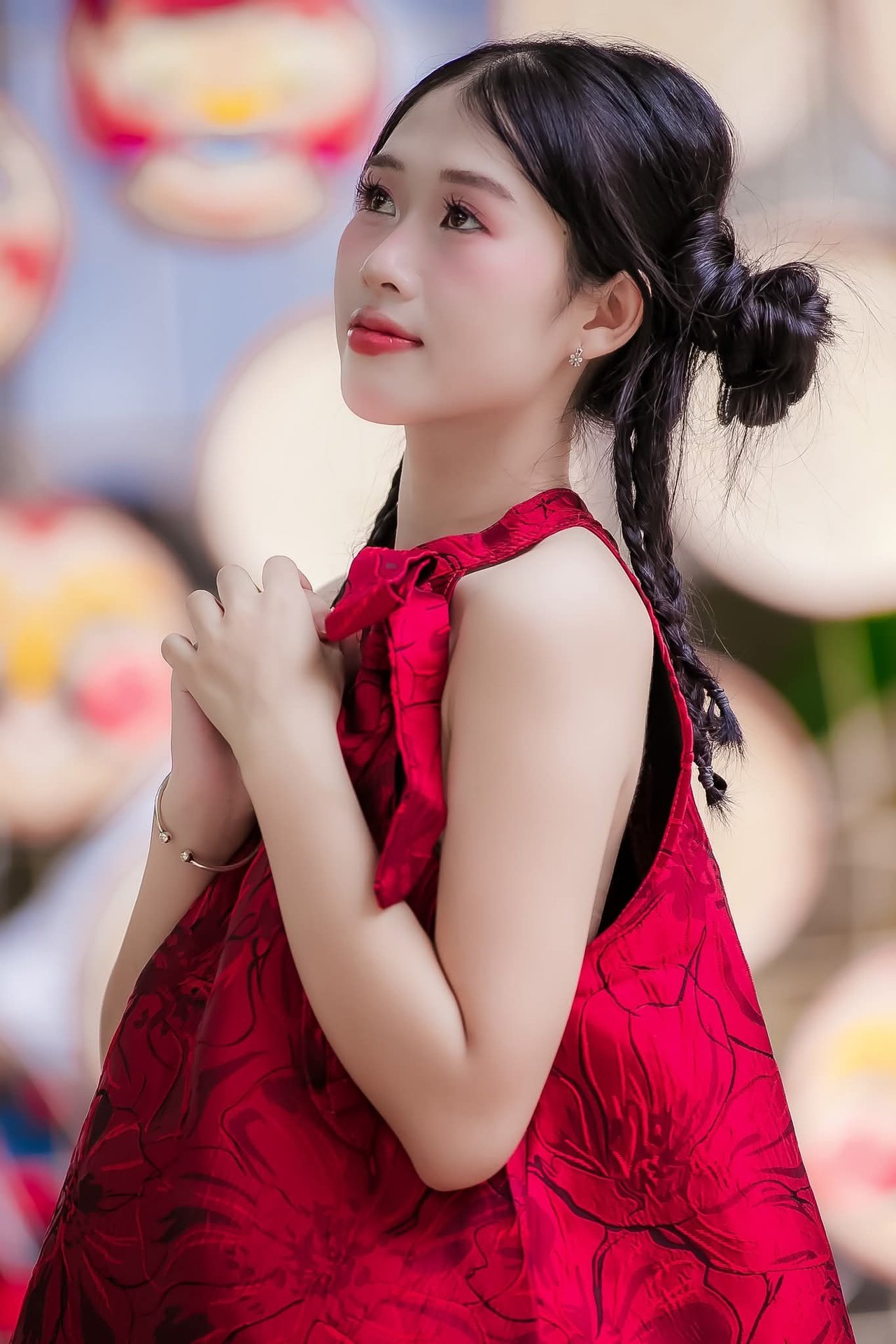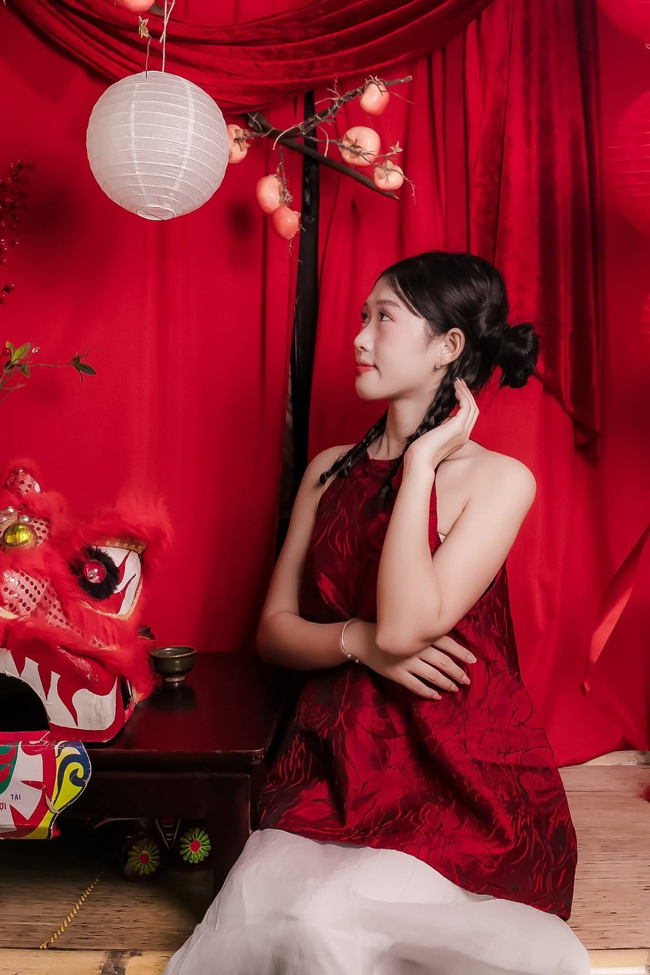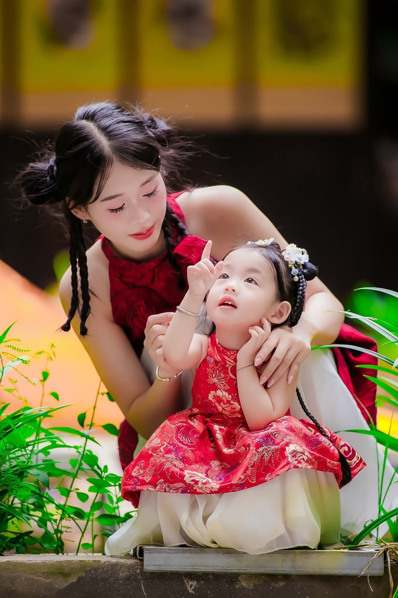 This stunning image captures a heartwarming moment of love and tenderness between a mother and her child. The mother gazes affectionately at her little daughter, who looks adorable in a vibrant modern Ao Dai inspired dress, holding a pristine white parasol. The setting is adorned with charming heart-shaped and orange lanterns, creating a festive and culturally rich atmosphere. The radiant smiles on both their faces reflect immense happiness and the strong bond of their mother-daughter relationship. More than just a beautiful picture, this is a priceless memory celebrating the sacred bond of motherhood and the beauty of Vietnamese culture and tradition.