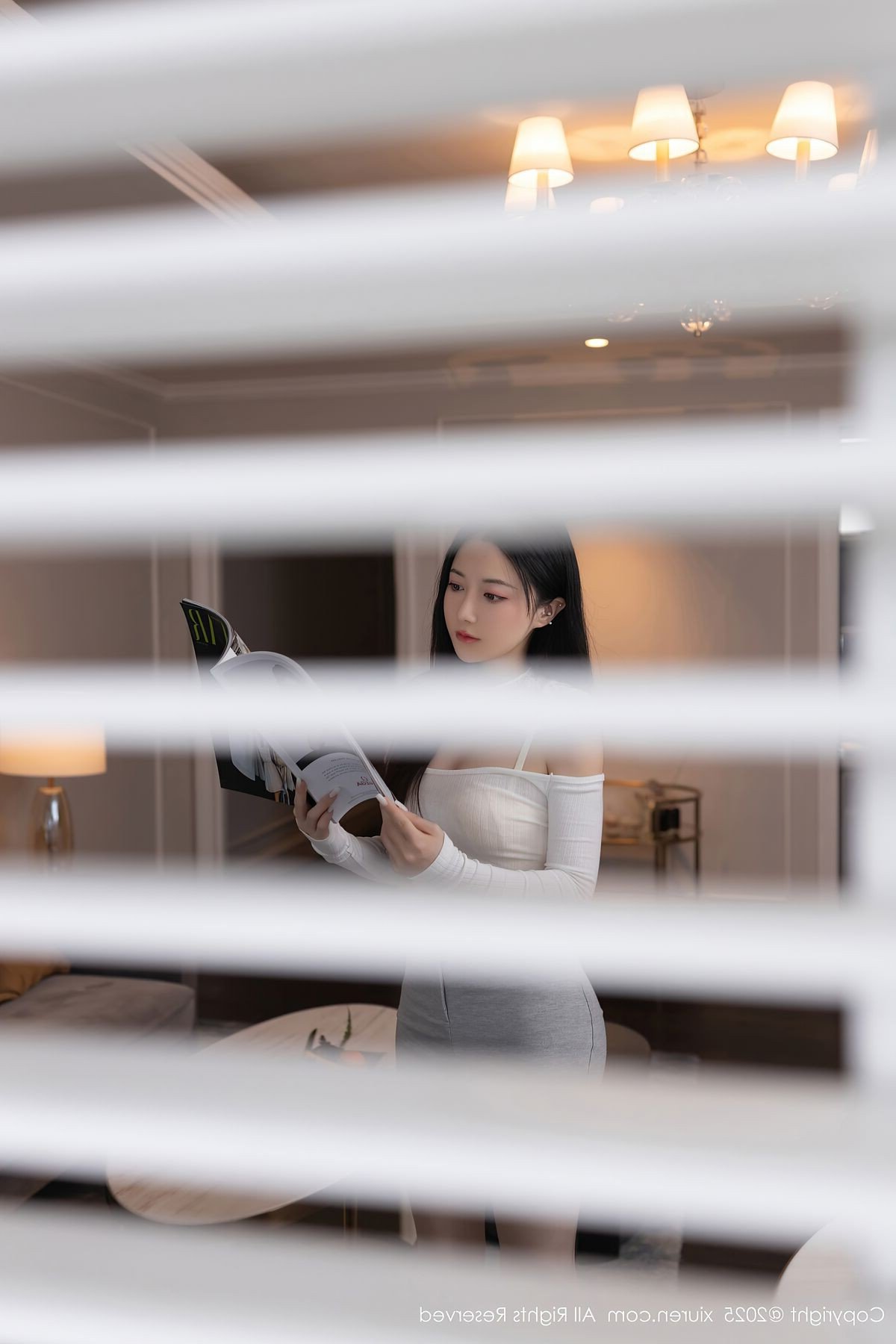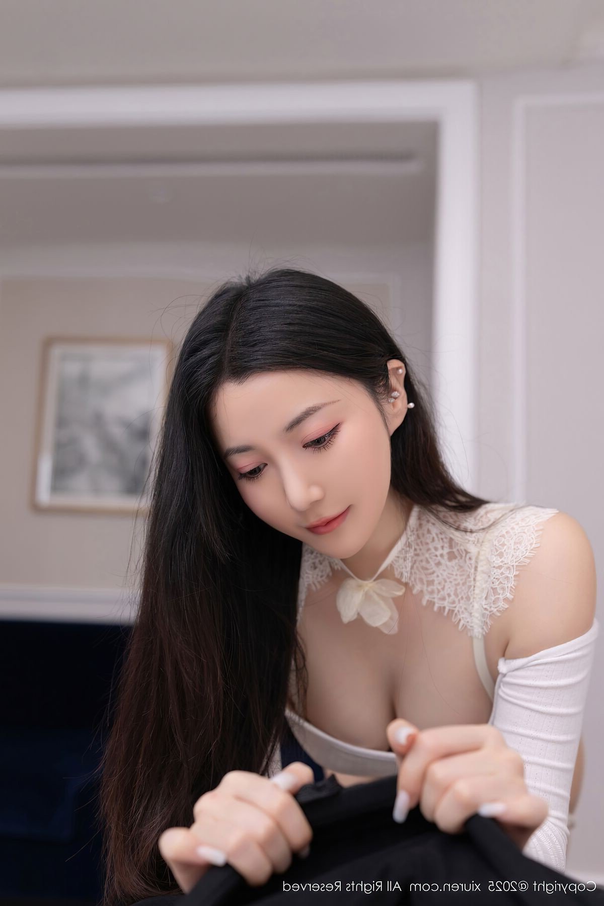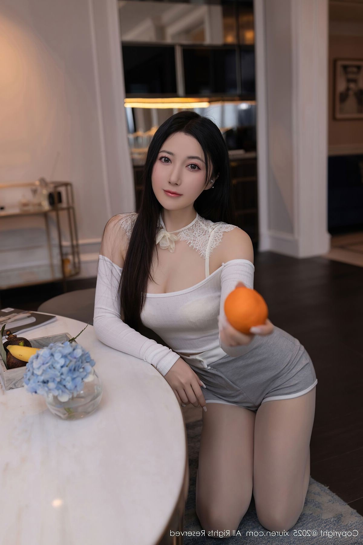 In this stunning XiuRen No10261 photoshoot model Yu Zi Jiang Fish exudes an ethereal and captivating beauty She is gracefully adorned in a pristine white off shoulder top paired with stylish grey shorts creating a harmonious blend of elegance and youthful energy The image beautifully captures Yu Zi Jiang Fish kneeling delicately holding a vibrant orange fruit her gaze direct and alluring The modern indoor setting complemented by a subtle blue floral arrangement further enhances her natural charm and sophisticated appeal Her poised demeanor and confident expression make this a truly enchanting visual experience This collection showcases Yu Zi Jiang Fishs unique allure delivering a memorable and artistic portrayal that is both graceful and mesmerizingStories