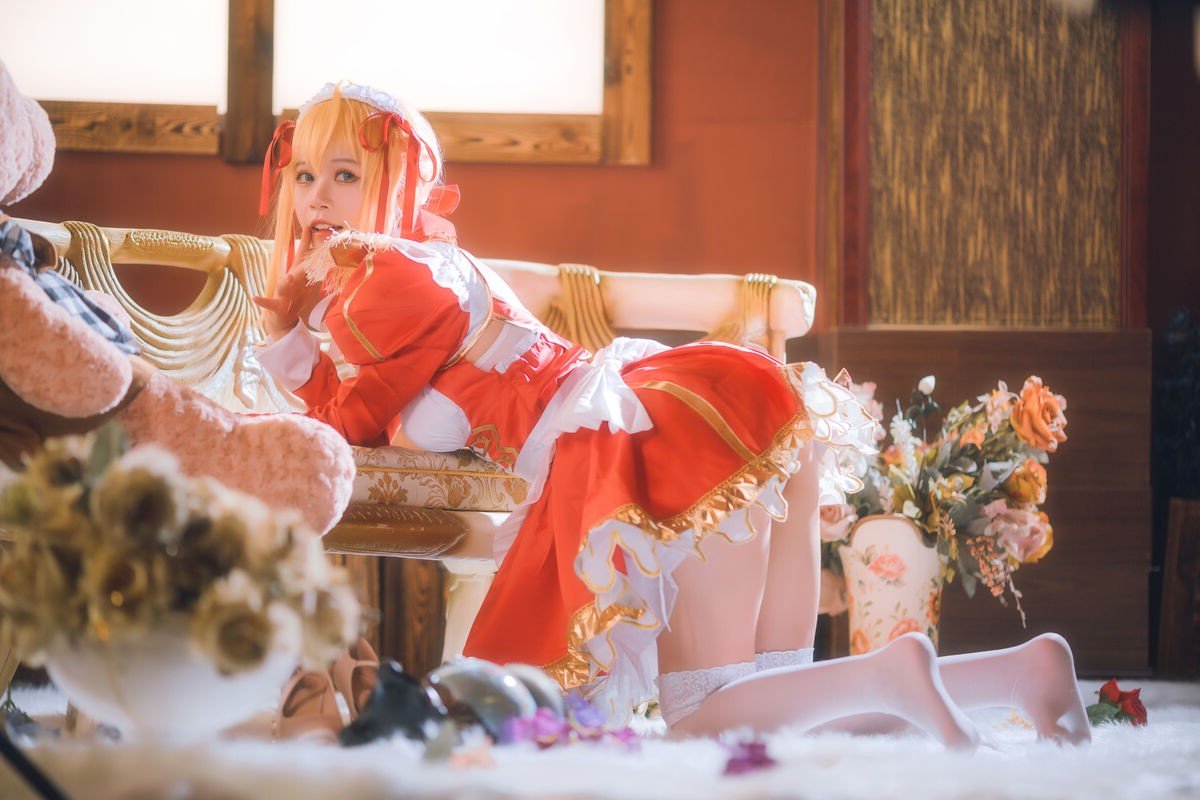 This image captures a stunning moment of Coser Kanoko Chitanda embodying the impressive character of Nero Maid. She shines brightly in a vibrant orange-red maid costume harmoniously combined with a pristine white apron and intricate ruffled details. Her golden hair is adorned with a matching headband and bows, creating an appearance that is both noble and graceful. The gentle standing pose and soft gaze exude elegance and charm, as if the character has stepped out of the virtual world. The meticulous attention to every detail of the cosplay showcases Coser Kanoko Chitanda's passion and skill, presenting a vivid and captivating image of Nero Maid that enthralls every viewer.