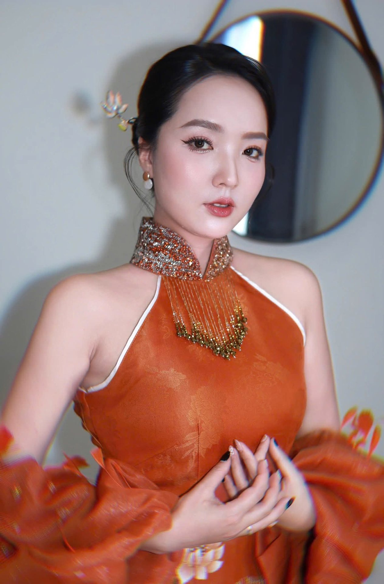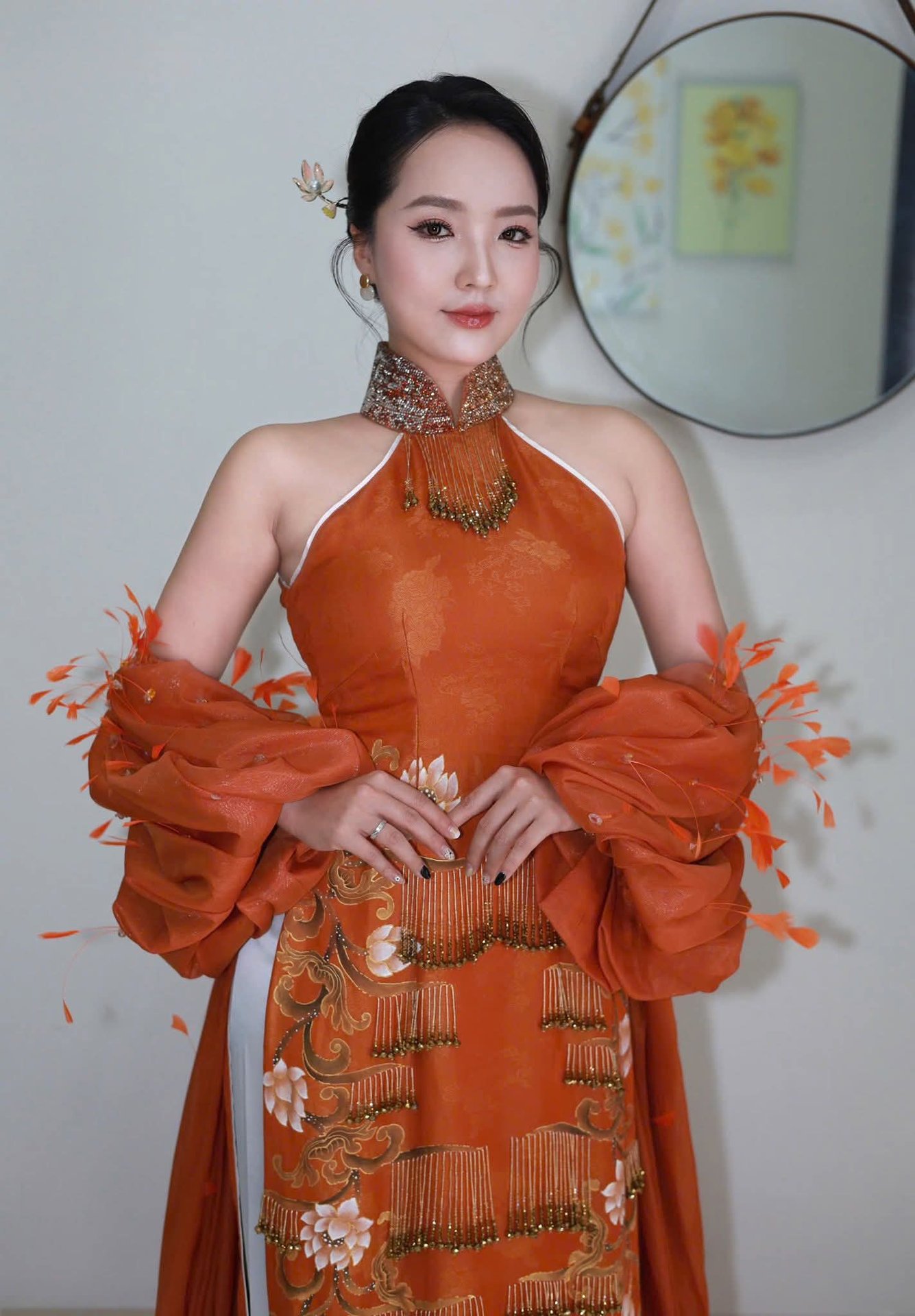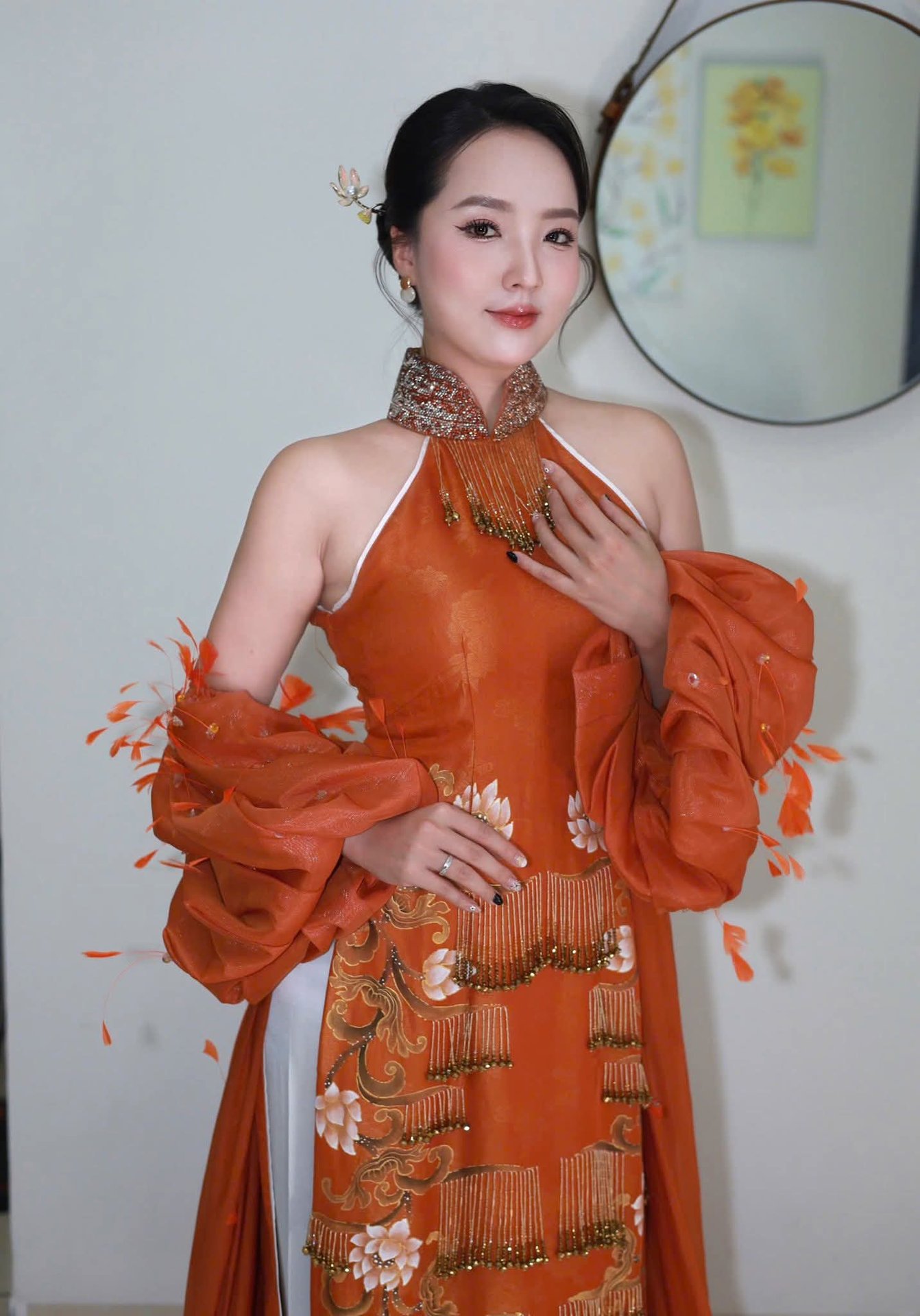 The image beautifully captures the elegant charm of a Vietnamese woman adorned in a stunning modern Ao Dai. This attire stands out with its warm terracotta orange hue and a truly unique design, featuring exquisite embroidered and beaded details complemented by an intricately styled sleeve or shawl, creating an incredibly captivating fashion statement. Every line of this traditional garment not only flatters her figure but also reflects the wearer's refined aesthetic taste. The harmonious blend of classic and contemporary elements forms a perfect ensemble that draws every eye. This is undoubtedly an ideal choice for those who appreciate sophistication and distinctiveness at special events.