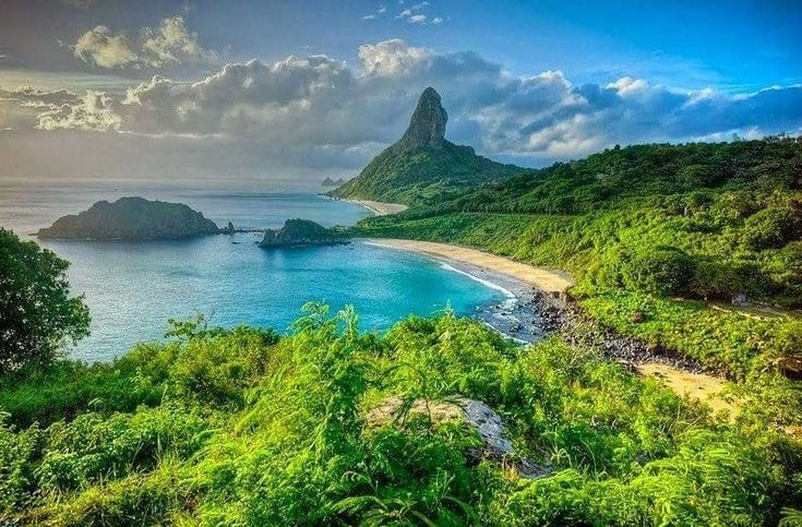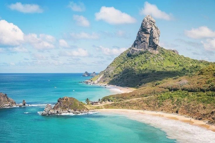 Gaze upon the majestic Fernando de Noronha archipelago, proudly situated in the vast blue Atlantic Ocean, a pristine paradise of Brazil. This image captures its magnificent beauty, featuring the distinctive volcanic peak that formed the island, reaching towards the sky and clouds, a testament to nature's powerful creation. Turquoise waters gently embrace the fine white sandy beach, crafting a spectacular vista. The entire archipelago is a UNESCO World Natural Heritage site, where a diverse South American ecosystem thrives. From lush green vegetation to the expansive ocean, every view exudes untouched wilderness, inviting exploration of its unique beauty and abundant life.Stories