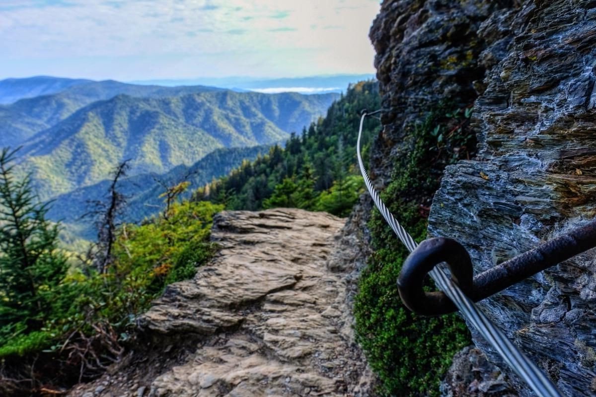 The image reveals a majestic mountain landscape where winding trails challenge hikers. Along the precarious cliff face a sturdy steel cable guides the way promising an adventurous yet spectacular journey of discovery. In the distance the rolling ranges of Great Smoky Mountains National Park emerge faintly in the morning mist creating a beautiful portrait of American nature. This is the characteristic beauty of the legendary Appalachian Trail a scenic heritage where diverse ecosystems coexist. Standing amidst the vast expanse breathing fresh air and admiring the wild beauty of the mountains will undoubtedly be an endless source of artistic inspiration for anyone who loves nature.