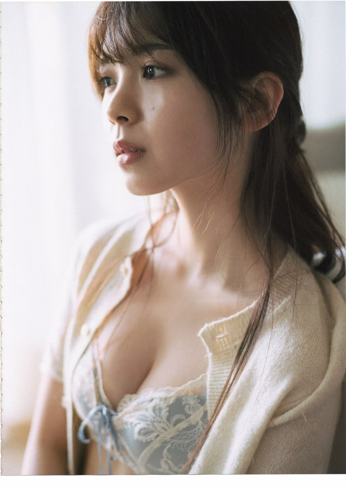 This exquisite image features Yokono Sumire, exuding a delicate charm as she gazes directly at the viewer. Draped in a soft, sheer white fabric, her expression blends innocence with a subtle allure. The elegant white lace bra beautifully complements her feminine grace, while the gentle lighting accentuates her radiant beauty and the intricate details of her attire. This photograph is a highlight from her much-anticipated digital photobook, "No One Part01," offering a glimpse into her captivating world. Each image in this collection promises to take viewers on a journey through her multifaceted appeal, from serene innocence to understated sophistication, creating an unforgettable visual experience for fans and admirers alike.#YokonoSumire #JapaneseIdol #DigitalPhotobook #AsianBeauty #NoOnePart01