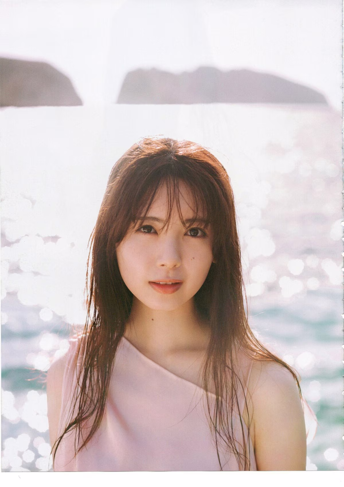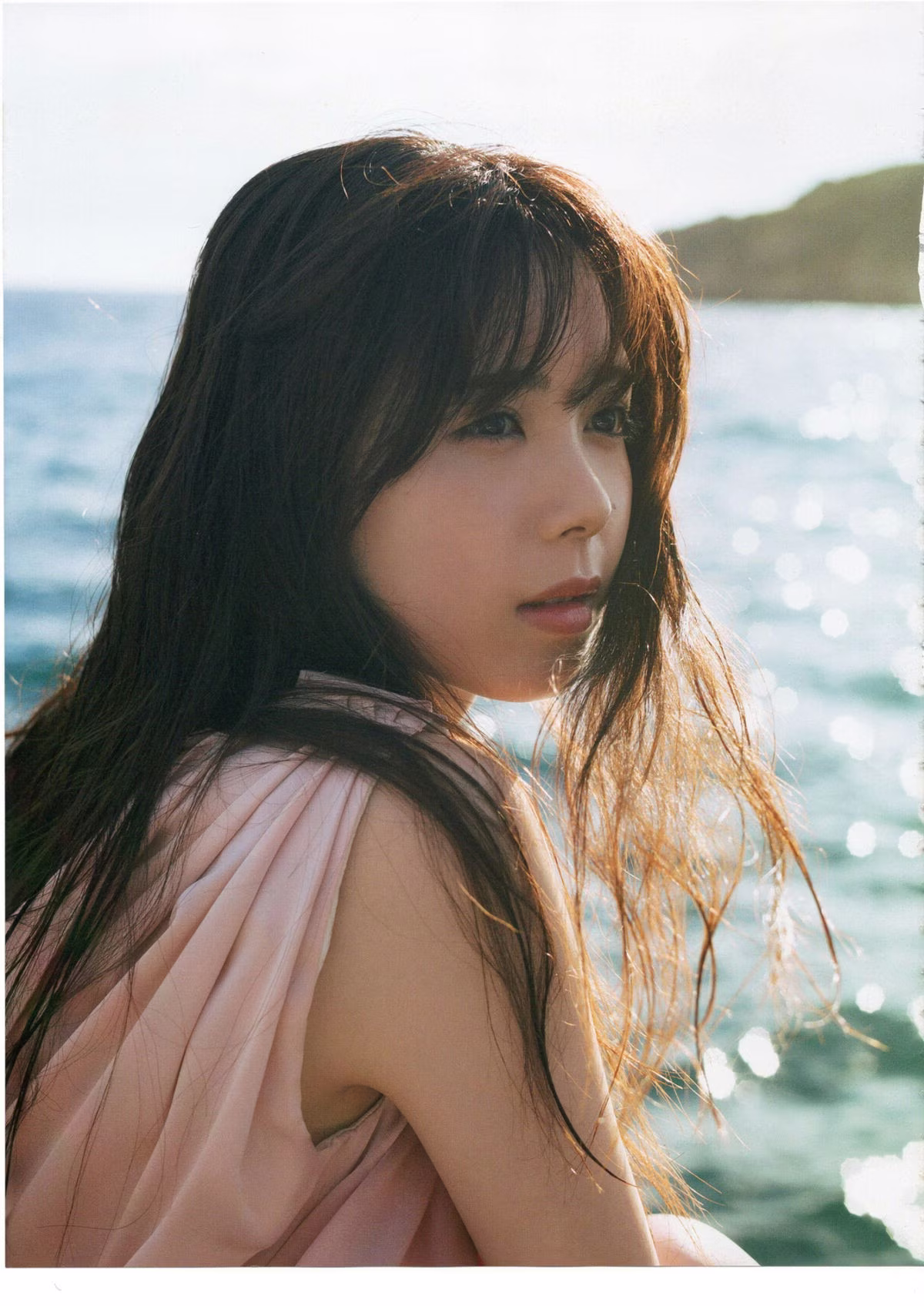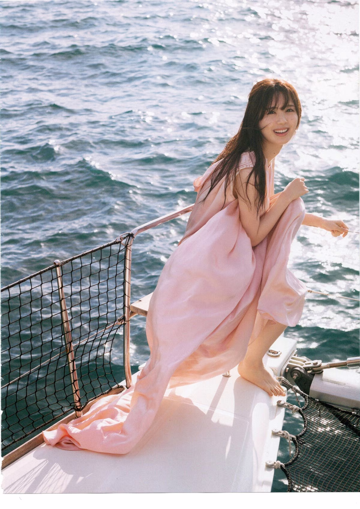 This captivating photo collection presents Nogizaka46's Ayame Tsutsui in a mesmerizing seaside setting. With naturally damp hair and a profound gaze she exudes a pure and slightly contemplative beauty. Her soft pastel pink attire blends seamlessly with the golden sunlight reflecting on the water creating a romantic and poetic scene. The moment Ayame sits on the boat deck gazing into the distance evokes 'gaps in emotion' perfectly aligning with the title of her debut photobook. This series is an intimate journey into Ayame Tsutsui's inner beauty and natural grace promising an impressive visual experience for fans and admirers alike.