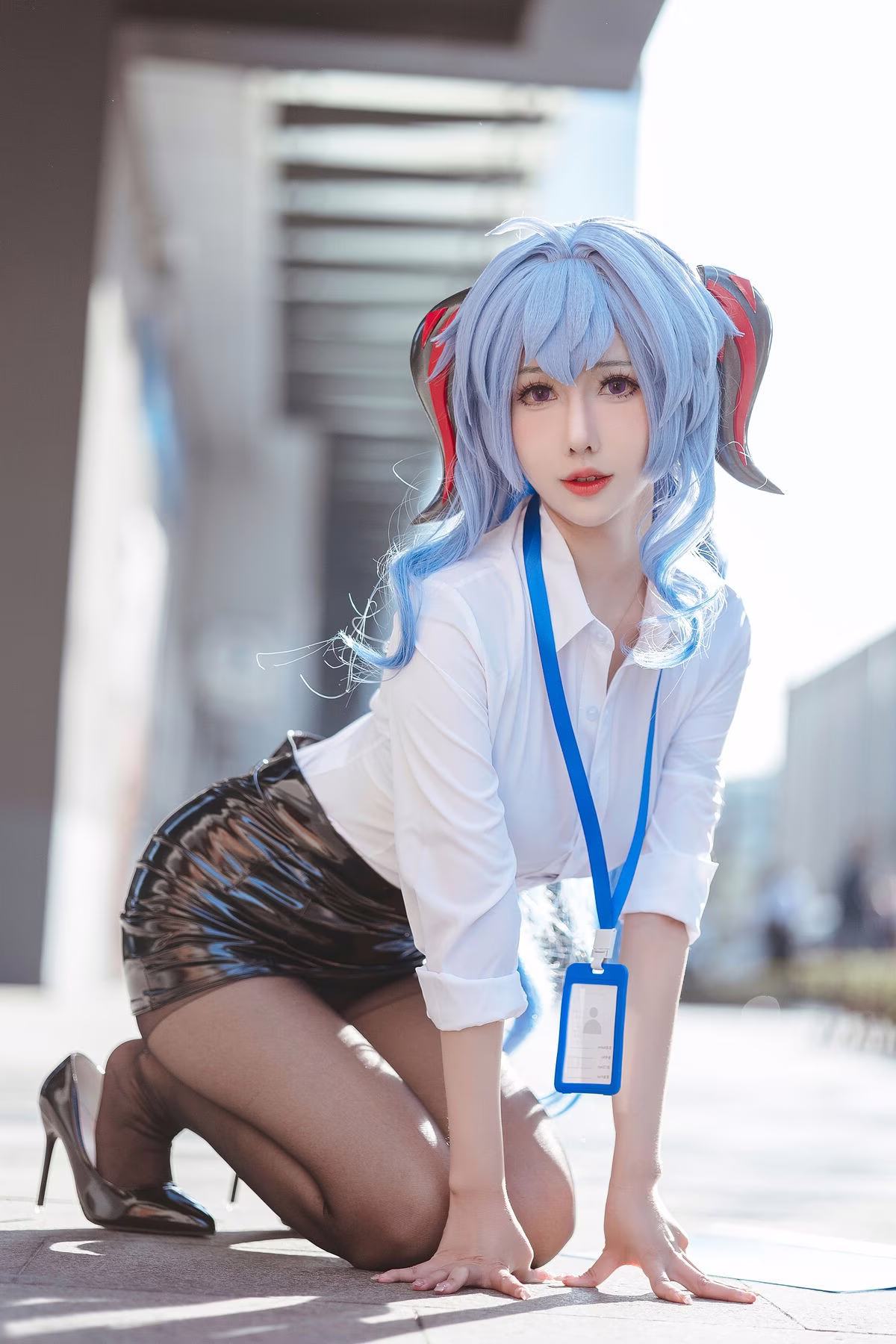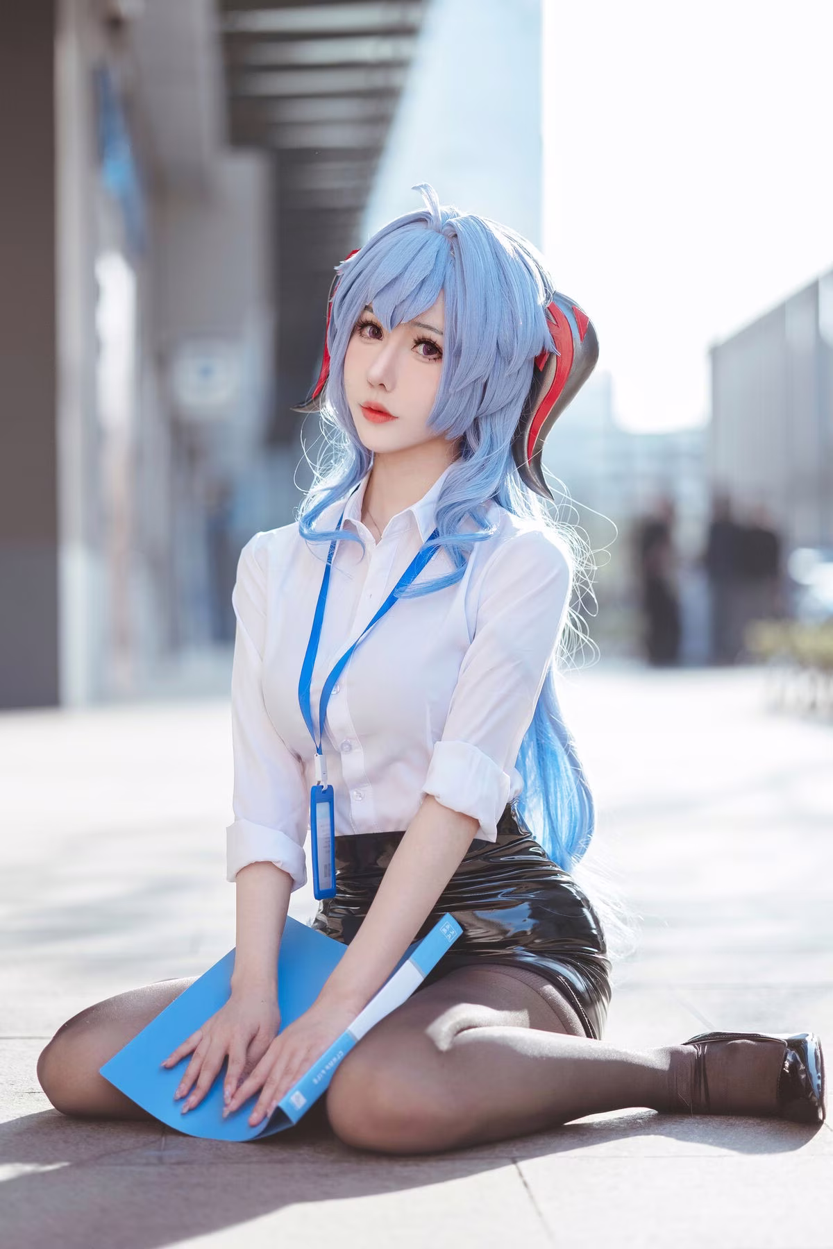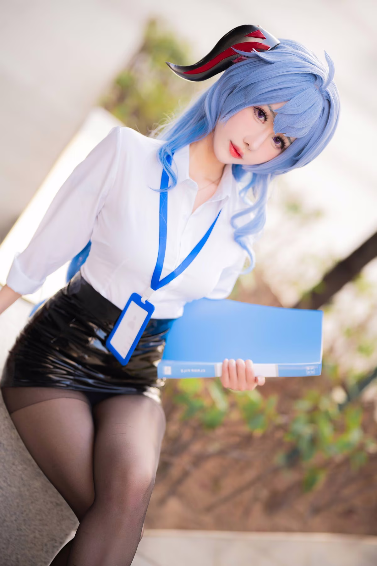 This Genshin Impact Ganyu cosplay photoshoot by Coser Xian Nu Yue offers a fresh and captivating perspective on the beloved character. Dressed in a modern office-style outfit, Ganyu appears elegant yet undeniably alluring. Her signature blue hair, horns, and bell are meticulously retained, creating a clear connection to the original design. Xian Nu Yue's graceful kneeling pose and captivating gaze beautifully portray Ganyu's gentle and enchanting essence. This is an exceptional transformation, showcasing the cosplayer's dedication and passion, and is sure to delight Genshin Impact fans and cosplay enthusiasts alike.