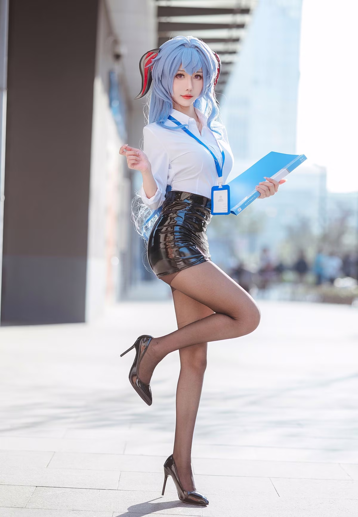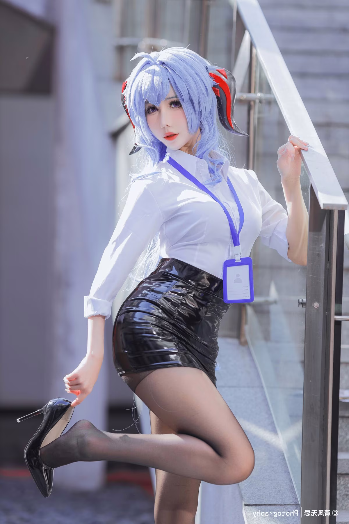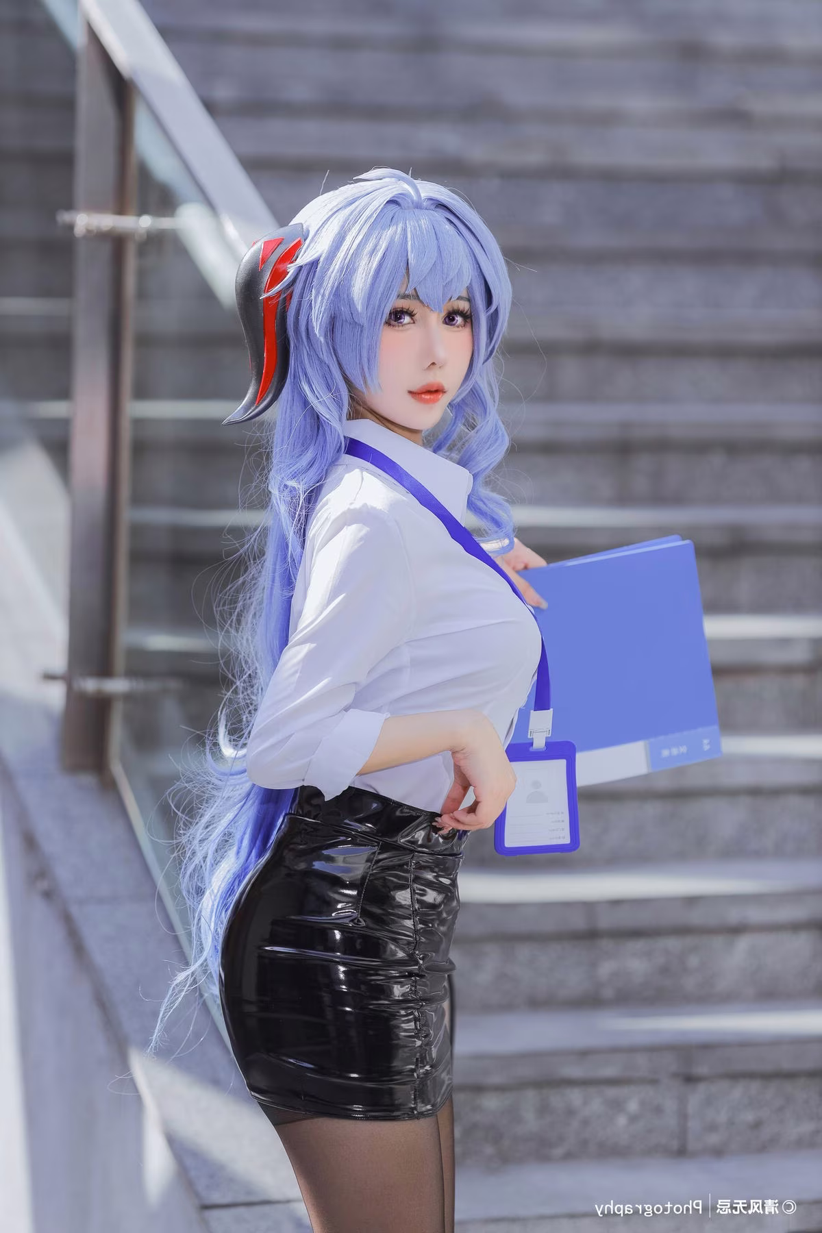 This Genshin Impact Ganyu cosplay photoshoot by Coser Xian Nu Yue offers a fresh and captivating perspective on the beloved character. Dressed in a modern office-style outfit, Ganyu appears elegant yet undeniably alluring. Her signature blue hair, horns, and bell are meticulously retained, creating a clear connection to the original design. Xian Nu Yue's graceful kneeling pose and captivating gaze beautifully portray Ganyu's gentle and enchanting essence. This is an exceptional transformation, showcasing the cosplayer's dedication and passion, and is sure to delight Genshin Impact fans and cosplay enthusiasts alike.