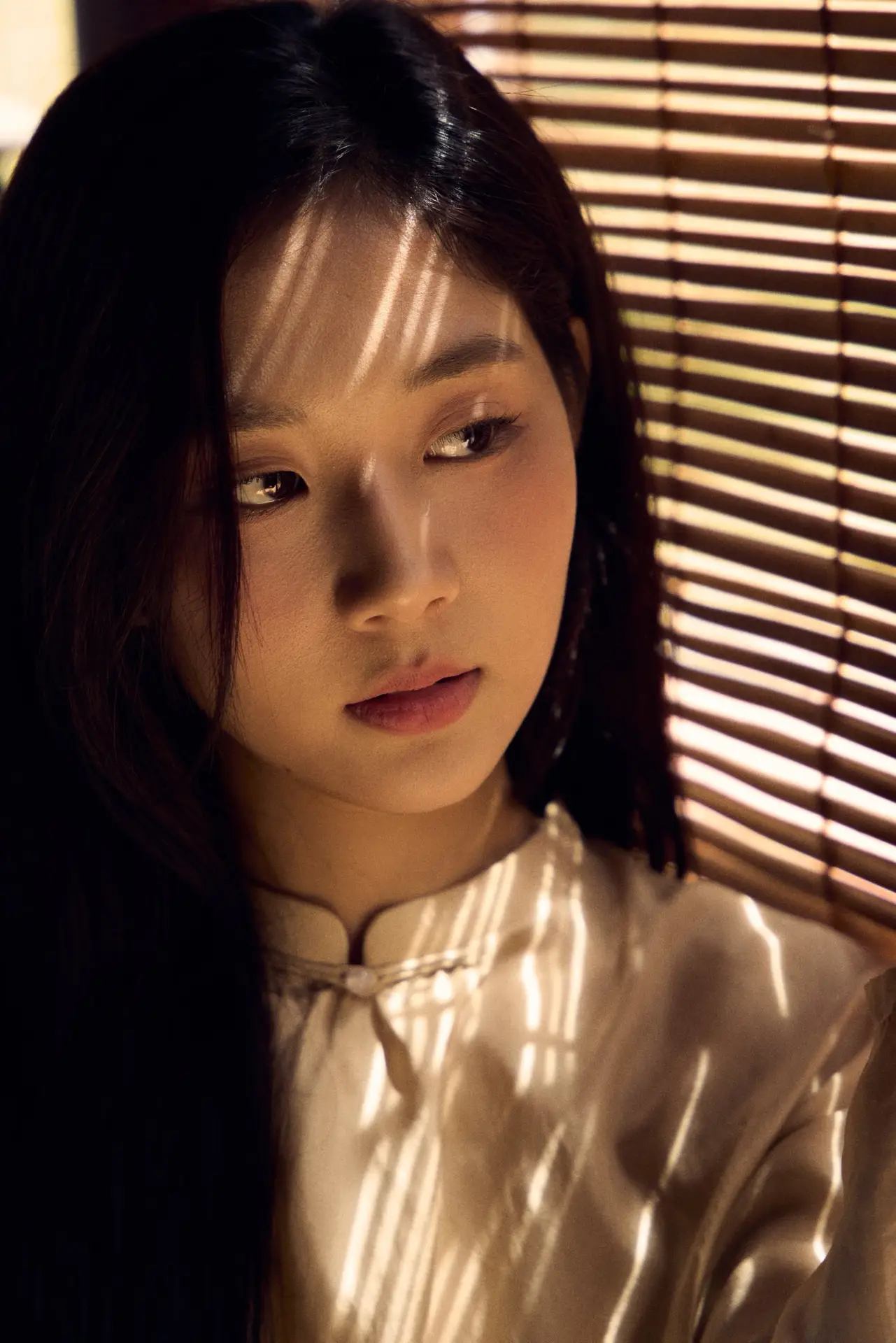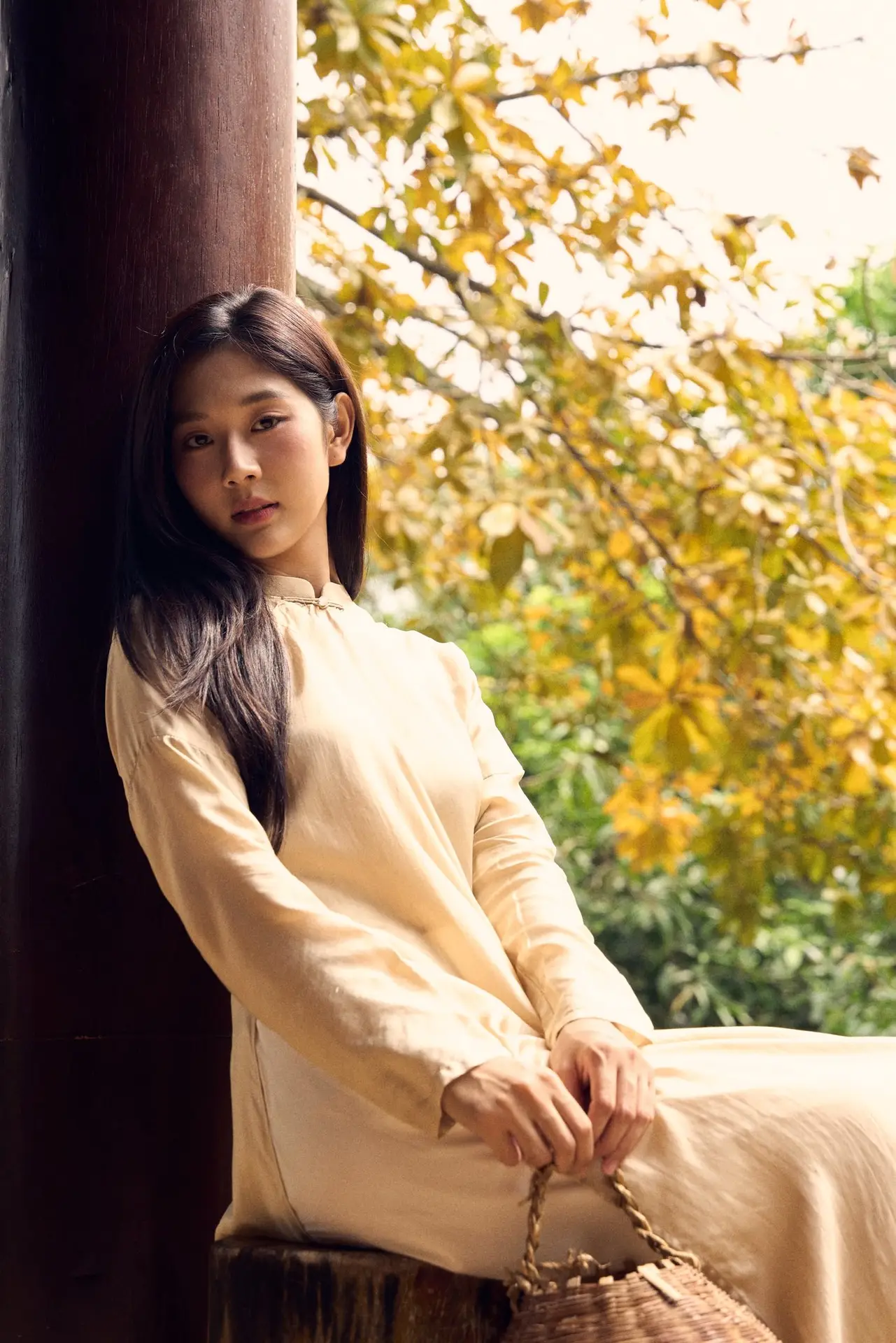 This photograph captures a Vietnamese woman embodying gentle and elegant beauty. She wears a cream colored modernized ao dai or traditional inspired top reflecting Vietnam's rich cultural heritage. Soft light filters through a textured background creating delicate patterns of light and shadow beautifully highlighting her serene face and long dark hair. Her eyes hold a pensive expression hinting at an untold story. This moment not only celebrates the natural grace of Vietnamese women but also evokes a sense of nostalgia for timeless traditional values. An image full of emotion and profound depth.#Vietnamese #Beauty #AoDai #VietnameseTradition #AsianPortrait #CulturalHeritage