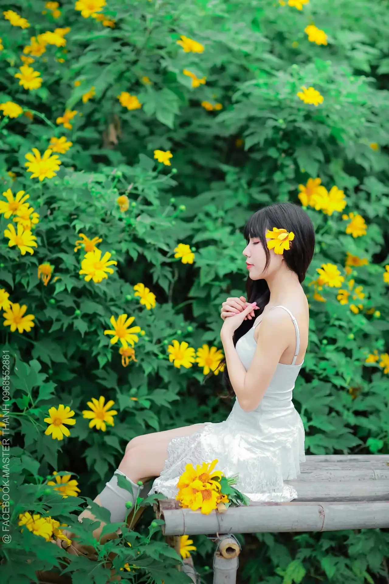 In a breathtaking natural setting bathed in vibrant yellow hues, a young woman in a pristine white dress emerges like a muse amidst a blooming flower garden. With her long dark hair gently adorned by a single yellow flower, she radiates a delicate pure and captivating beauty. The graceful woman sits serenely on a rustic bamboo bench, her hands gently clasped, gaze softly directed forward, creating a moment of quiet contemplation and deep emotion. Surrounding her, clusters of golden yellow Mexican sunflowers are in full bloom, forming a lively and spirited backdrop. This photograph beautifully captures not only the woman's enchanting presence but also the wonderful harmony between human elegance and the splendor of nature, evoking a sense of tranquility poetic charm and inspiration.#WhiteDressBeauty #YellowFlowerGarden #NatureMuse #GracefulWoman #FloralBeauty