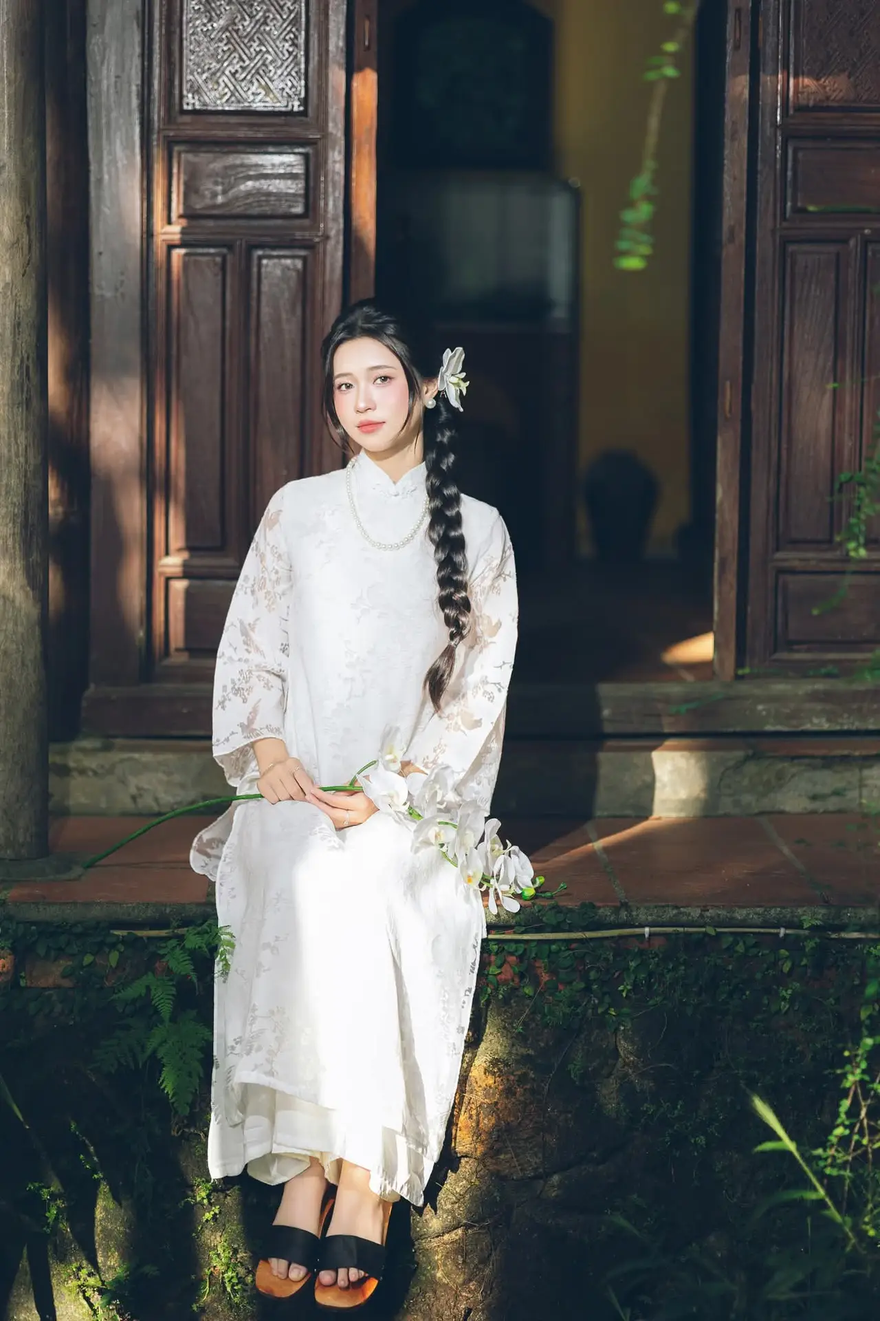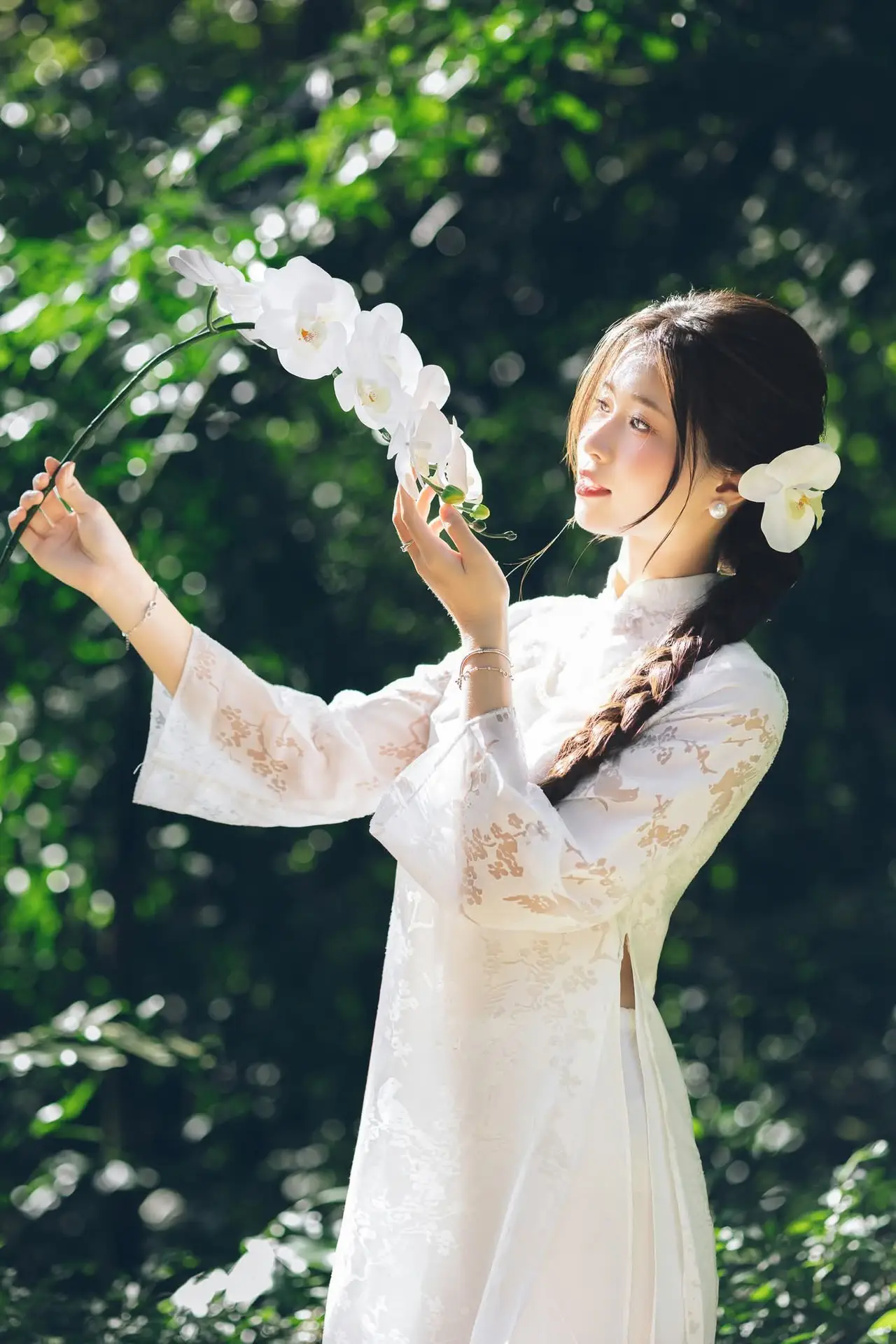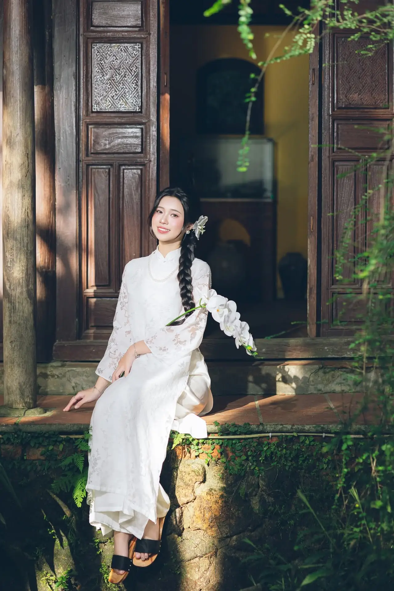 In image 1000026906 a beautiful young woman radiates an aura of elegance and gentle charm. She wears a pristine white lace dress featuring intricate details that gracefully enhance her slender figure. Her long hair is neatly braided cascading over her shoulder adding a touch of grace. A delicate white orchid adorns her hair while a bouquet of white orchids in her hand further emphasizes her pure beauty. Her bright smile and clear eyes reflect the freshness of an early morning. The lush green natural background perfectly complements her natural beauty creating a serene and poetic moment that captures the essence of youthful grace.#VietnameseGirl #WhiteLaceDress #WhiteOrchids #NaturalBeauty #ElegantPortrait