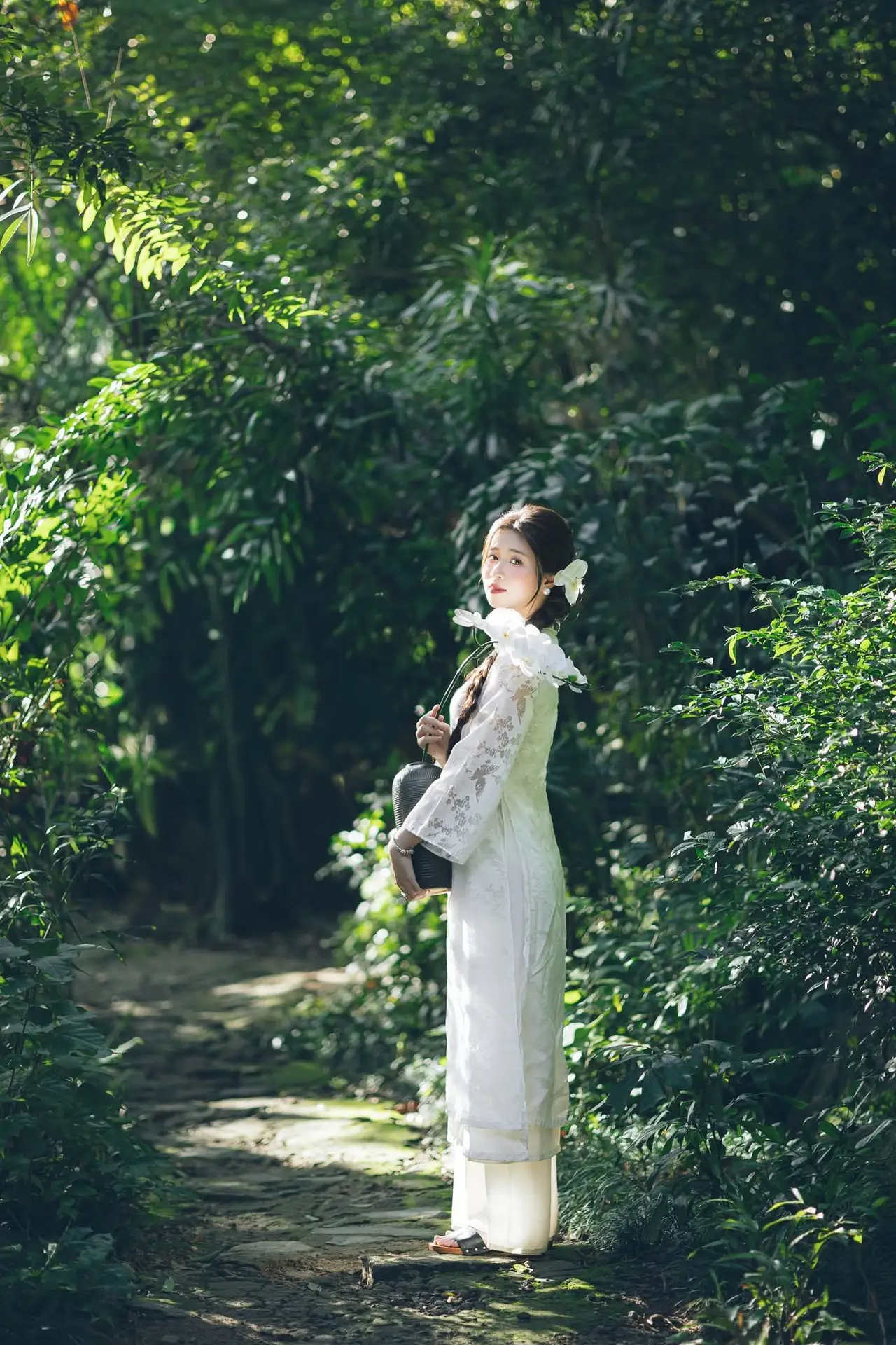 This captivating image from the YiTuYu Art Language Vol.8581 collection showcases model Ya Tui's serene and elegant beauty. Dressed in pristine white flowing attire her long dark hair is adorned with a delicate white flower evoking the image of an ethereal muse. The lush green natural backdrop subtly enhanced by soft pink blossoms adds a touch of poetic charm to the scene. Ya Tui radiates tranquility and grace much like a blossom gently unfurling in the morning dew. Every detail reflects artistic finesse inviting viewers to appreciate a harmonious blend of classic and contemporary allure.#YaTui #YiTuYu #AsianBeauty #Ethereal #ArtisticPhotography