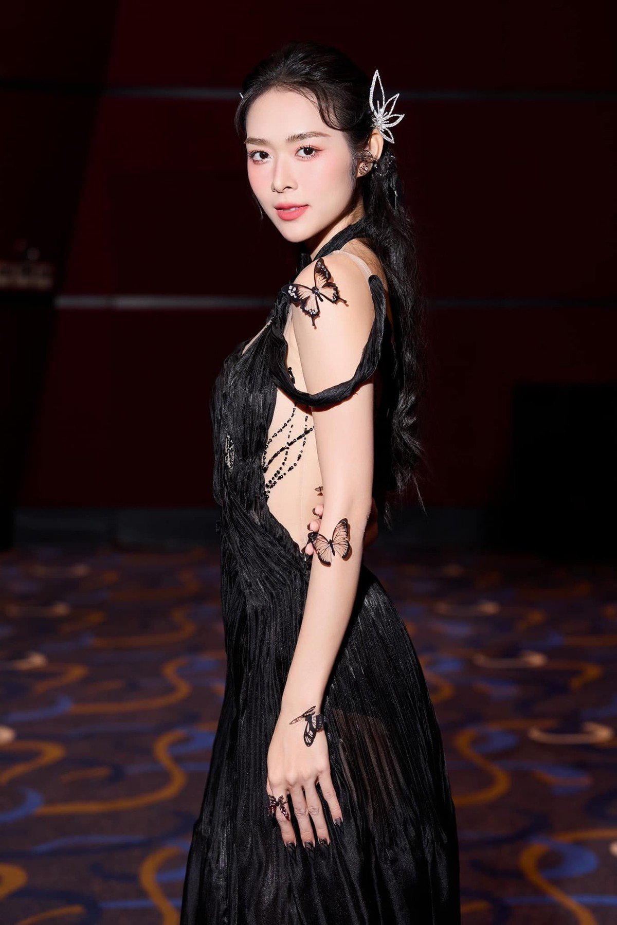 This photograph captures a captivating moment of actress Diep Bao Ngoc radiating elegant and alluring beauty. She wears a sophisticated black strapless dress that accentuates her graceful figure and fair skin. The vibrant red lipstick and neatly styled updo highlight the harmonious features of her face. Diep Bao Ngoc showcases her regal charm with sparkling pearl jewelry and a confident luxurious demeanor. This image not only reflects her sophisticated fashion style but also affirms the timeless beauty of the actress. Her graceful poise and professional presence in every gesture help her always shine and attract every gaze.