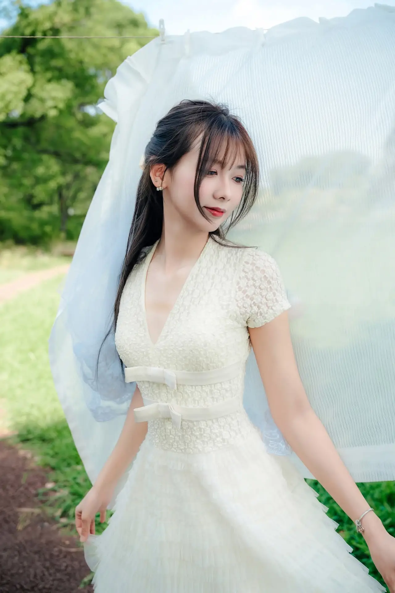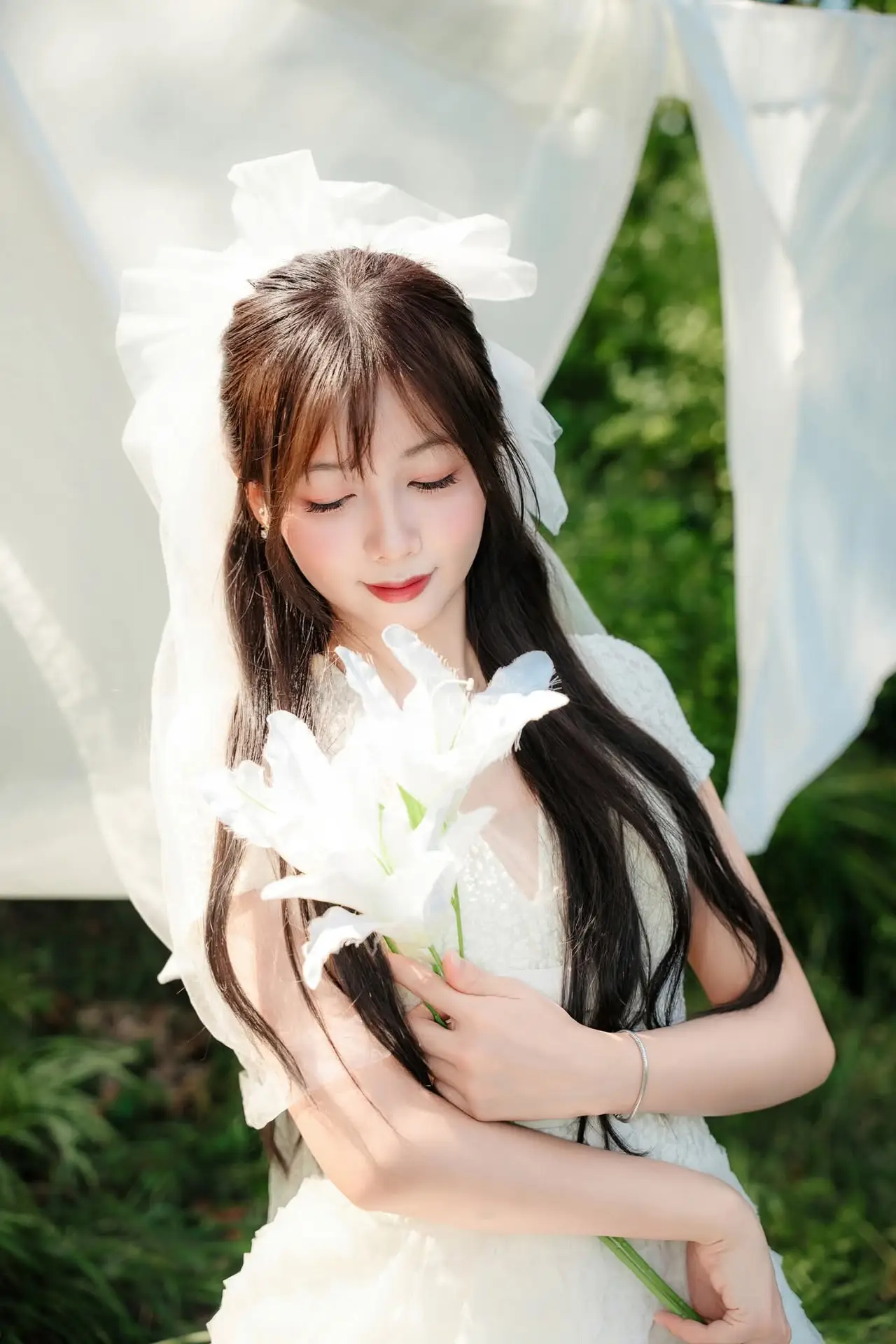 This stunning portrait captures the pure and graceful beauty of a young woman. Dressed in an elegant white gown, she radiates innocence and tenderness. Her long, flowing dark hair is adorned with a large white bow, further enhancing her youthful and pristine charm. Holding a delicate bouquet of white lilies, symbols of nobility and pure love, her eyes gaze dreamily towards the camera, creating an emotionally captivating moment. The lush green background, complemented by flowing white fabric, adds to the romantic and ethereal ambiance of the photograph. This is more than just a picture; it's a timeless narrative of beauty, serenity, and undeniable grace.#PureBeauty #WhiteDress #Lilies #GracefulPortrait #ArtisticPhoto