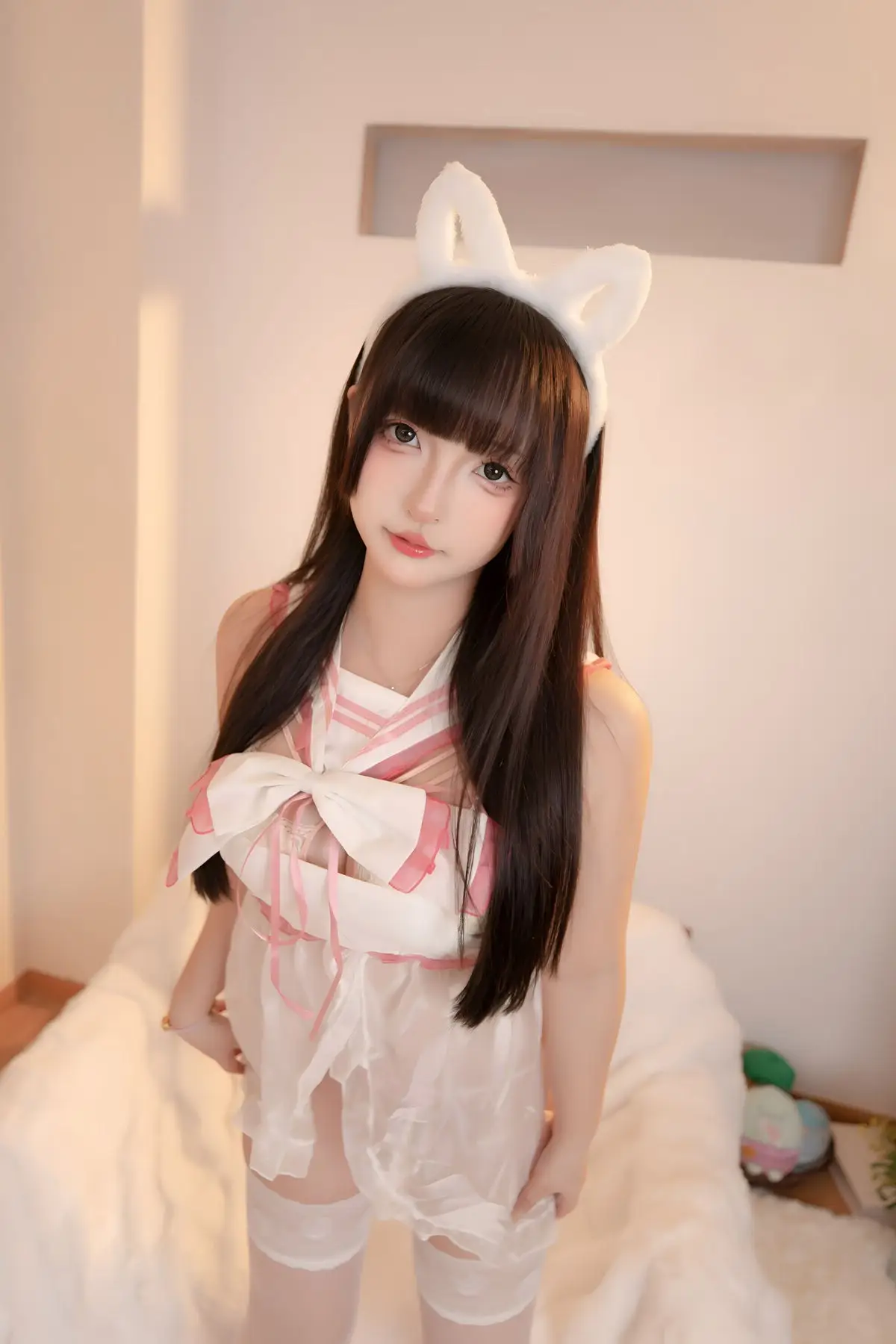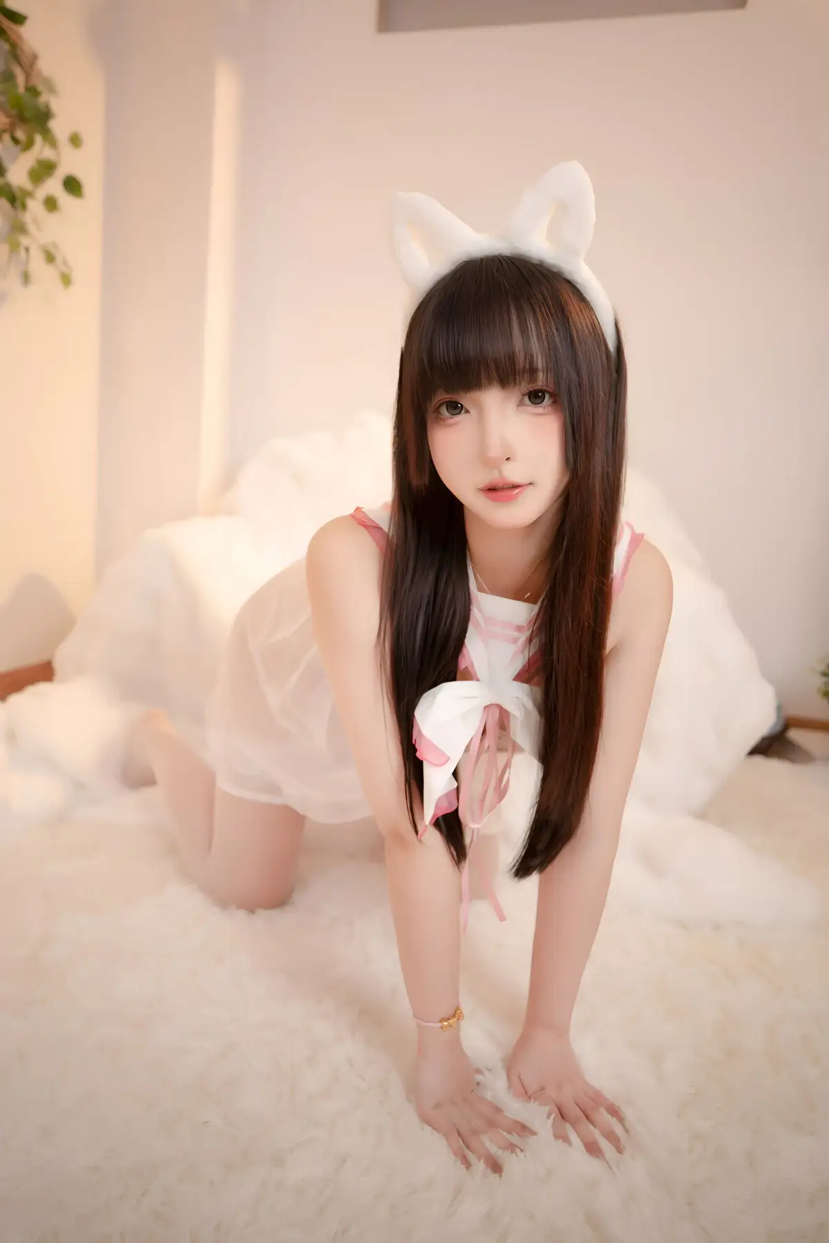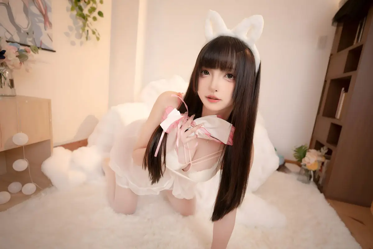 In this captivating image, Coser Kagurazaka Mafuyu brilliantly transforms into the White Cat Princess, exuding an incredibly sweet and pure aura. She appears in a soft, pristine white outfit resembling cat fur, paired with matching long stockings that accentuate her graceful figure and slender legs. With a gentle expression and captivating eyes, Kagurazaka Mafuyu skillfully conveys the charming and alluring essence of a cat princess. The pure white background further highlights her pristine and dreamlike beauty, creating a romantic and enchanting scene. This is undoubtedly an impressive cosplay photoshoot showcasing Kagurazaka Mafuyu's talent and charisma.#Coser #Kagurazaka #Mafuyu #WhiteCatPrincess #Cosplay #AsianModel #PureBeauty