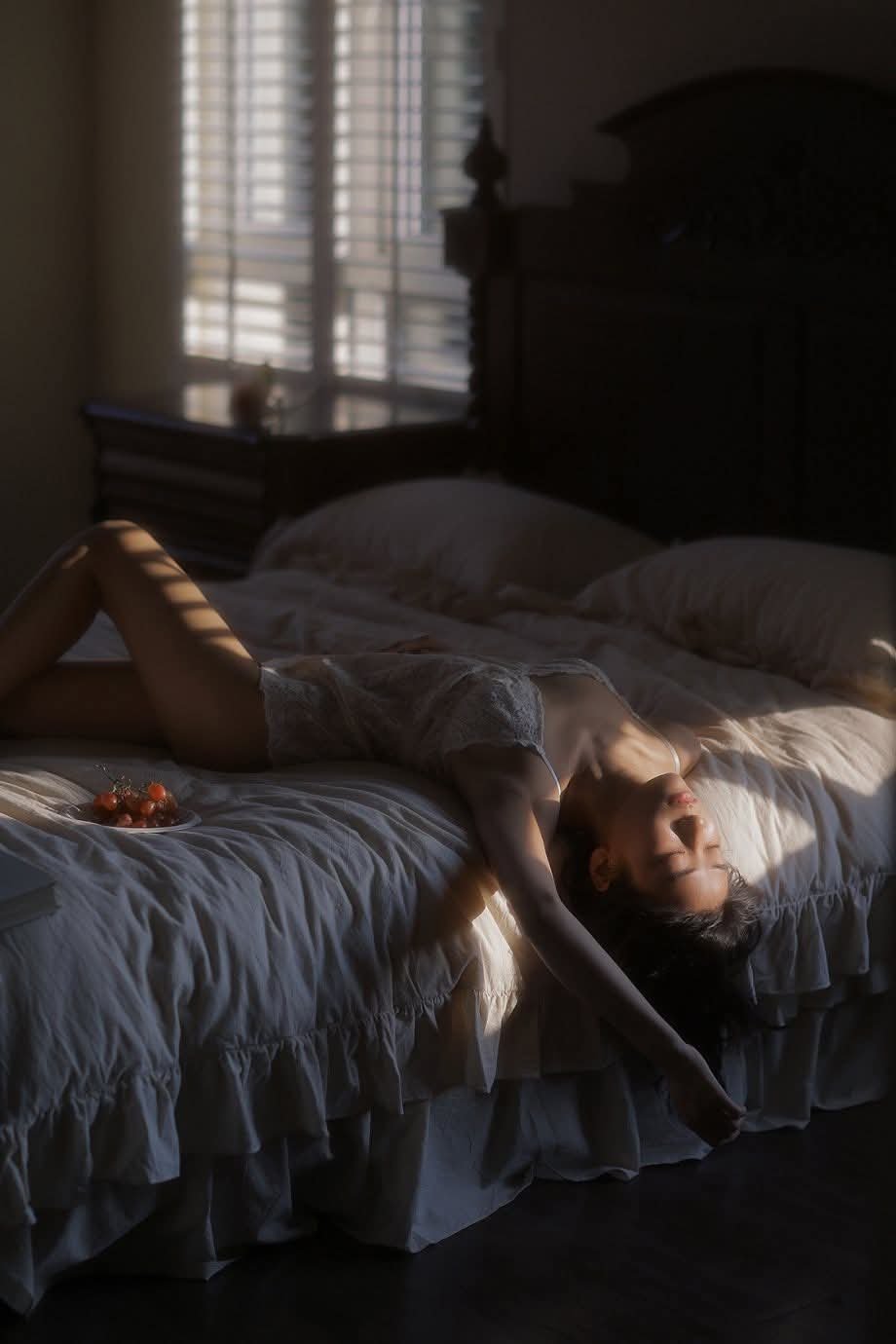 The image XVG No5 captures a delicate piece of artistic photography depicting an intimate and emotional private moment A woman lies relaxed on a bed with soft window light creating mystical patterns of light and shadow Natural beauty and serenity emanate from every detail from her body lines to the quietude of the room This is not just an image but a story of inner tranquility and celebrated femininity Light plays a dominant role highlighting vulnerability and allure in a truly artistic manner This photograph evokes contemplation about rare peaceful moments in modern life A vivid painting of calm and timeless beauty
