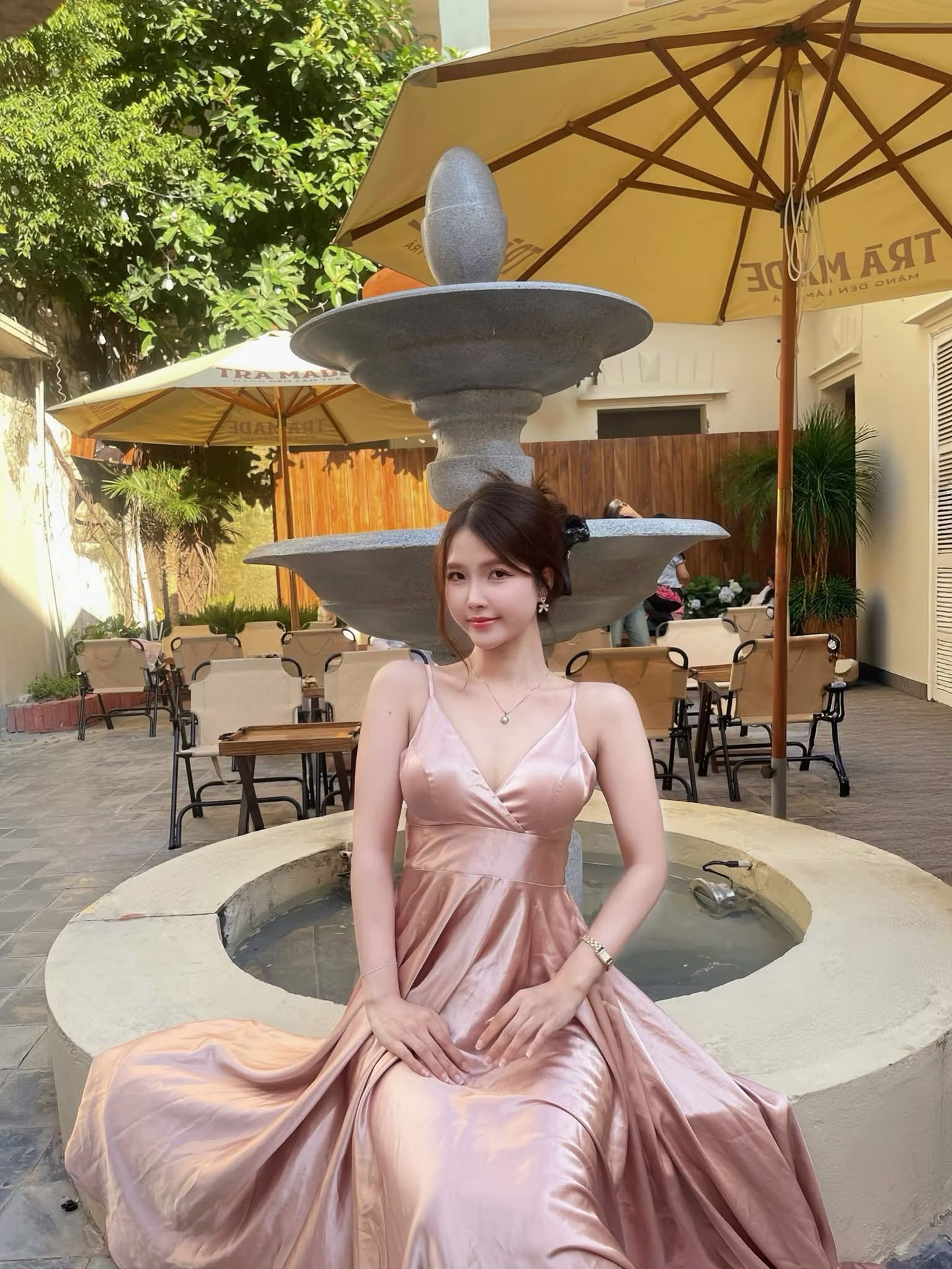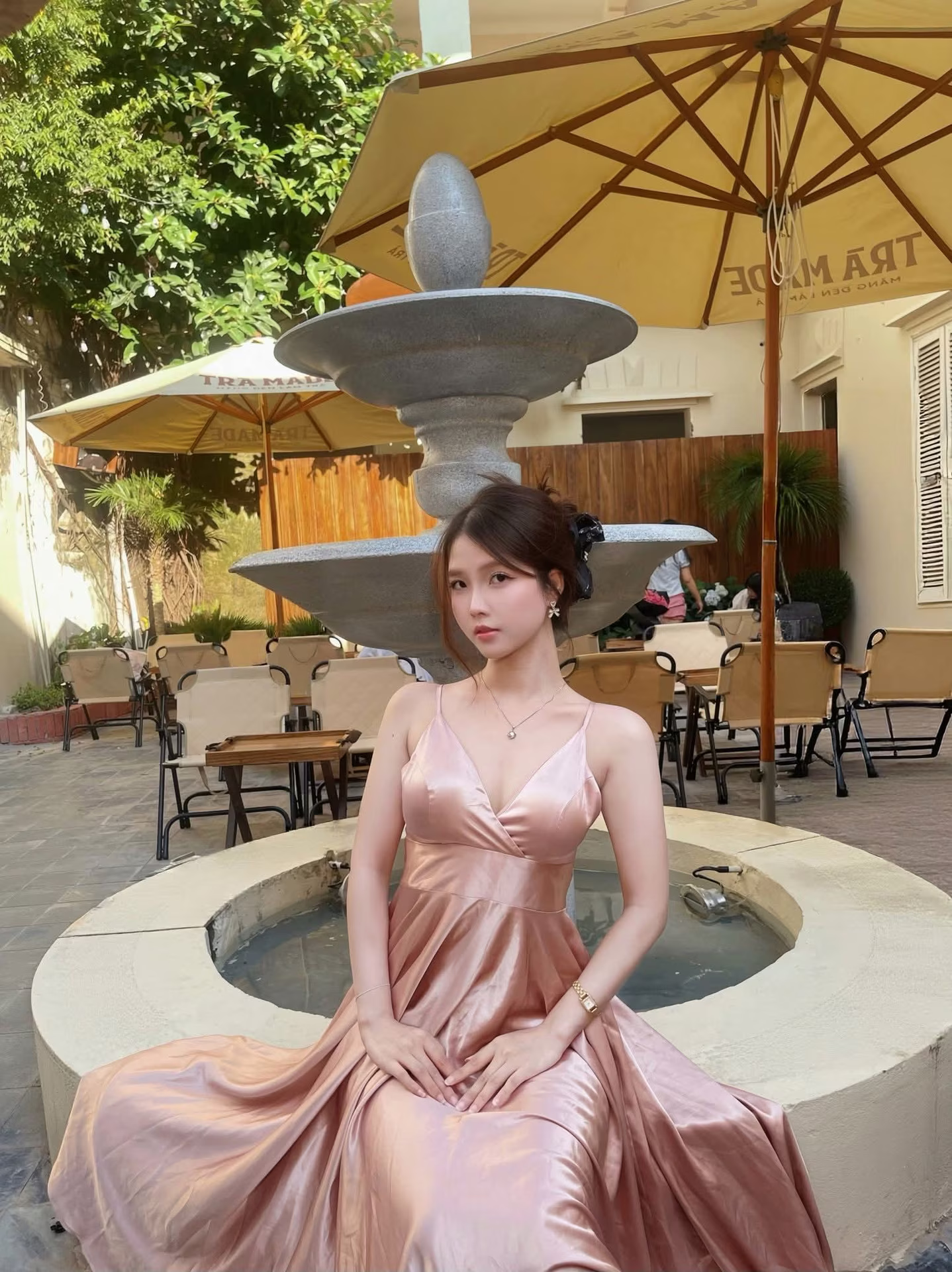Image VGU No.72 portrays a young woman with a poetic and gentle beauty. She sits gracefully by an antique fountain, adorned in a soft pink silk dress, creating a truly dreamy image. Her clear eyes and gentle smile exude elegance and allure. The pink silk attire enhances her graceful figure, blending harmoniously with the romantic backdrop of the fountain, bringing a sense of peace and captivating charm. This moment beautifully preserves the natural, vibrant, and irresistible grace of the young lady. #Vietnamese #pretty #charmFB_IMG_1761297312624: Hanfu Muse Amidst Blooming Flowers - Discover Pure & Romantic East Asian Beauty.