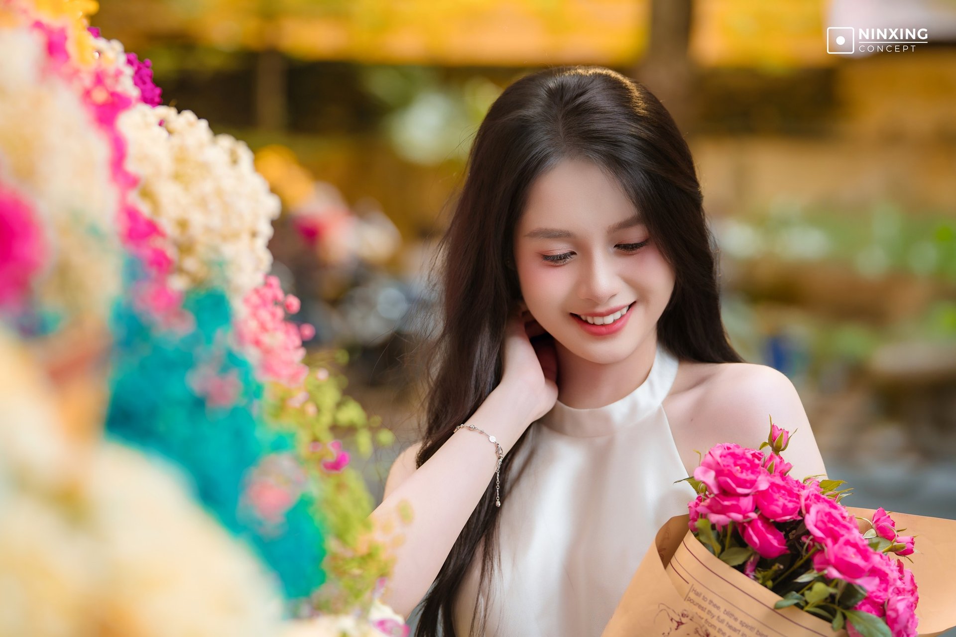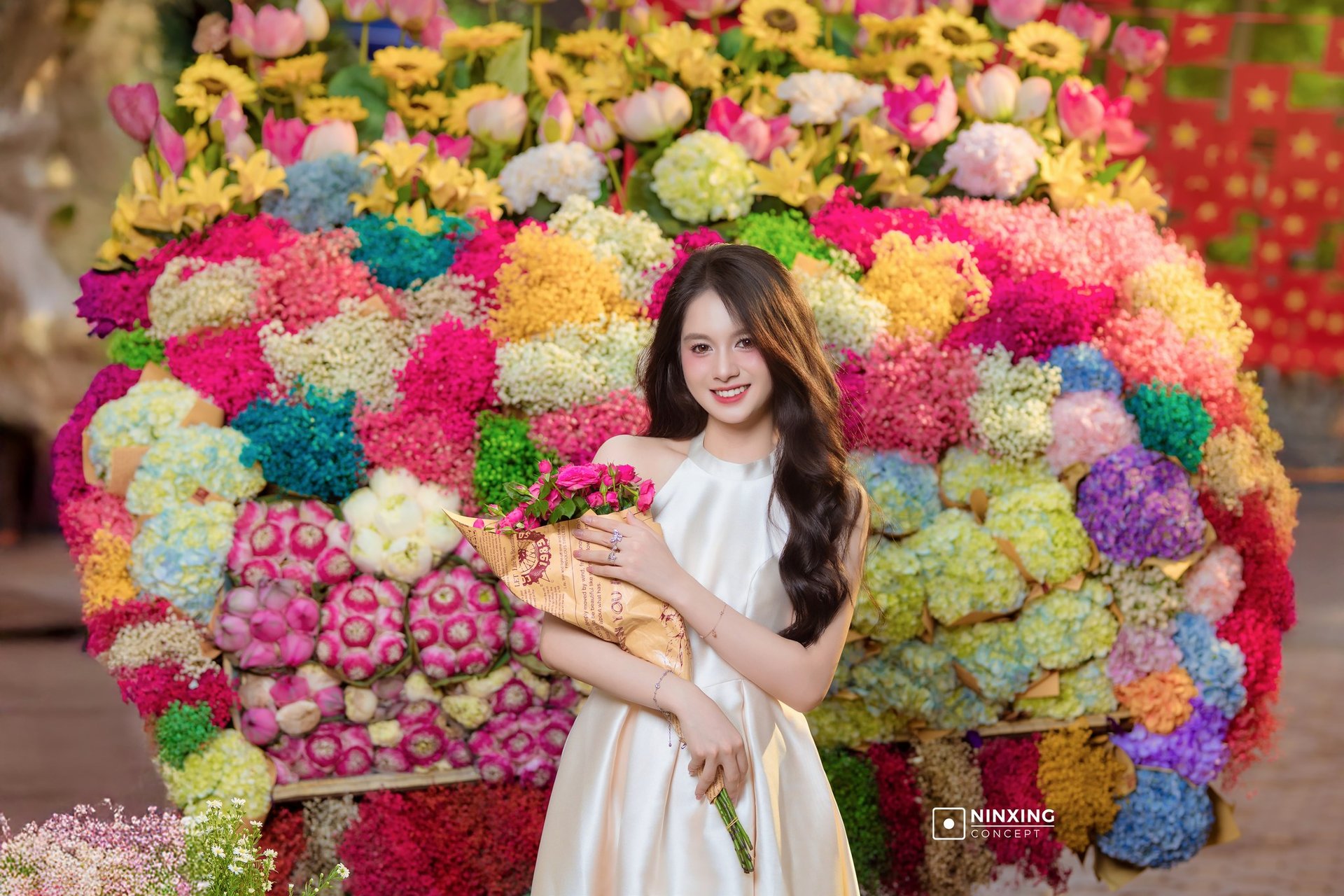 This stunning photo captures the radiant moment of a graceful Vietnamese girl amidst a space overflowing with colorful flowers. Her bright smile and sparkling eyes blend perfectly with the vibrant floral backdrop creating a scene full of life. Thousands of flowers in various hues from pink yellow blue to purple are skillfully arranged offering a delightful visual feast. The girl in her pristine white dress delicately holds a bouquet of roses exuding an elegant and gentle beauty. This is not just an image of people and natural beauty but also a symbol of freshness joy and optimism. This moment will surely brighten every soul.