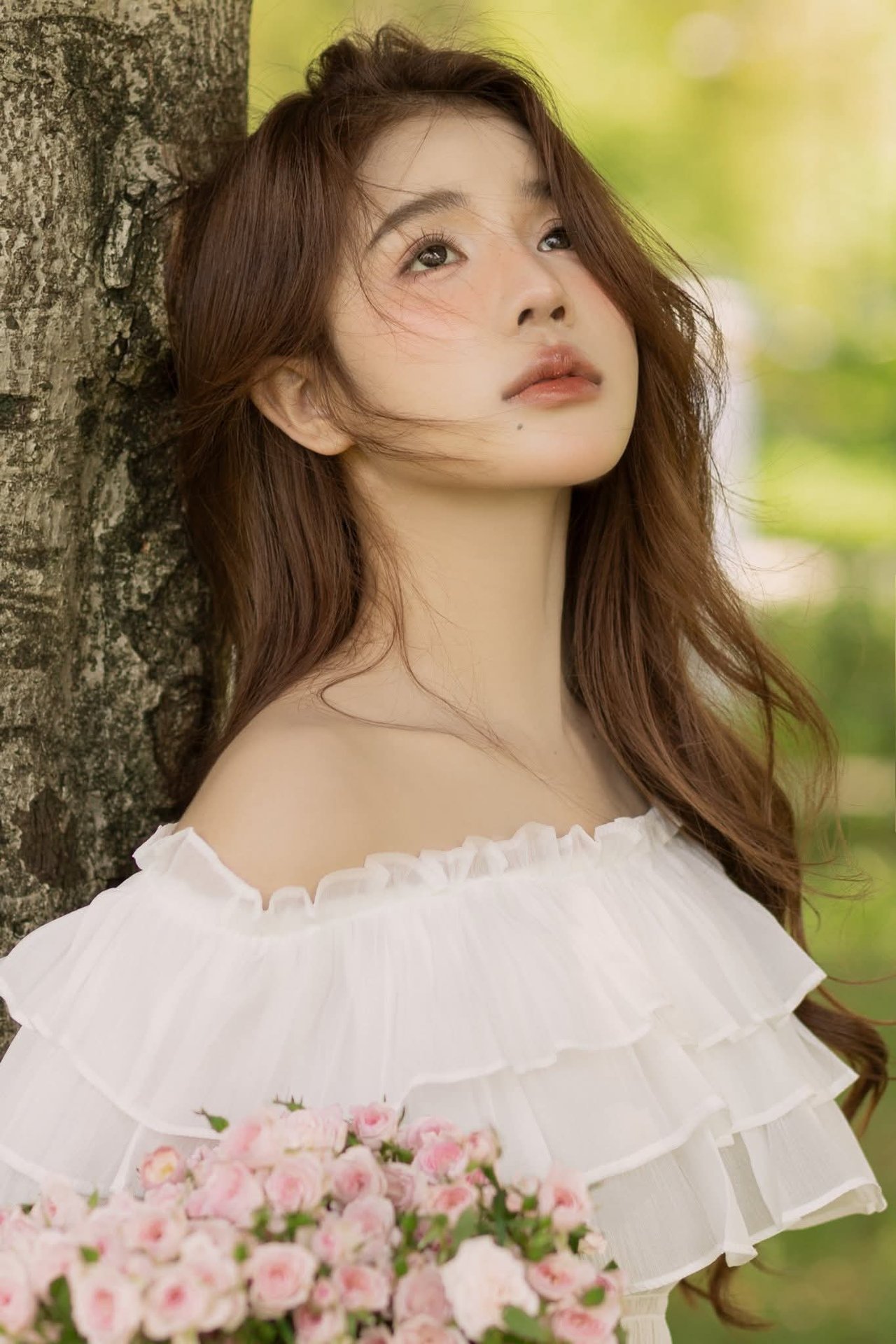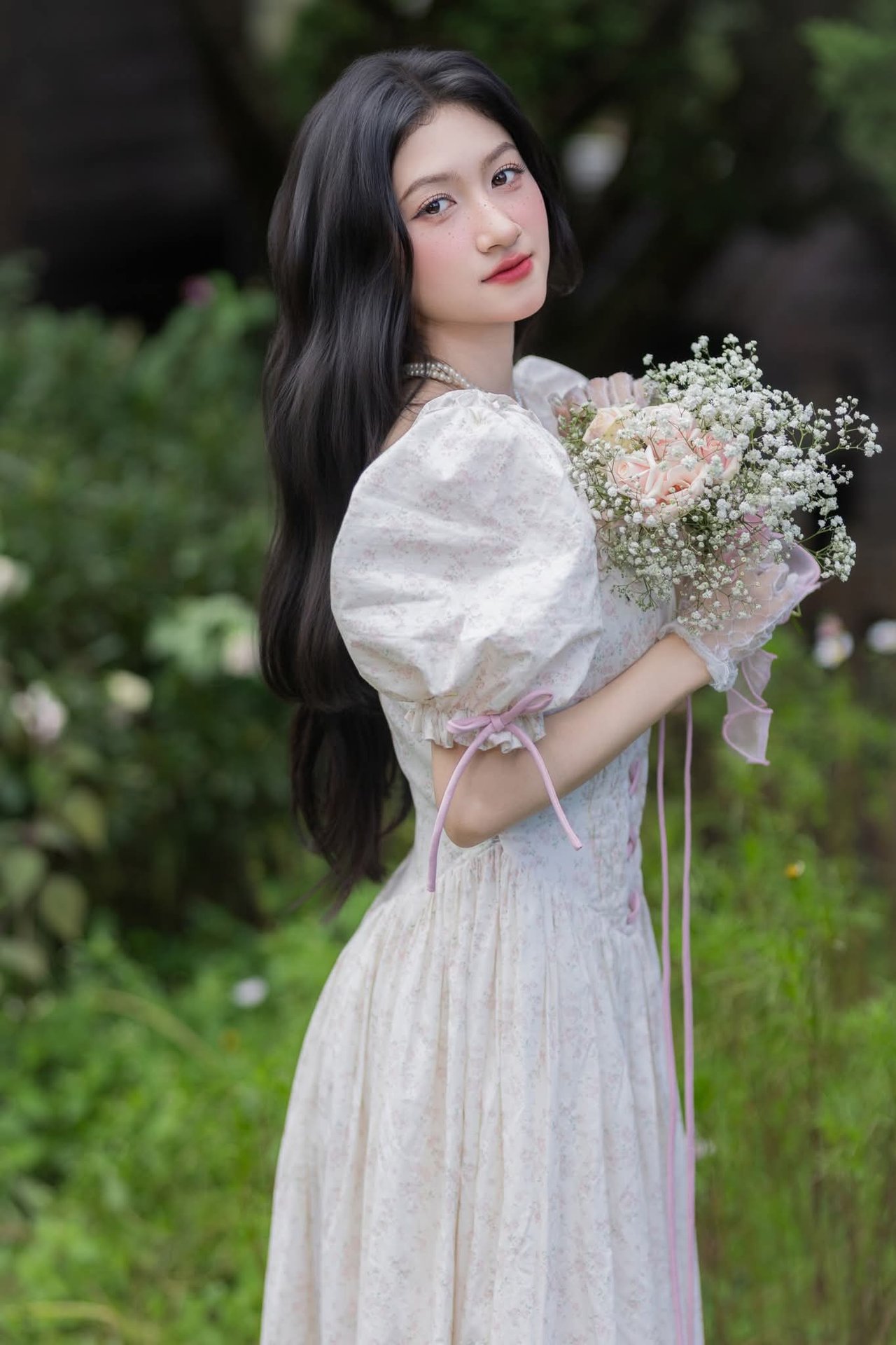 Image 1000019683 captures a gentle moment of a young woman in a pristine white dress. Her elegant beauty is accentuated by the soft off-shoulder design, exuding femininity and grace. Held in her arms is a fresh bouquet of small pink roses, adding a romantic touch to the scene. The lush green backdrop of the grass and verdant trees creates a fresh, peaceful natural setting. This image perfectly blends human charm with the refreshing essence of summer, evoking feelings of lightness, relaxation, and vitality. It serves as a wonderful inspiration for summer fashion style.Elegant Beauty: Gentle Girl in Vintage Dress Amidst Dreamy Flower Garden