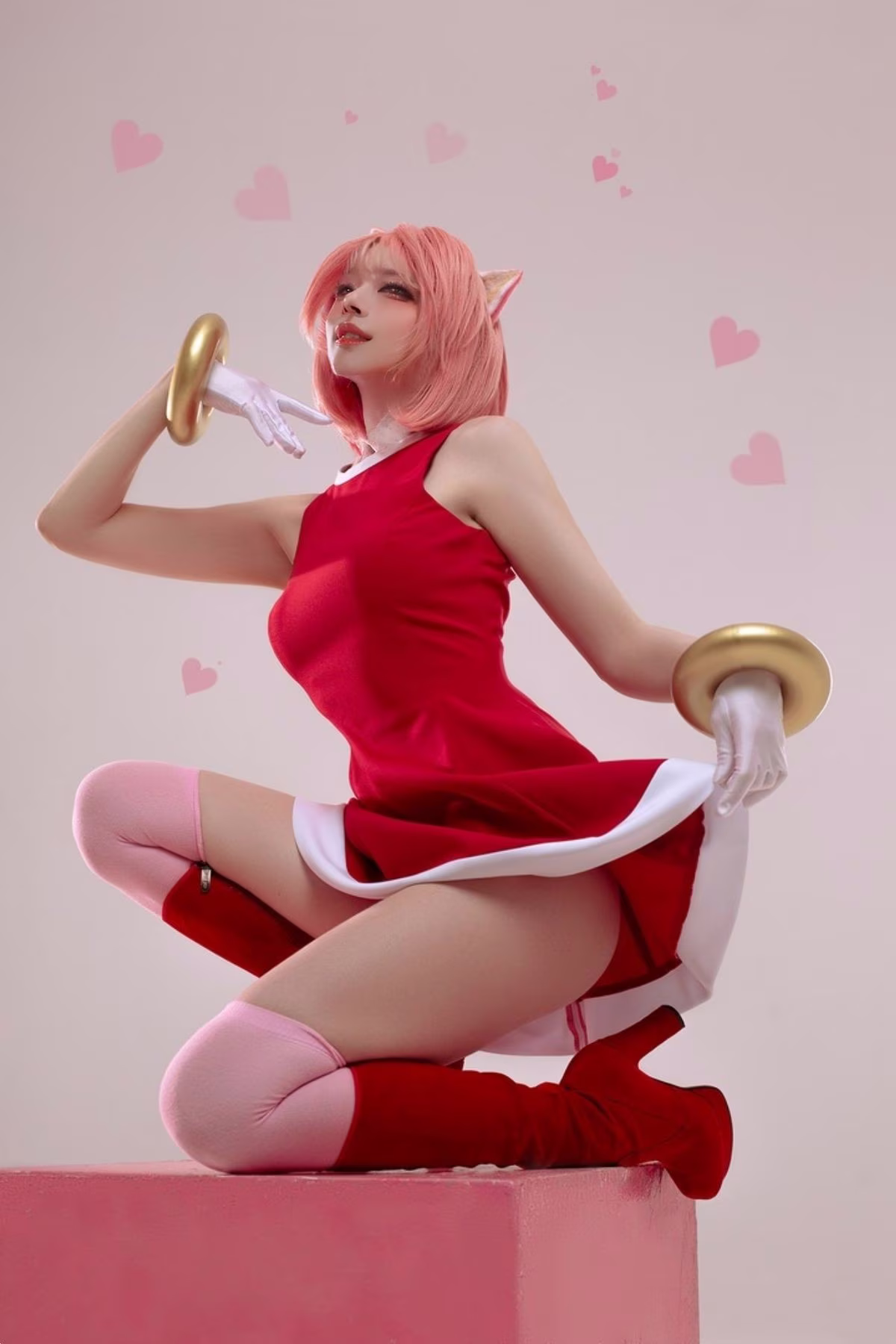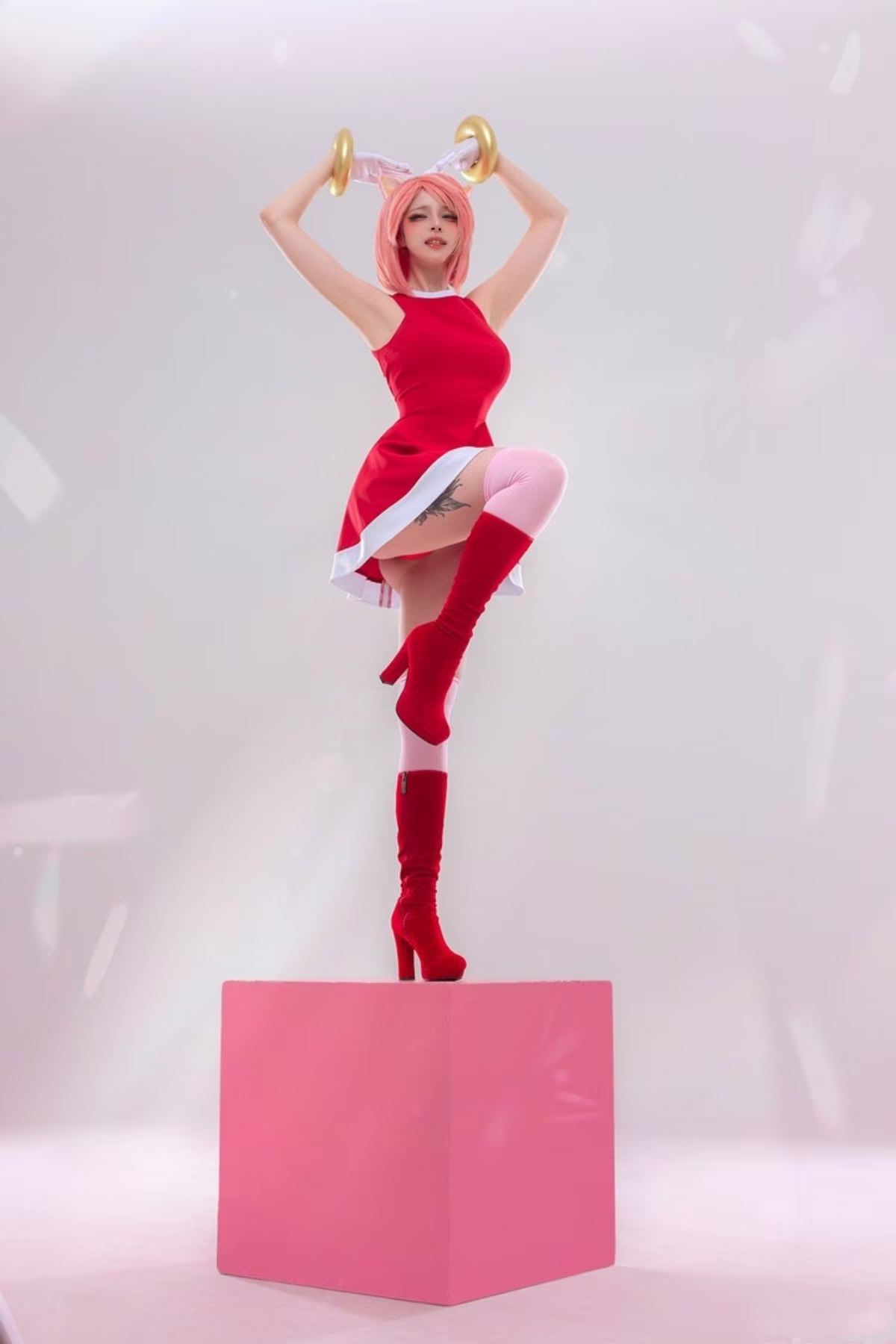 Immerse yourself in the vibrant world of gaming with Coser 暴走鲤鱼王's outstanding and energetic portrayal of Amy Rose. Featured in the 12月合集 Part05 collection she brings the iconic Sonic the Hedgehog character to life with a stunning red dress stylish high boots and signature golden accessories. Every detail is meticulously crafted from the sweet pink hair to the cheerful expression perfectly embodying Amy's charming yet determined spirit. With a dynamic and captivating pose Coser 暴走鲤鱼王 not only recreates but also infuses a lively essence into Amy Rose inviting viewers to marvel at this unique and engaging photo set and explore more from the collection.Gentle Beauty: Girl in Pristine White Dress with Pink Rose Bouquet Amidst Nature, Elegant Summer Style 1000019683