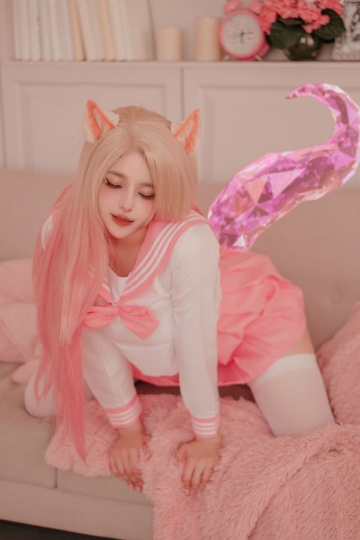 Discover the enchanting charm of Coser Bao Zou Li Yu Wang in her 12月合集 Part09 collection She embodies a delightful schoolgirl persona adorned in a sweet pink and pristine white sailor uniform The meticulously designed outfit features an adorable bow and playful cat ears enhancing her captivating cuteness Elegant white thigh-high stockings further accentuate her graceful silhouette and signature kawaii style Set against a cozy living room backdrop with a bookshelf this scene perfectly complements Bao Zou Li Yu Wangs vibrant and youthful allure This photoshoot beautifully captures her exquisite costume choice and graceful expressive ability offering viewers a delightful and emotionally resonant visual experience