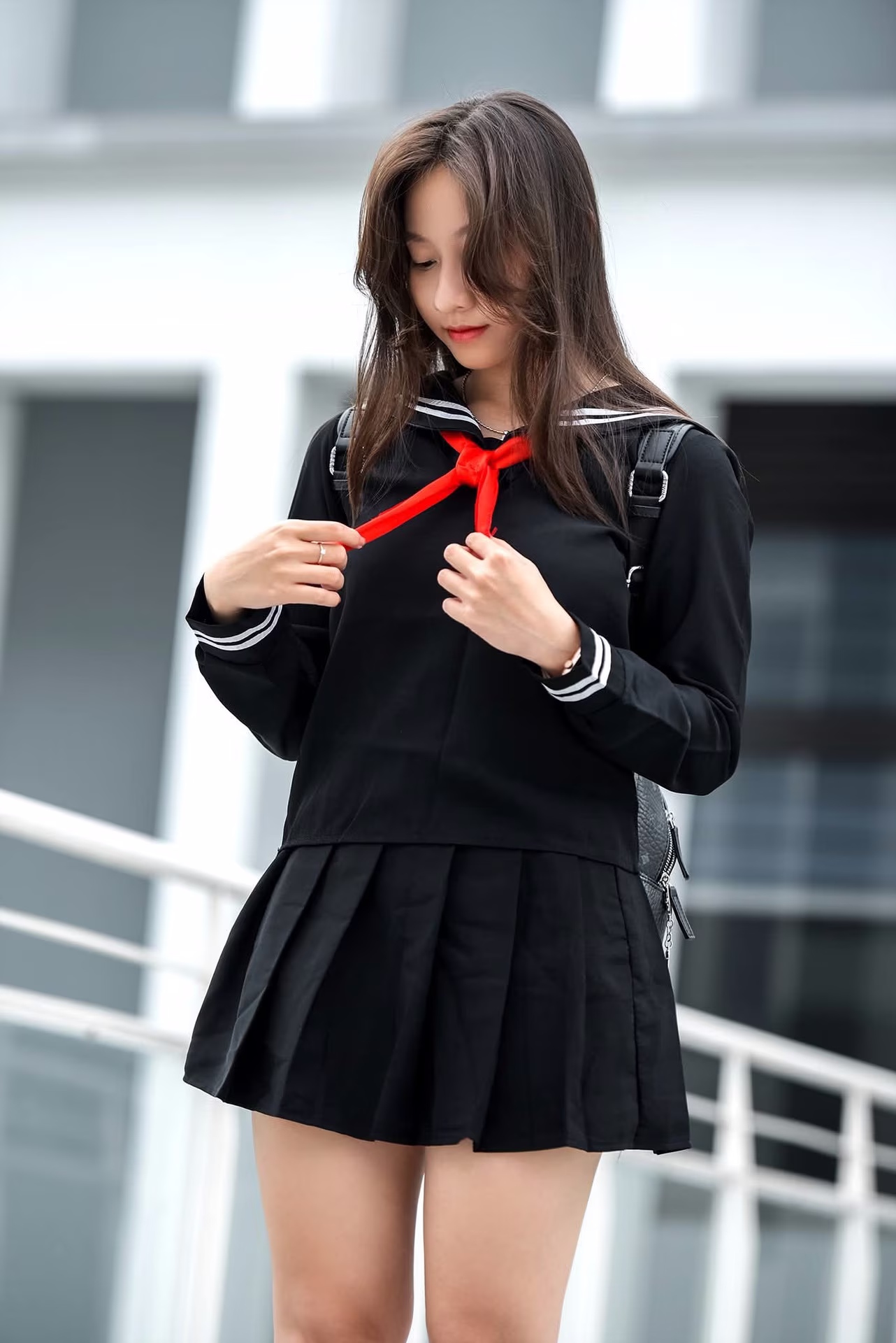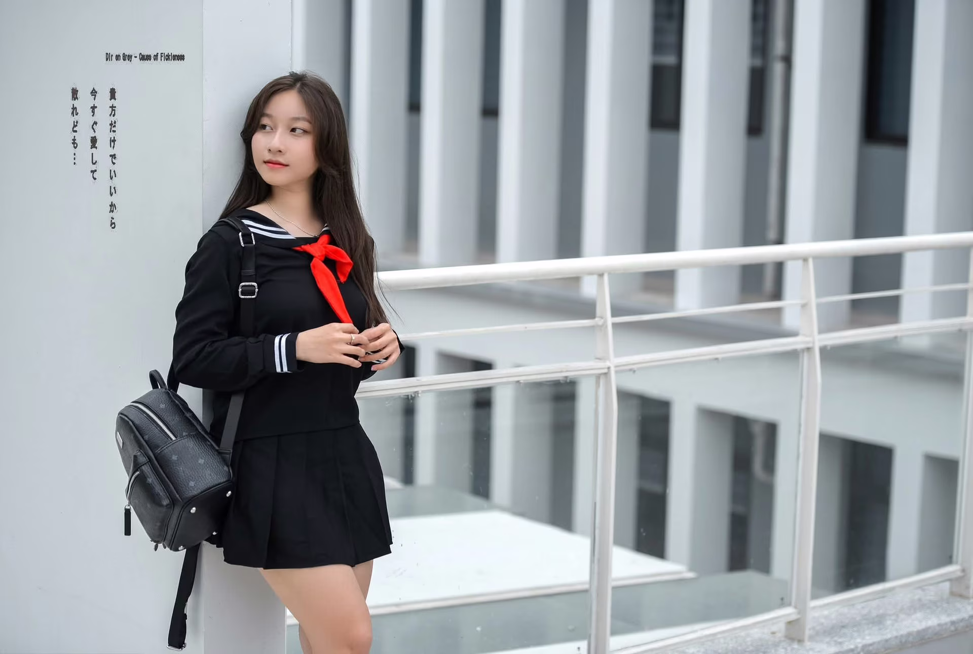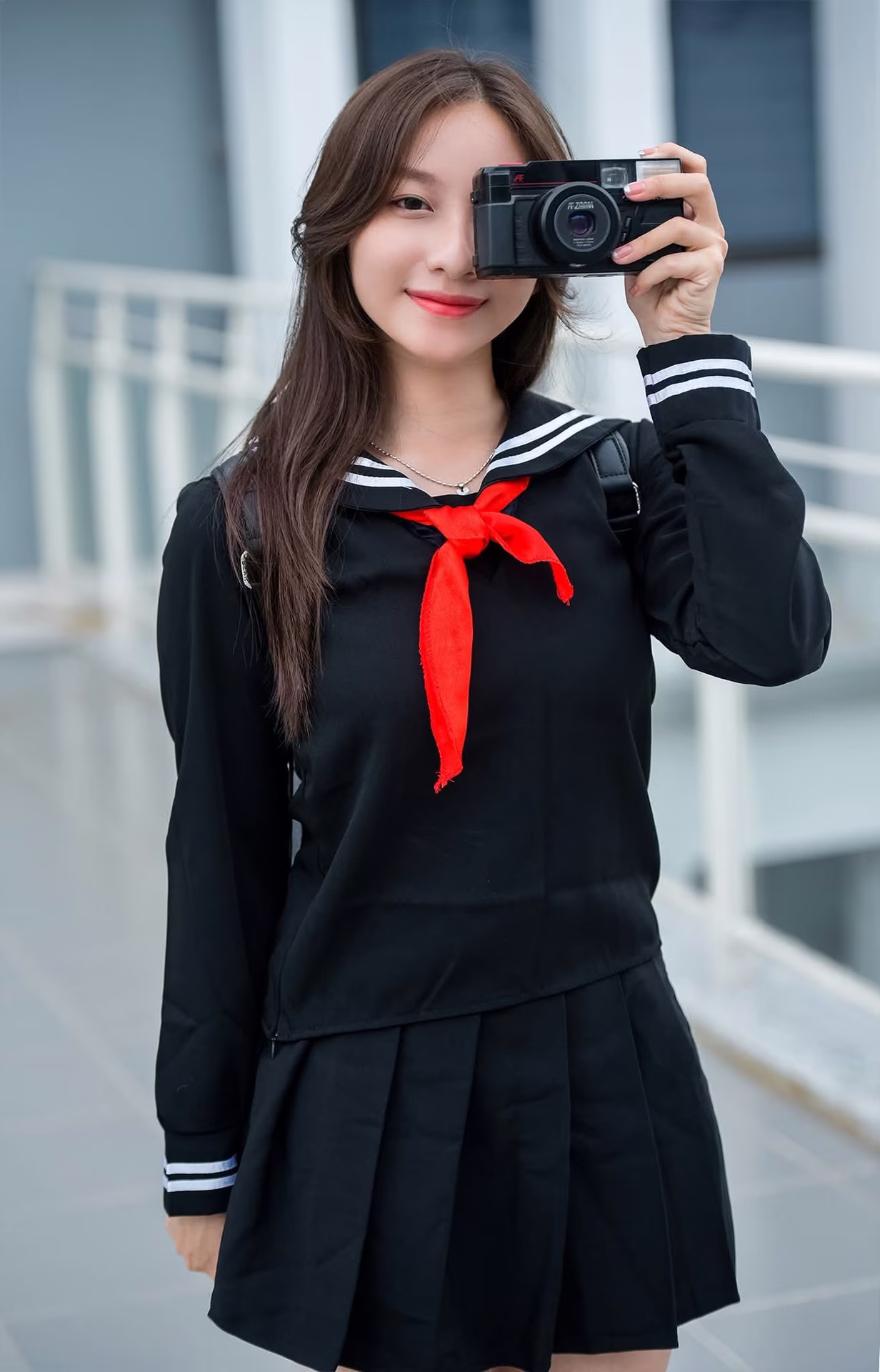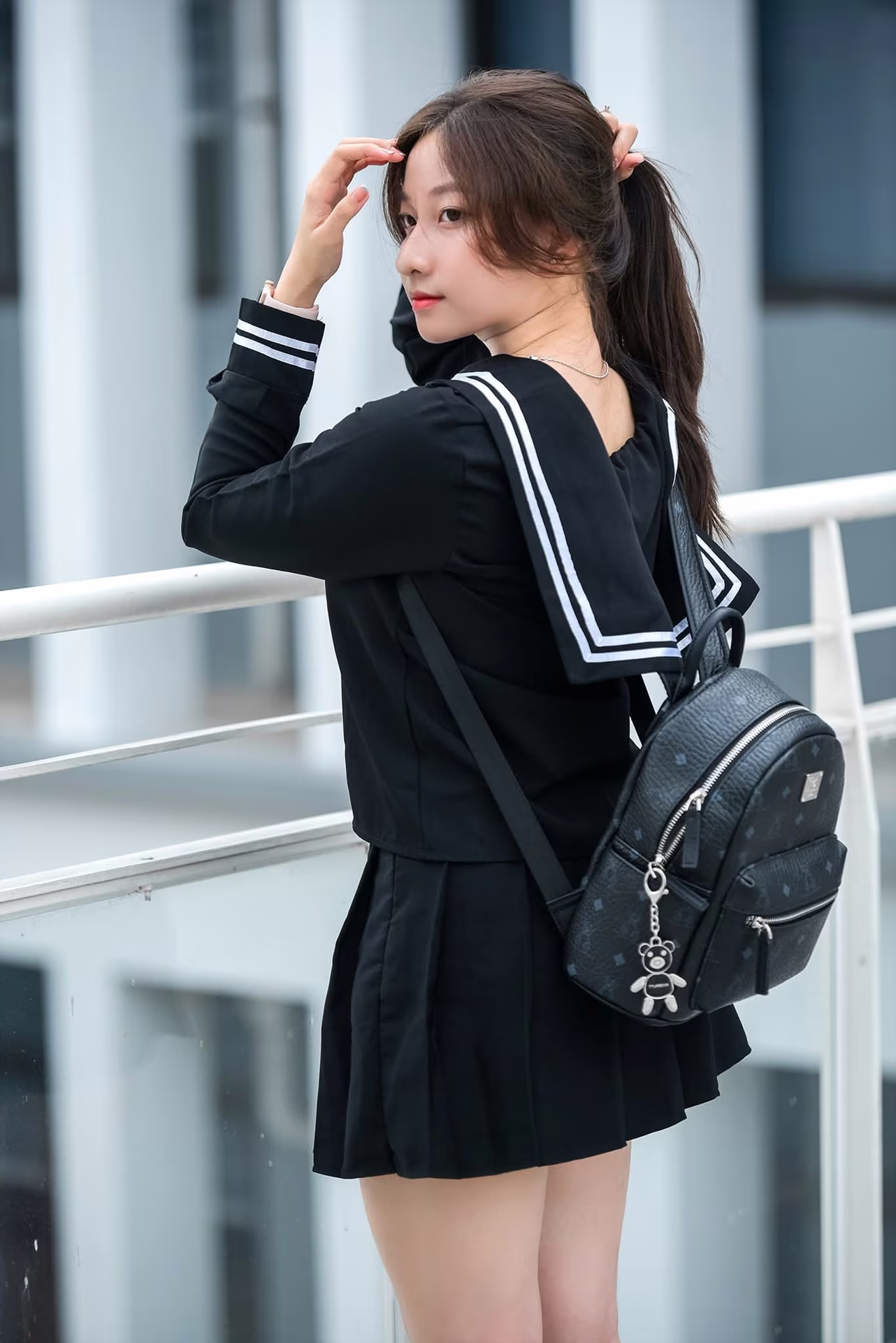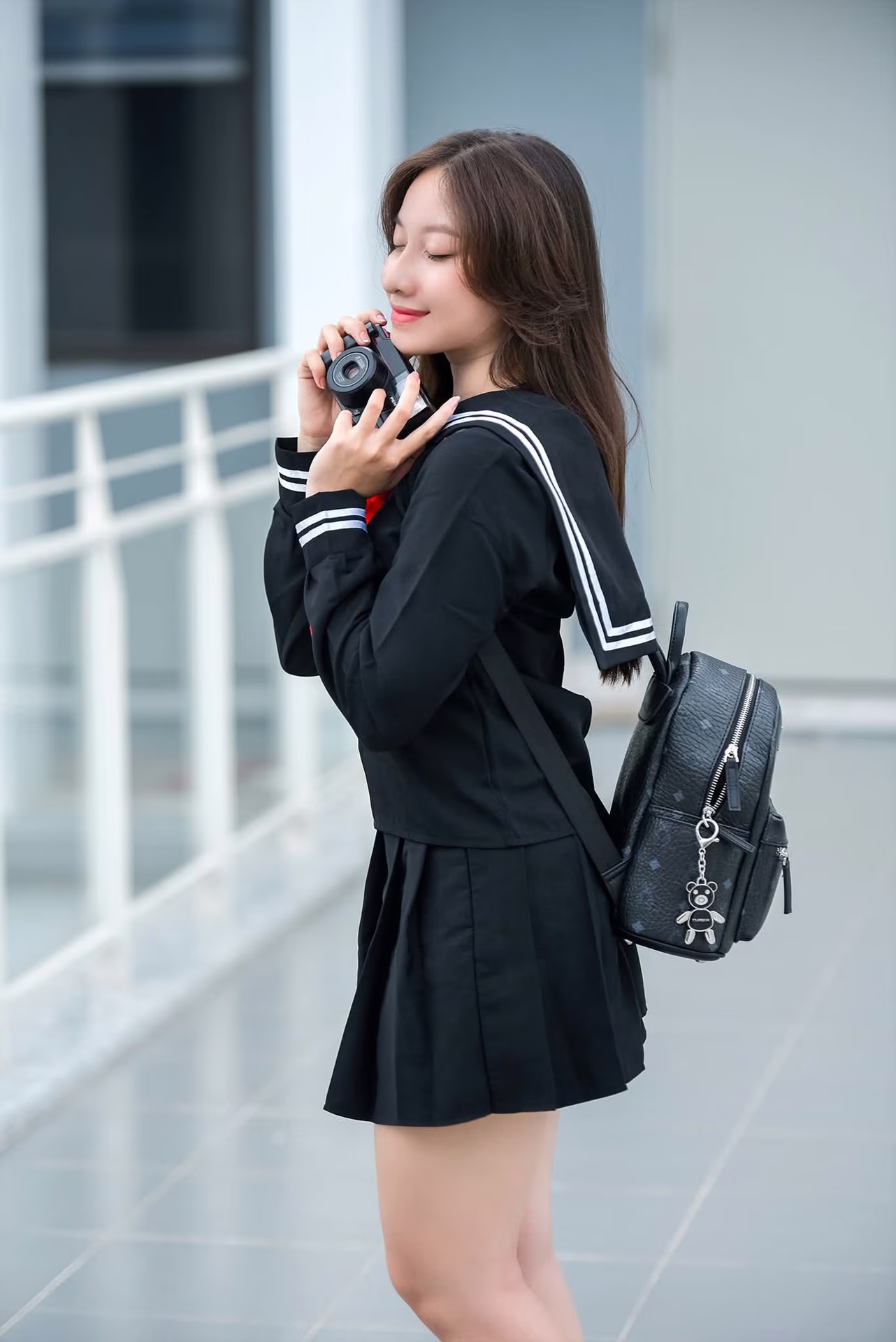 VGU No.17 captures a fresh moment of a youthful student on the VGU campus. The girl exudes a dynamic and confident charm with her modern school style. Her black sailor-collar top paired with a pleated skirt and a fashionable backpack creates a harmonious and striking ensemble. The distinctive platform shoes and white socks further enhance the unique flair of her outfit. Her gentle smile and radiant eyes reflect the vibrant spirit of youth. This image is not just a beautiful portrait but also symbolizes the youthful energy and dynamism of VGU students. #Vietnamese #pretty #charm