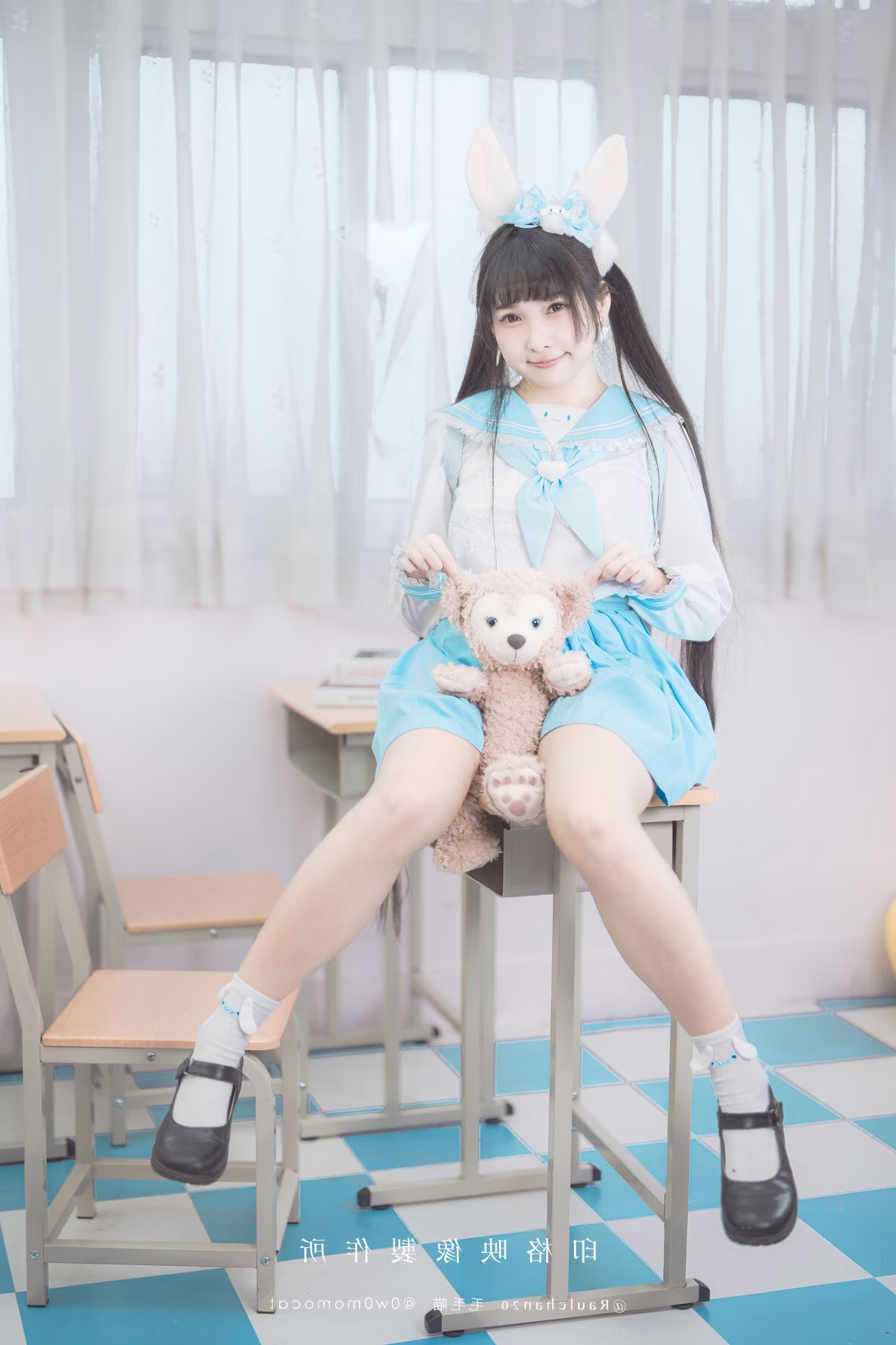 In this captivating photoshoot, Coser Mu Mu Momo beautifully embodies the sweet and utterly adorable Cinnamoroll. Dressed in a classic blue and white sailor uniform, complemented by soft bunny ears, Mu Mu Momo radiates a pure and innocent charm. Her gentle smile and tender gaze create an enchanting image, evoking nostalgic memories of youthful school days. The simple school setting further accentuates the pristine beauty of this real-life Cinnamoroll. This collection is sure to captivate viewers with the delightful cuteness and graceful appeal of Coser Mu Mu Momo.