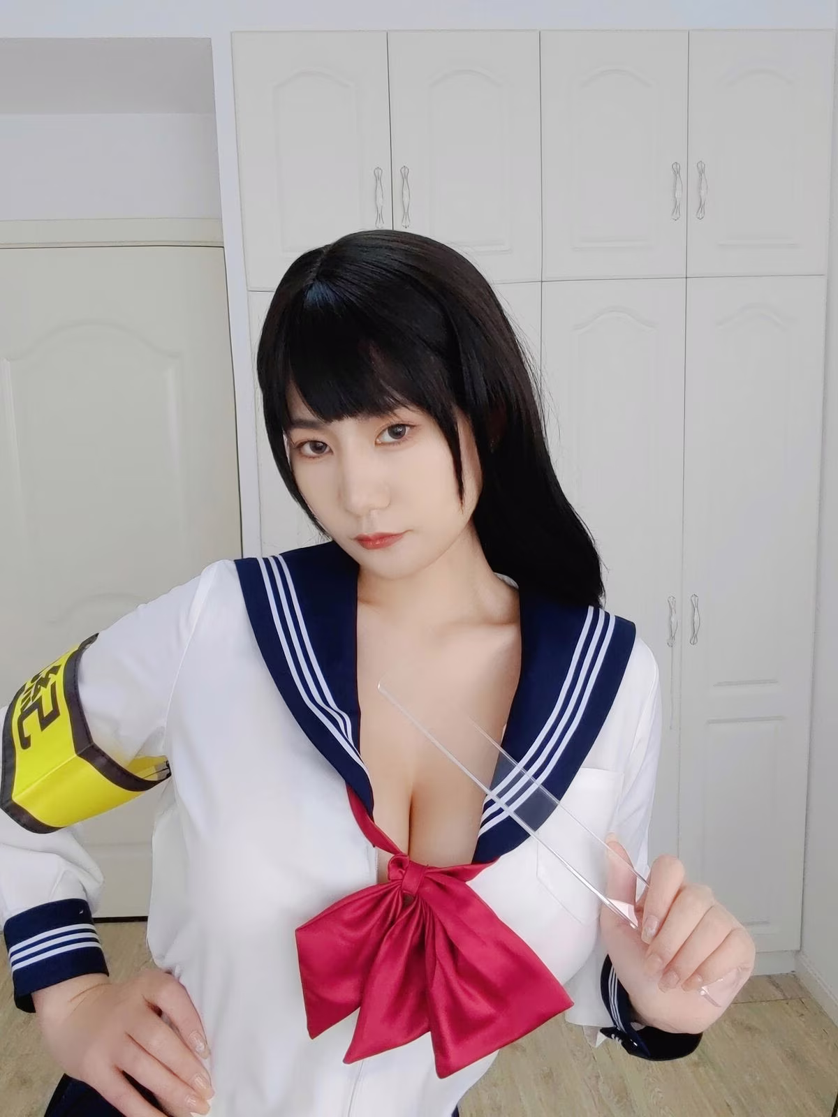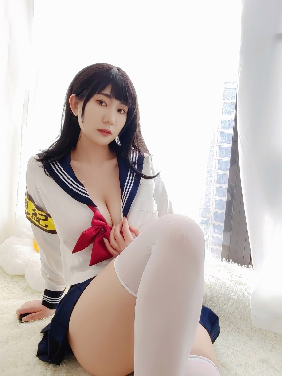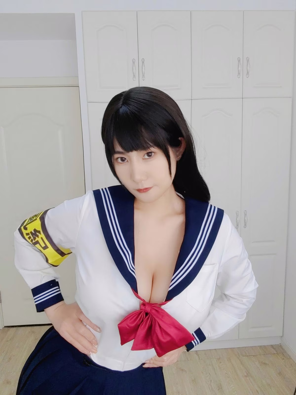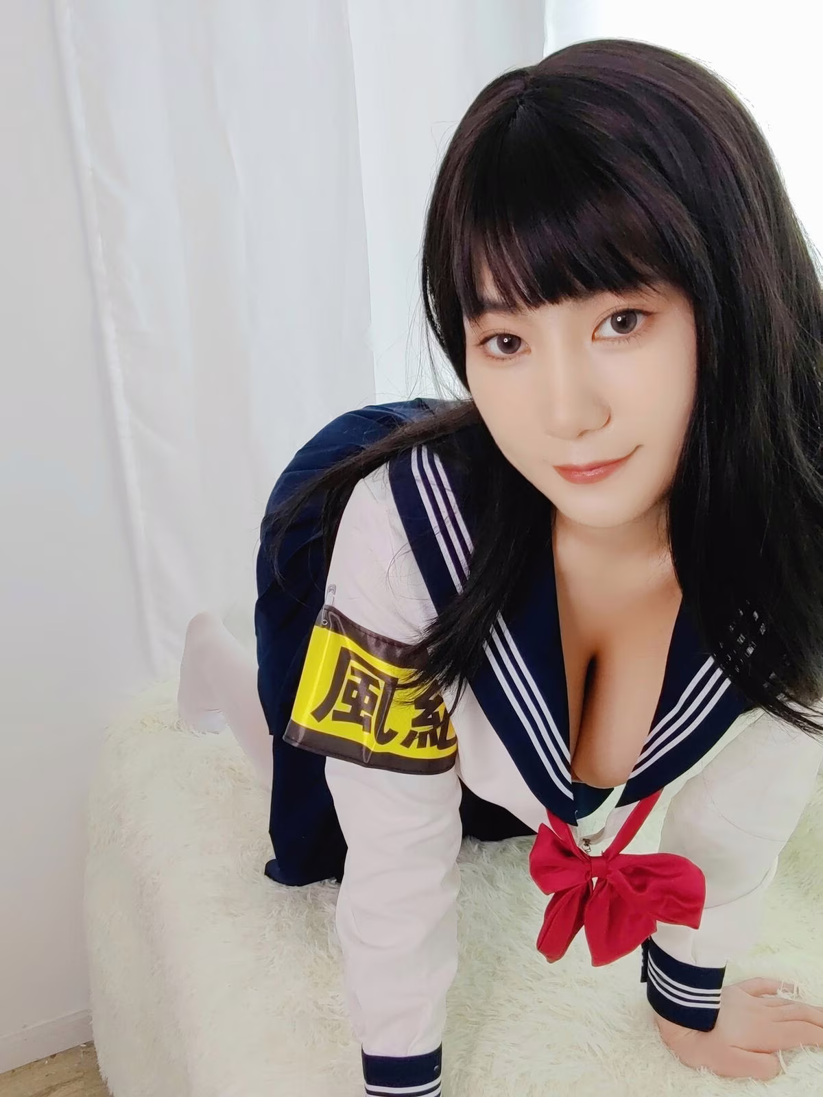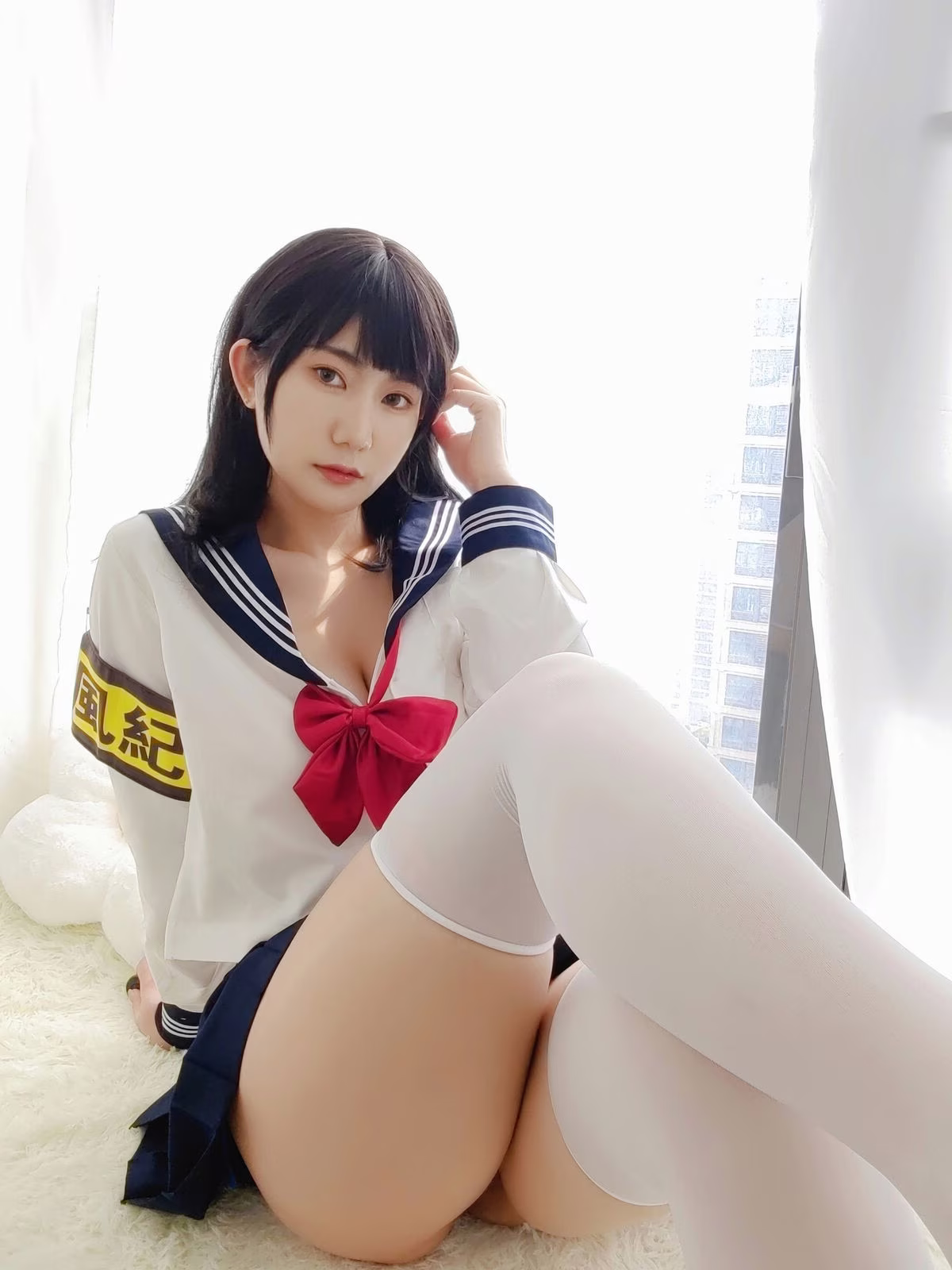 Coser Xing Lan Shi Lan Lan Jiao Lan Mei Ya captivates as a Fūki Iin, presenting an irresistibly charming school-themed image. Dressed in a pristine white sailor uniform with a deep navy collar and a vibrant red bow, she exudes a delicate balance of innocence and allure. The distinctive yellow armband, a symbol of the disciplinary committee, highlights her character's role. With her captivating gaze and a pose that blends confidence with gentle charm, Xing Lan Shi Lan Lan Jiao Lan Mei Ya perfectly embodies the essence of an exemplary yet undeniably attractive student. This stunning cosplay not only celebrates youthful beauty but also sparks curiosity about the story behind this intriguing Fūki Iin character. An impressive and eye-catching cosplay masterpiece.