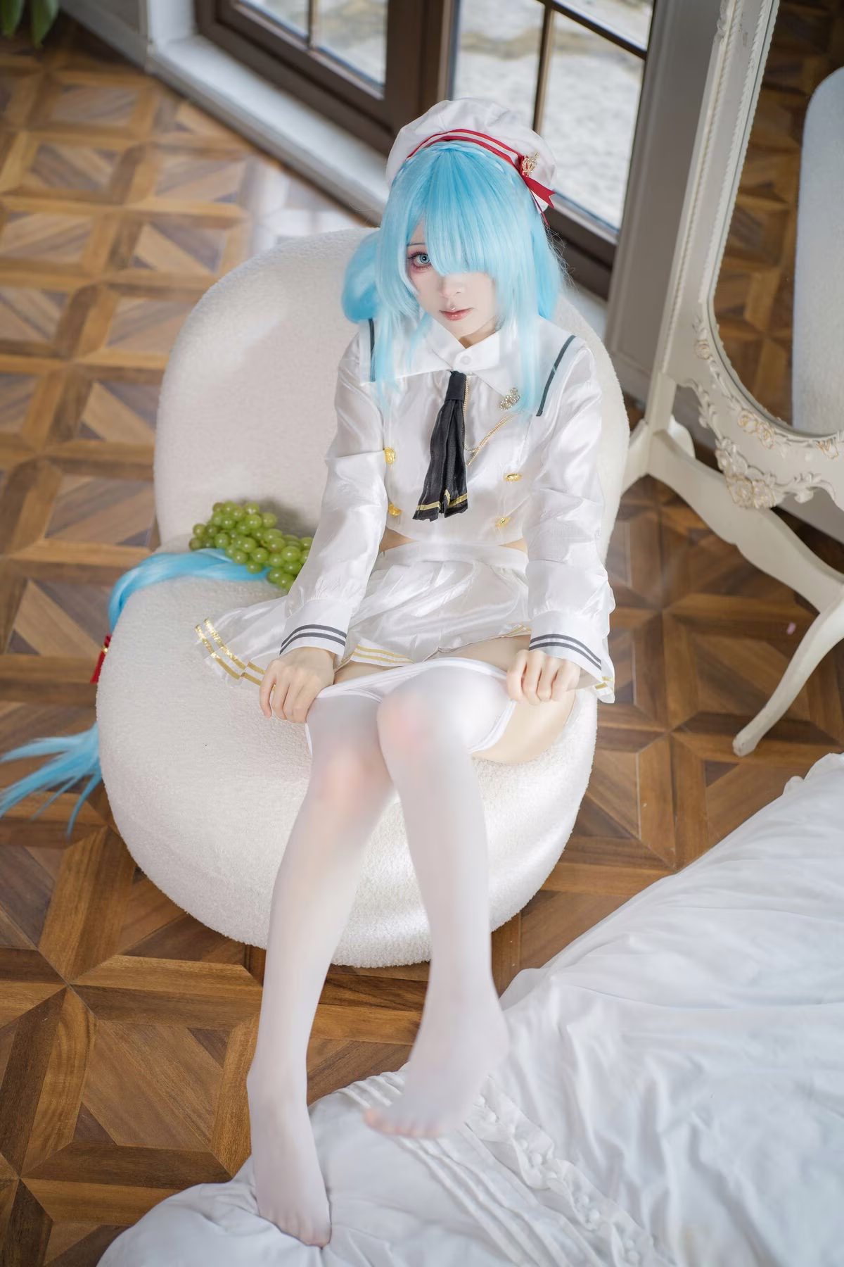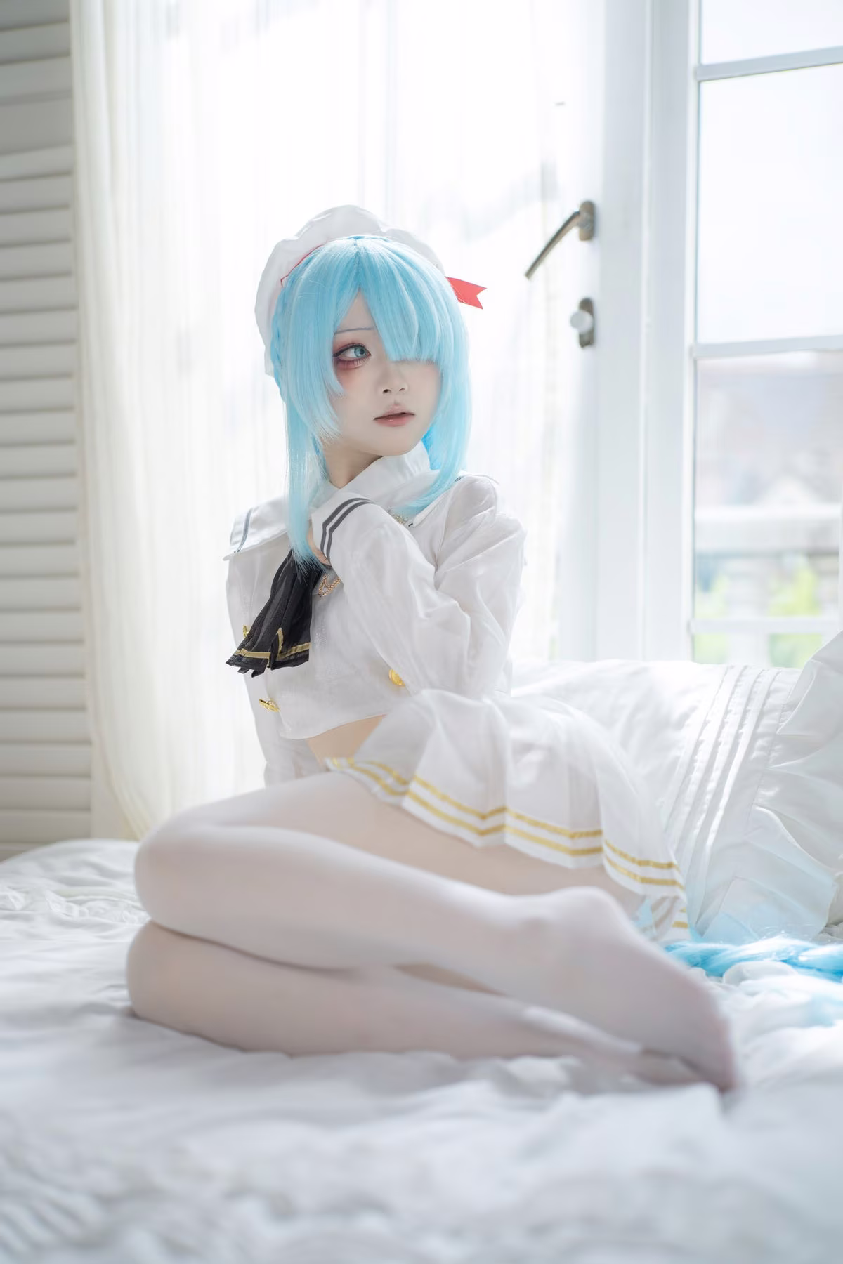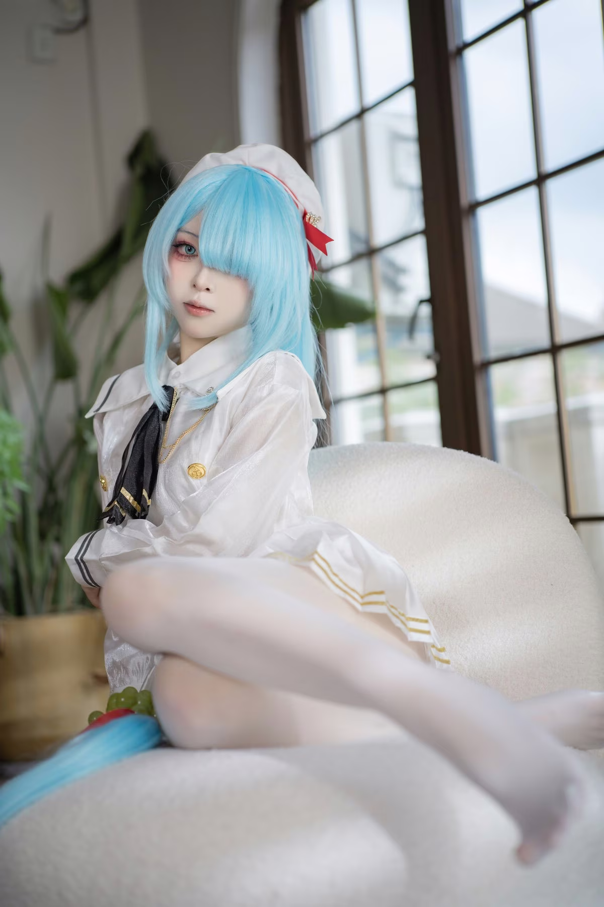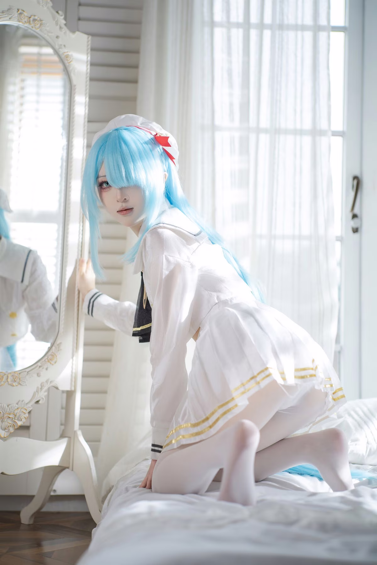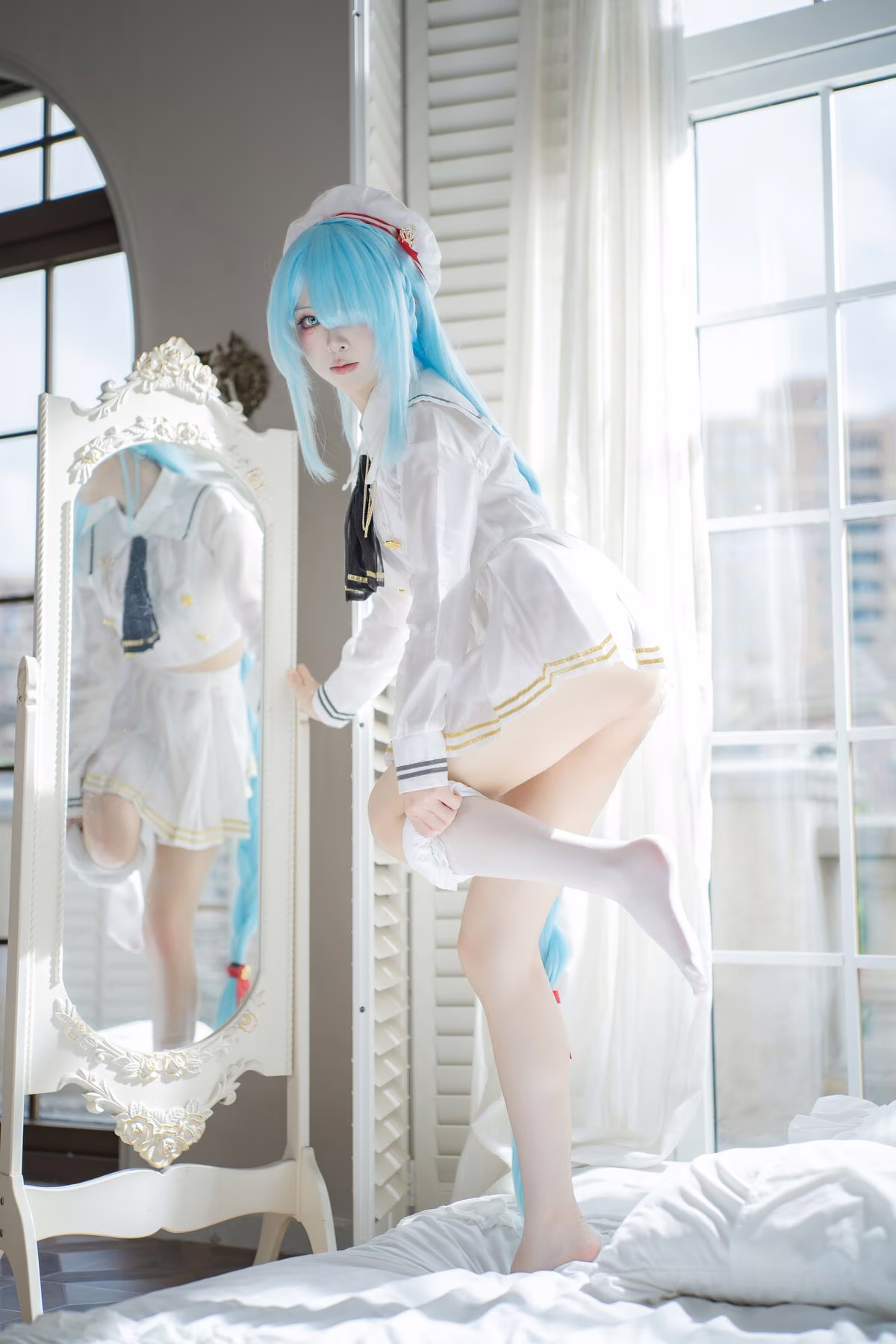 This stunning photo captures the graceful moment of coser Shi Liang Yu embodying the character in her Janus Sailor Uniform With striking blue hair and sharp eyes she exudes a pure and irresistible charm The reflection in the mirror creates a unique scene where the characters beauty is doubled both real and dreamlike The pristine white sailor uniform and adorable hat further highlight her elegance and innocence Coser Shi Liang Yu meticulously presented every detail from costume to expression delivering an impressive and vibrant cosplay transformation Viewers can feel her professionalism and passion for the art of cosplay through every line in the picture This is not just a beautiful photo but also a delicate cosplay artwork that captures every gaze