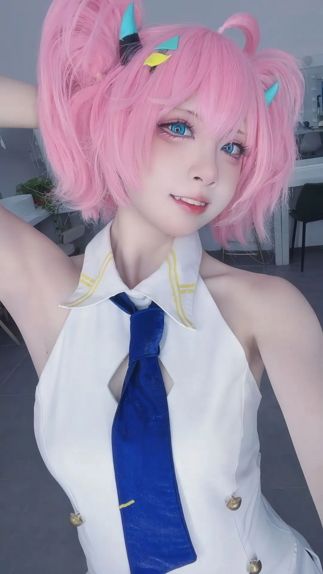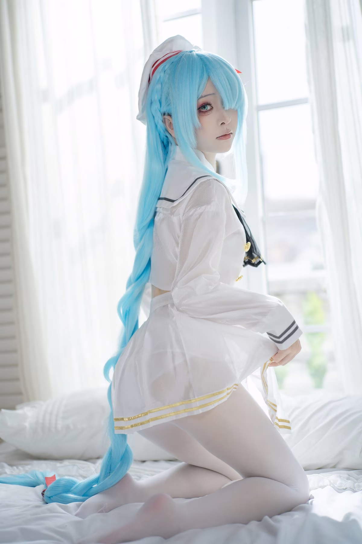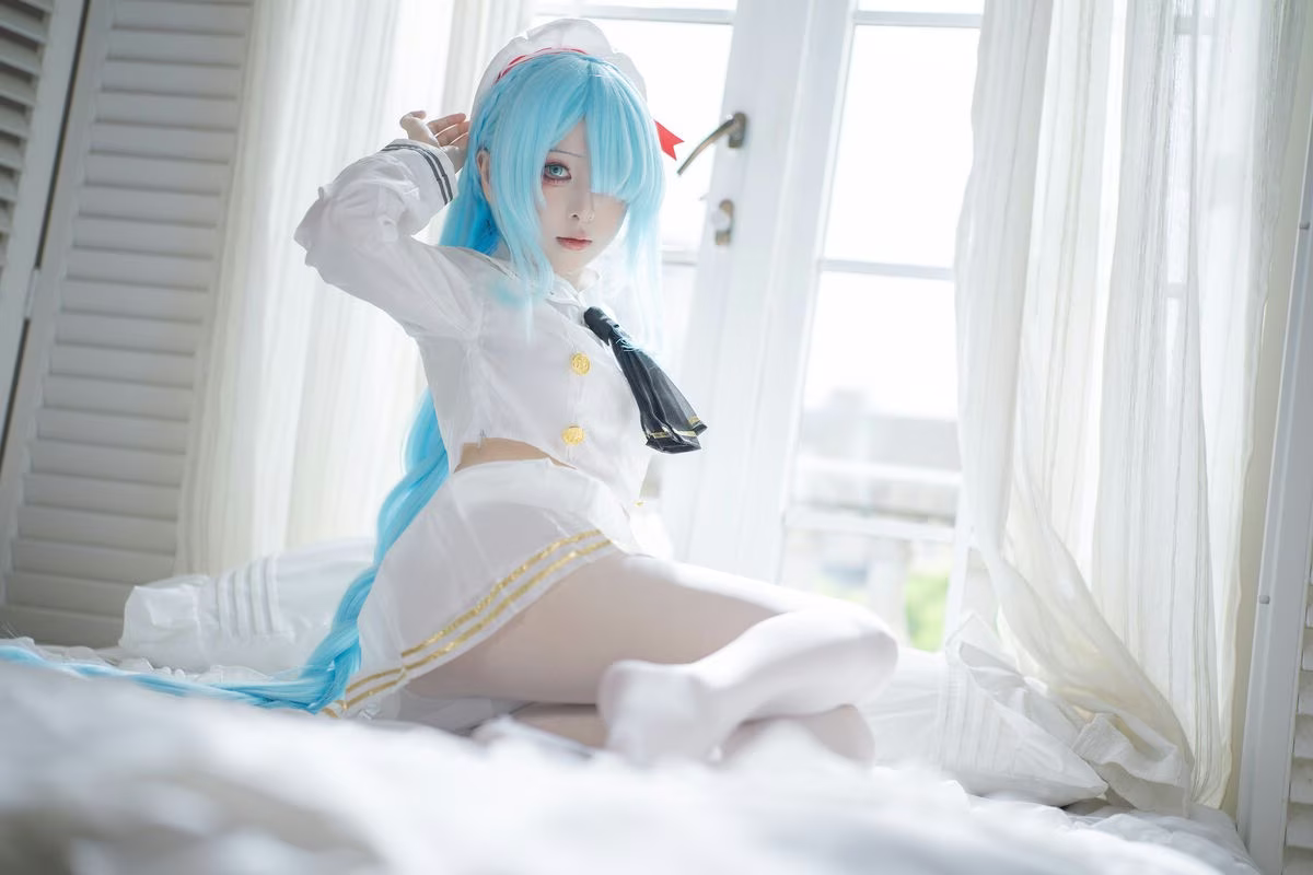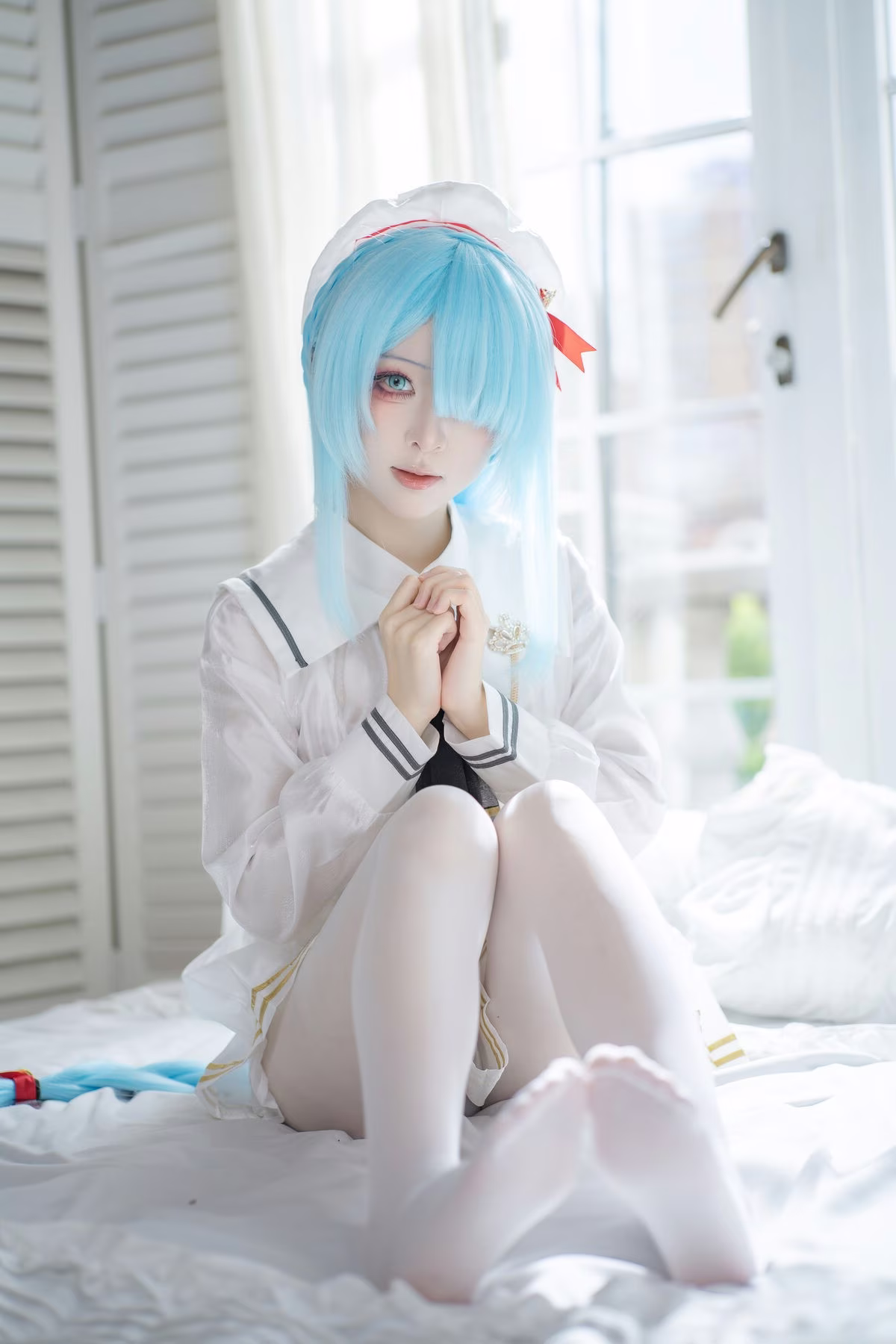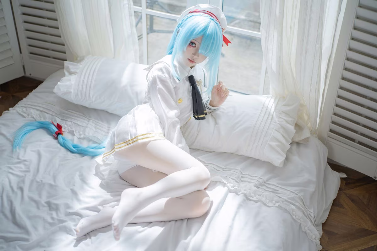 This stunning photo captures the graceful moment of coser Shi Liang Yu embodying the character in her Janus Sailor Uniform With striking blue hair and sharp eyes she exudes a pure and irresistible charm The reflection in the mirror creates a unique scene where the characters beauty is doubled both real and dreamlike The pristine white sailor uniform and adorable hat further highlight her elegance and innocence Coser Shi Liang Yu meticulously presented every detail from costume to expression delivering an impressive and vibrant cosplay transformation Viewers can feel her professionalism and passion for the art of cosplay through every line in the picture This is not just a beautiful photo but also a delicate cosplay artwork that captures every gaze