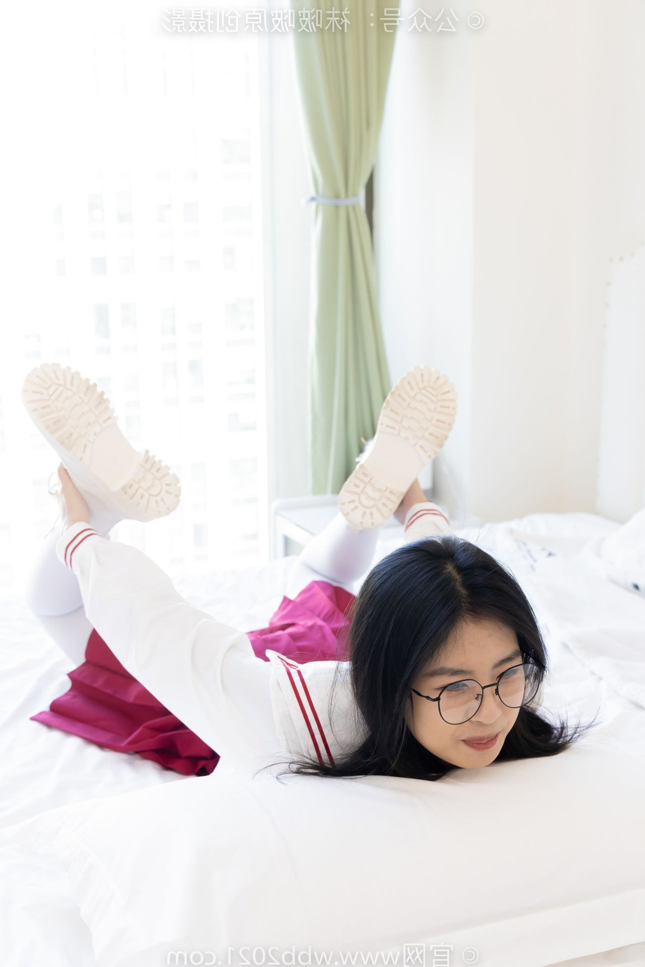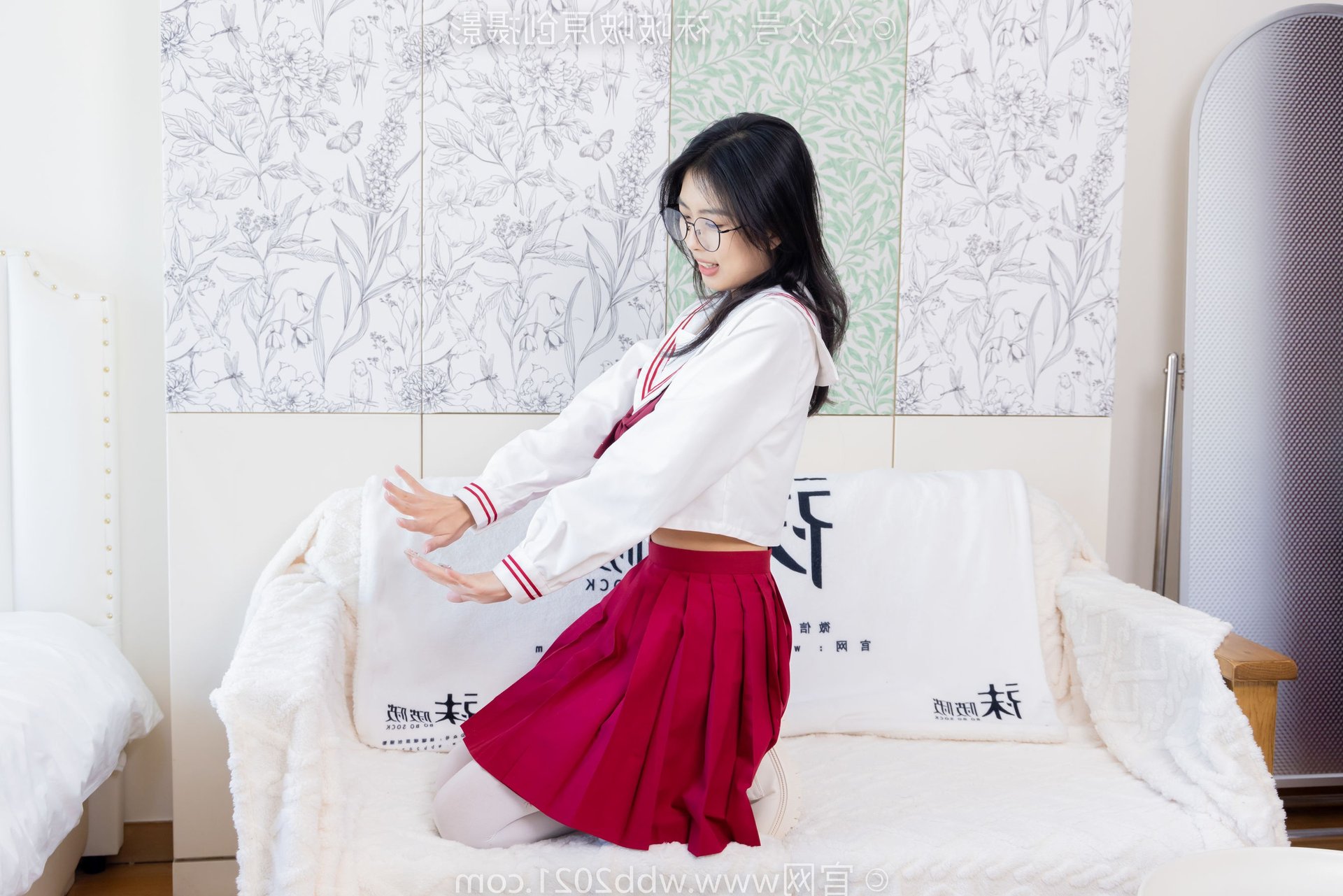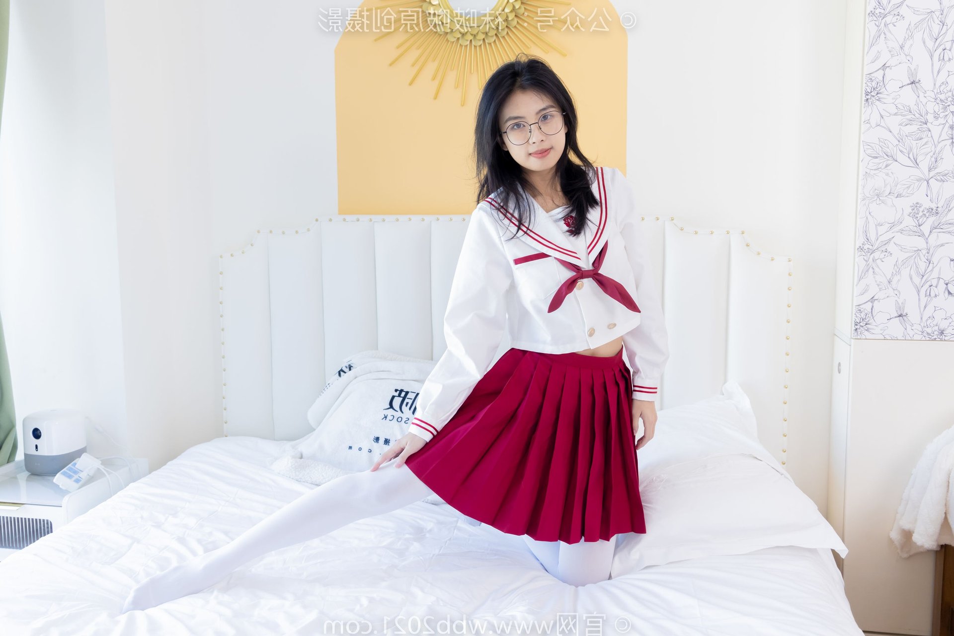 This vibrant image captures a young, energetic Chinese model from the BoBoSocks No.545 series. She is adorned in a classic JK uniform, featuring a pristine white sailor-collar top and a striking red pleated skirt, perfectly complemented by thick, pure white stockings. In a moment of pure exhilaration, she strikes a graceful jumping or balancing pose, embodying youthful confidence and joy. Her radiant smile and sparkling eyes behind her glasses further enhance her charming and vivacious appeal. This picture beautifully celebrates the innocent charm of a schoolgirl, evoking a sense of freedom and lightheartedness within her personal space.