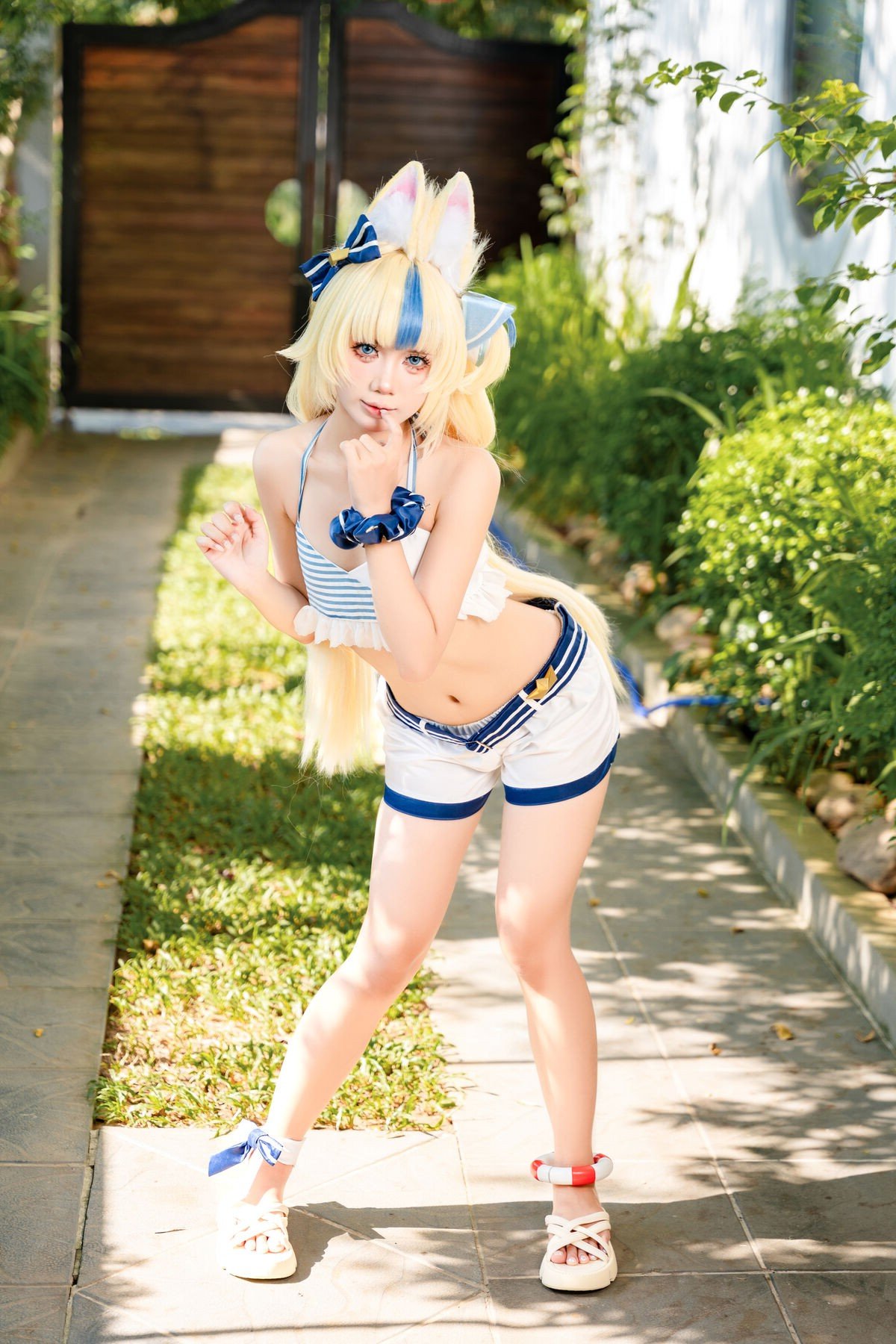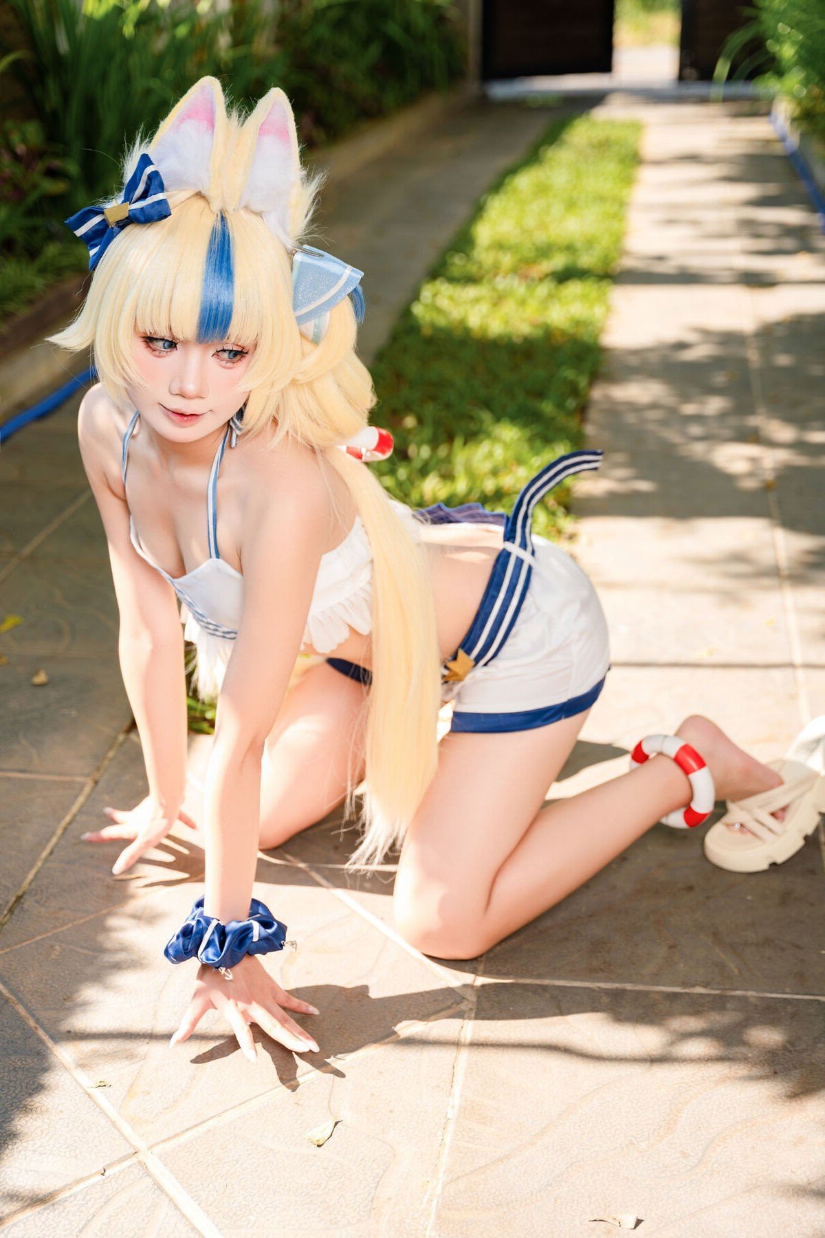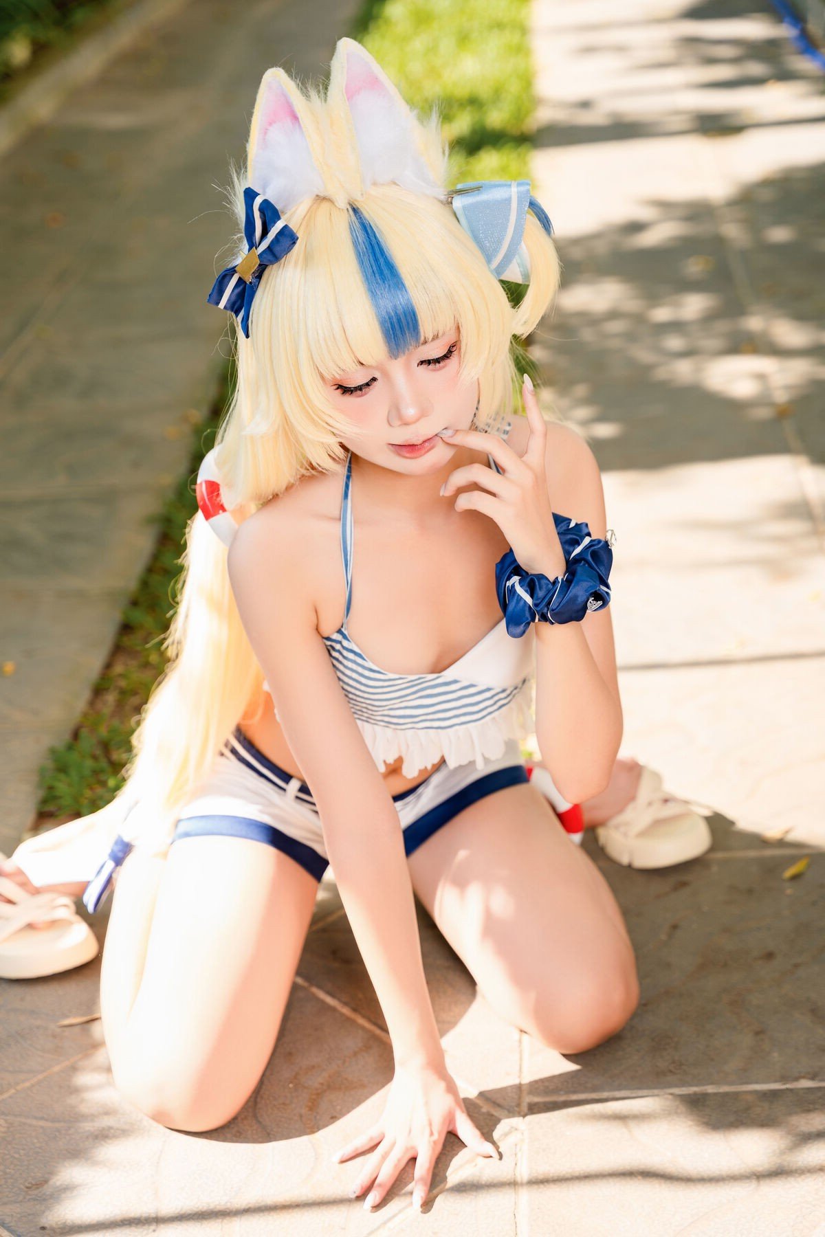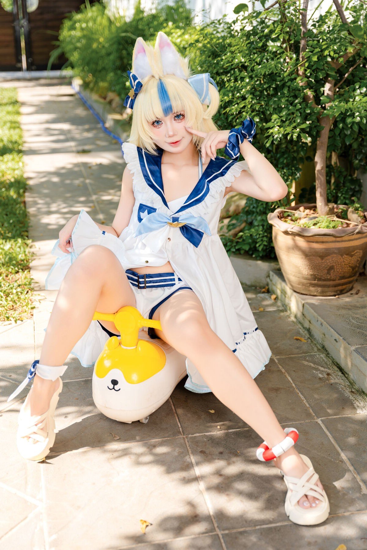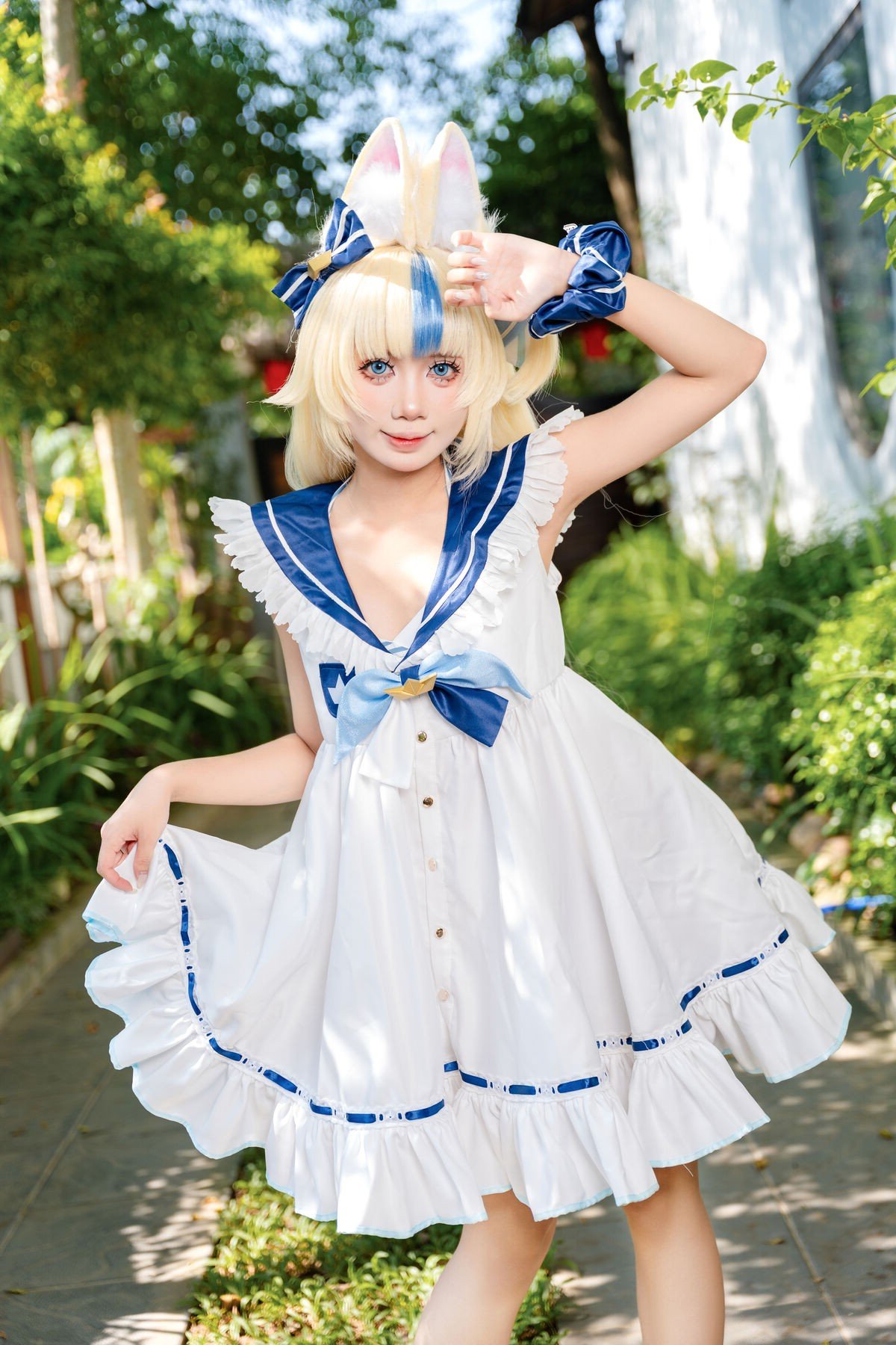 Coser PoppaChan brings Sameko Saba to life with an adorable and vibrant cosplay. Dressed in a meticulously detailed white and blue sailor outfit, complete with a prominent bow and sharp trim, she stands out beautifully against the lush green backdrop of the garden. Her blonde hair, adorned with charming animal ears and a blue ribbon, enhances the character's playful and cute essence. PoppaChan poses naturally while sitting on a yellow dog-shaped toy, her joyful gaze directed towards the viewer. The photograph radiates innocence and freshness, perfectly capturing the spirit of an energetic and captivating outdoor cosplay session. This impressive transformation is sure to delight fans and showcases a truly charming rendition of the character.