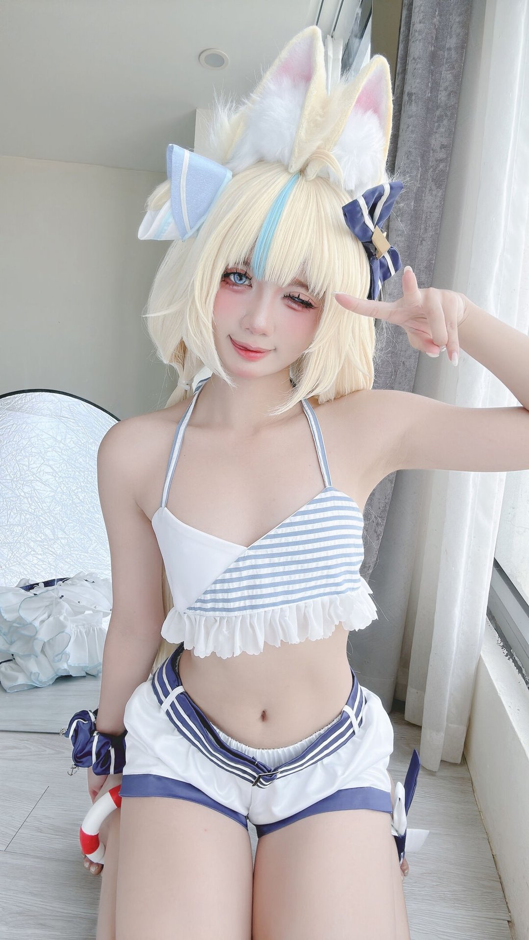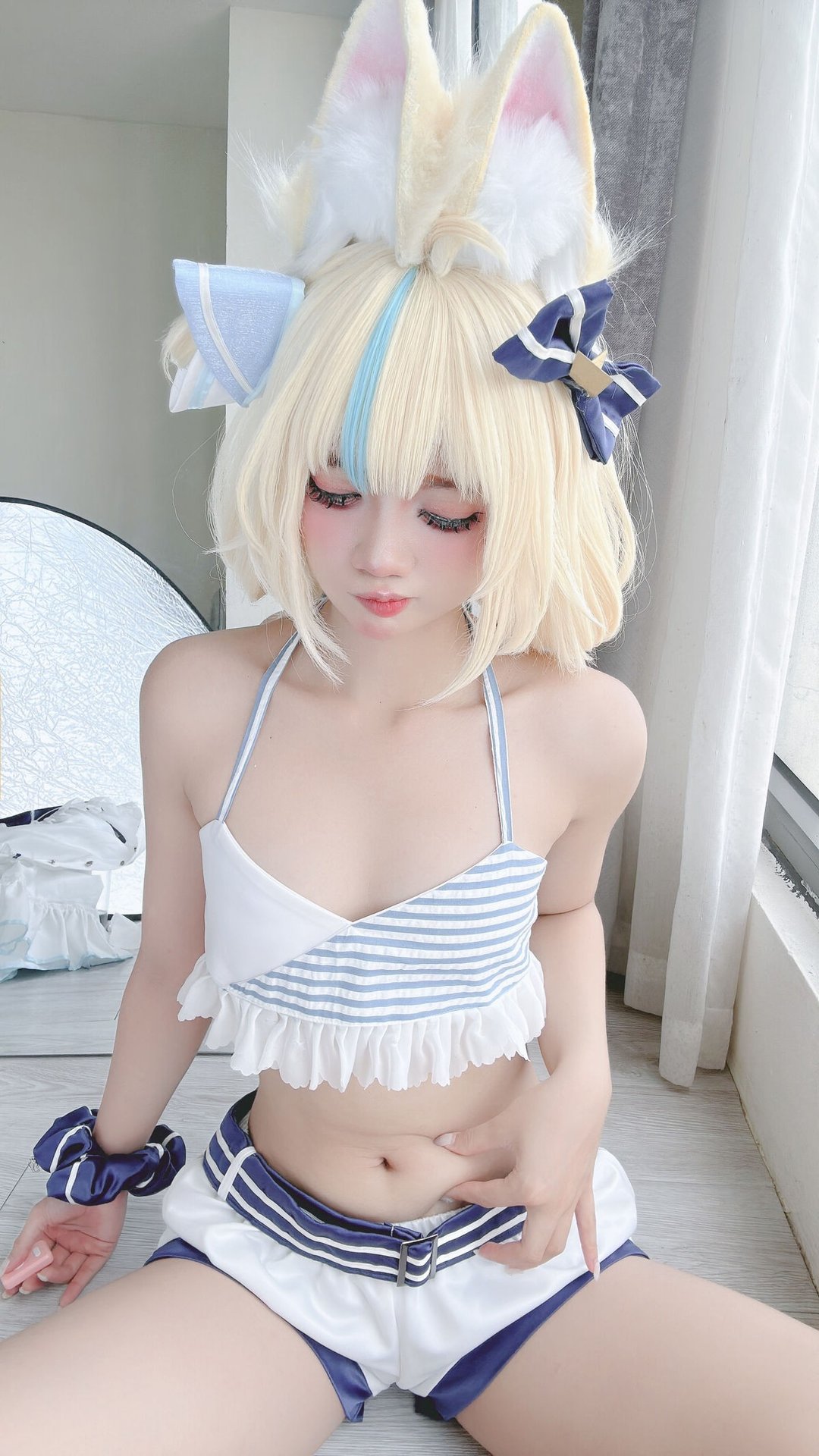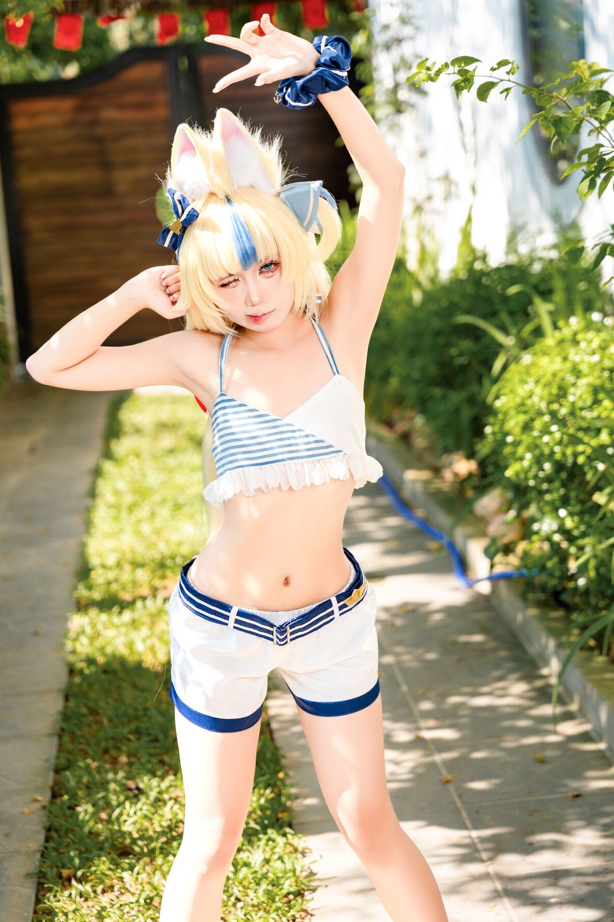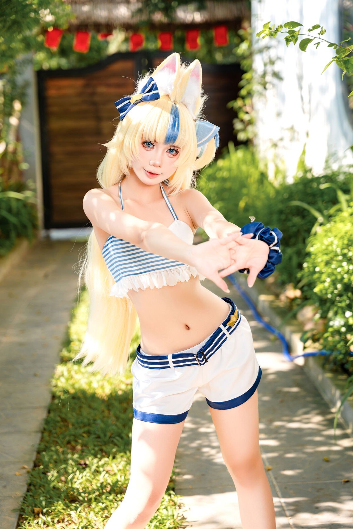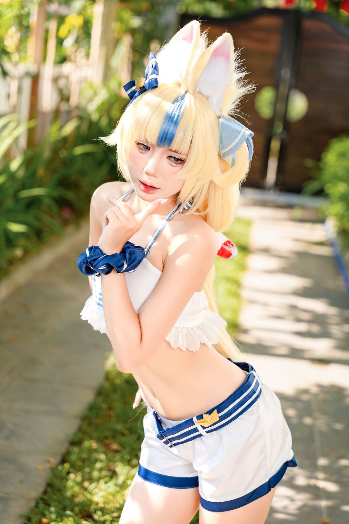 Coser PoppaChan brings Sameko Saba to life with an adorable and vibrant cosplay. Dressed in a meticulously detailed white and blue sailor outfit, complete with a prominent bow and sharp trim, she stands out beautifully against the lush green backdrop of the garden. Her blonde hair, adorned with charming animal ears and a blue ribbon, enhances the character's playful and cute essence. PoppaChan poses naturally while sitting on a yellow dog-shaped toy, her joyful gaze directed towards the viewer. The photograph radiates innocence and freshness, perfectly capturing the spirit of an energetic and captivating outdoor cosplay session. This impressive transformation is sure to delight fans and showcases a truly charming rendition of the character.
