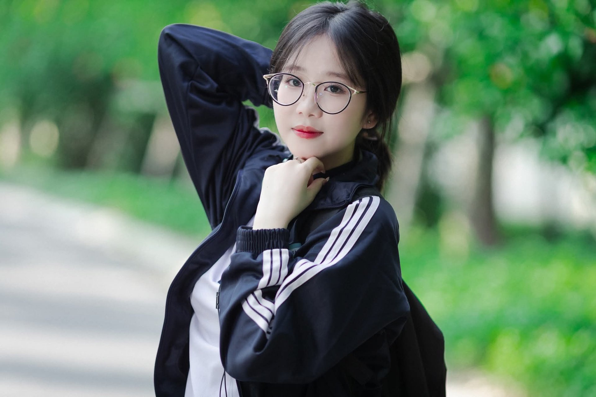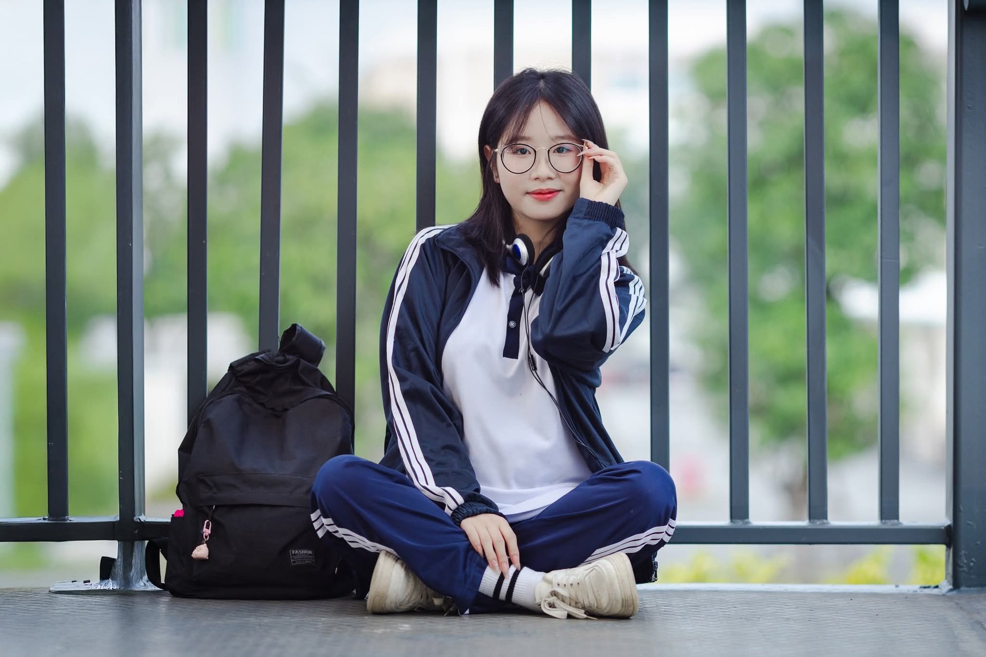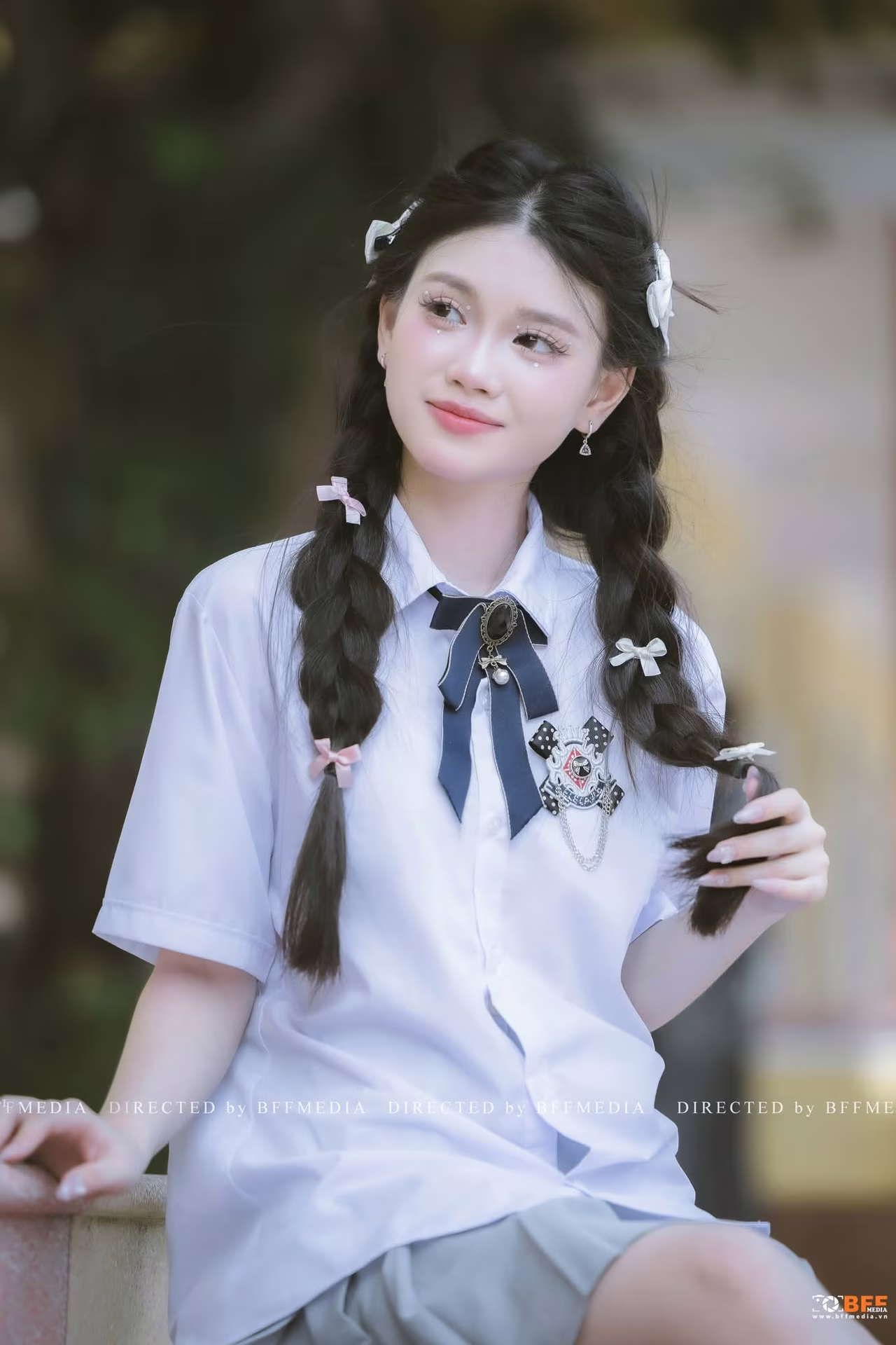 This photograph captures a serene and innocent moment of a female student in her familiar school uniform. The girl sits on an old stone bench under cool green trees, her braided hair neat, her gaze thoughtful yet radiating innocence and purity. Her pristine white shirt and gentle grey skirt create a familiar image of school age. Beside her is a light backpack and a book in her hand, evoking the image of a long day of study yet also full of dreams. This is not just a beautiful picture but also a reminder of beautiful youthful memories, of school dismissal afternoons, and of the simple dreams of student life.#VGU #Student #School #Uniform #Youth #SchoolLife